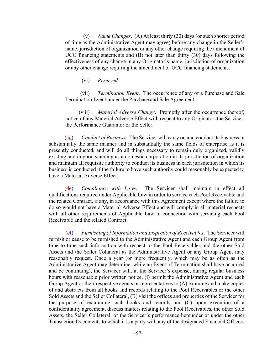 -57- (v) Name Changes. (A) At least thirty (30) days (or such shorter period of time as the Administrative Agent may agree) before any change in the Seller’s name, jurisdiction of organization or any other change requiring the amendment of UCC financing statements and (B) not later than thirty (30) days following the effectiveness of any change in any Originator’s name, jurisdiction of organization or any other change requiring the amendment of UCC financing statements. (vi) Reserved. (vii) Termination Event. The occurrence of any of a Purchase and Sale Termination Event under the Purchase and Sale Agreement. (viii) Material Adverse Change. Promptly after the occurrence thereof, notice of any Material Adverse Effect with respect to any Originator, the Servicer, the Performance Guarantor or the Seller. (cd) Conduct of Business. The Servicer will carry on and conduct its business in substantially the same manner and in substantially the same fields of enterprise as it is presently conducted, and will do all things necessary to remain duly organized, validly existing and in good standing as a domestic corporation in its jurisdiction of organization and maintain all requisite authority to conduct its business in each jurisdiction in which its business is conducted if the failure to have such authority could reasonably be expected to have a Material Adverse Effect. (de) Compliance with Laws. The Servicer shall maintain in effect all qualifications required under Applicable Law in order to service each Pool Receivable and the related Contract, if any, in accordance with this Agreement except where the failure to do so would not have a Material Adverse Effect and will comply in all material respects with all other requirements of Applicable Law in connection with servicing each Pool Receivable and the related Contract. (ef) Furnishing of Information and Inspection of Receivables. The Servicer will furnish or cause to be furnished to the Administrative Agent and each Group Agent from time to time such information with respect to the Pool Receivables and the other Sold Assets and the Seller Collateral as the Administrative Agent or any Group Agent may reasonably request. Once a year (or more frequently, which may be as often as the Administrative Agent may determine, while an Event of Termination shall have occurred and be continuing), the Servicer will, at the Servicer’s expense, during regular business hours with reasonable prior written notice, (i) permit the Administrative Agent and each Group Agent or their respective agents or representatives to (A) examine and make copies of and abstracts from all books and records relating to the Pool Receivables or the other Sold Assets and the Seller Collateral, (B) visit the offices and properties of the Servicer for the purpose of examining such books and records and (C) upon execution of a confidentiality agreement, discuss matters relating to the Pool Receivables, the other Sold Assets, the Seller Collateral, or the Servicer’s performance hereunder or under the other Transaction Documents to which it is a party with any of the designated Financial Officers