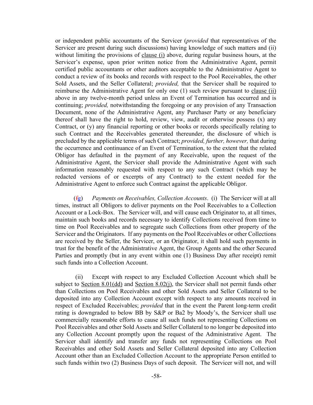-58- or independent public accountants of the Servicer (provided that representatives of the Servicer are present during such discussions) having knowledge of such matters and (ii) without limiting the provisions of clause (i) above, during regular business hours, at the Servicer’s expense, upon prior written notice from the Administrative Agent, permit certified public accountants or other auditors acceptable to the Administrative Agent to conduct a review of its books and records with respect to the Pool Receivables, the other Sold Assets, and the Seller Collateral; provided, that the Servicer shall be required to reimburse the Administrative Agent for only one (1) such review pursuant to clause (ii) above in any twelve-month period unless an Event of Termination has occurred and is continuing; provided, notwithstanding the foregoing or any provision of any Transaction Document, none of the Administrative Agent, any Purchaser Party or any beneficiary thereof shall have the right to hold, review, view, audit or otherwise possess (x) any Contract, or (y) any financial reporting or other books or records specifically relating to such Contract and the Receivables generated thereunder, the disclosure of which is precluded by the applicable terms of such Contract; provided, further, however, that during the occurrence and continuance of an Event of Termination, to the extent that the related Obligor has defaulted in the payment of any Receivable, upon the request of the Administrative Agent, the Servicer shall provide the Administrative Agent with such information reasonably requested with respect to any such Contract (which may be redacted versions of or excerpts of any Contract) to the extent needed for the Administrative Agent to enforce such Contract against the applicable Obligor. (fg) Payments on Receivables, Collection Accounts. (i) The Servicer will at all times, instruct all Obligors to deliver payments on the Pool Receivables to a Collection Account or a Lock-Box. The Servicer will, and will cause each Originator to, at all times, maintain such books and records necessary to identify Collections received from time to time on Pool Receivables and to segregate such Collections from other property of the Servicer and the Originators. If any payments on the Pool Receivables or other Collections are received by the Seller, the Servicer, or an Originator, it shall hold such payments in trust for the benefit of the Administrative Agent, the Group Agents and the other Secured Parties and promptly (but in any event within one (1) Business Day after receipt) remit such funds into a Collection Account. (ii) Except with respect to any Excluded Collection Account which shall be subject to Section 8.01(dd) and Section 8.02(j), the Servicer shall not permit funds other than Collections on Pool Receivables and other Sold Assets and Seller Collateral to be deposited into any Collection Account except with respect to any amounts received in respect of Excluded Receivables; provided that in the event the Parent long-term credit rating is downgraded to below BB by S&P or Ba2 by Moody’s, the Servicer shall use commercially reasonable efforts to cause all such funds not representing Collections on Pool Receivables and other Sold Assets and Seller Collateral to no longer be deposited into any Collection Account promptly upon the request of the Administrative Agent. The Servicer shall identify and transfer any funds not representing Collections on Pool Receivables and other Sold Assets and Seller Collateral deposited into any Collection Account other than an Excluded Collection Account to the appropriate Person entitled to such funds within two (2) Business Days of such deposit. The Servicer will not, and will