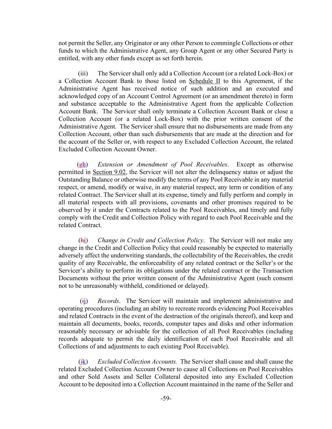 -59- not permit the Seller, any Originator or any other Person to commingle Collections or other funds to which the Administrative Agent, any Group Agent or any other Secured Party is entitled, with any other funds except as set forth herein. (iii) The Servicer shall only add a Collection Account (or a related Lock-Box) or a Collection Account Bank to those listed on Schedule II to this Agreement, if the Administrative Agent has received notice of such addition and an executed and acknowledged copy of an Account Control Agreement (or an amendment thereto) in form and substance acceptable to the Administrative Agent from the applicable Collection Account Bank. The Servicer shall only terminate a Collection Account Bank or close a Collection Account (or a related Lock-Box) with the prior written consent of the Administrative Agent. The Servicer shall ensure that no disbursements are made from any Collection Account, other than such disbursements that are made at the direction and for the account of the Seller or, with respect to any Excluded Collection Account, the related Excluded Collection Account Owner. (gh) Extension or Amendment of Pool Receivables. Except as otherwise permitted in Section 9.02, the Servicer will not alter the delinquency status or adjust the Outstanding Balance or otherwise modify the terms of any Pool Receivable in any material respect, or amend, modify or waive, in any material respect, any term or condition of any related Contract. The Servicer shall at its expense, timely and fully perform and comply in all material respects with all provisions, covenants and other promises required to be observed by it under the Contracts related to the Pool Receivables, and timely and fully comply with the Credit and Collection Policy with regard to each Pool Receivable and the related Contract. (hi) Change in Credit and Collection Policy. The Servicer will not make any change in the Credit and Collection Policy that could reasonably be expected to materially adversely affect the underwriting standards, the collectability of the Receivables, the credit quality of any Receivable, the enforceability of any related contract or the Seller’s or the Servicer’s ability to perform its obligations under the related contract or the Transaction Documents without the prior written consent of the Administrative Agent (such consent not to be unreasonably withheld, conditioned or delayed). (ij) Records. The Servicer will maintain and implement administrative and operating procedures (including an ability to recreate records evidencing Pool Receivables and related Contracts in the event of the destruction of the originals thereof), and keep and maintain all documents, books, records, computer tapes and disks and other information reasonably necessary or advisable for the collection of all Pool Receivables (including records adequate to permit the daily identification of each Pool Receivable and all Collections of and adjustments to each existing Pool Receivable). (jk) Excluded Collection Accounts. The Servicer shall cause and shall cause the related Excluded Collection Account Owner to cause all Collections on Pool Receivables and other Sold Assets and Seller Collateral deposited into any Excluded Collection Account to be deposited into a Collection Account maintained in the name of the Seller and