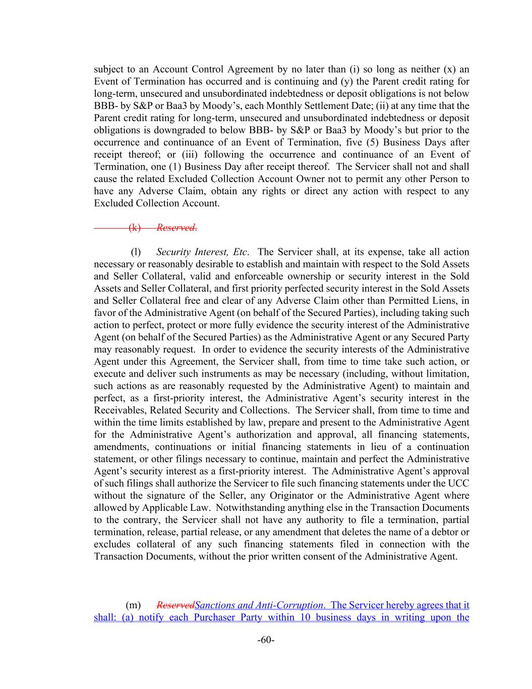 -60- subject to an Account Control Agreement by no later than (i) so long as neither (x) an Event of Termination has occurred and is continuing and (y) the Parent credit rating for long-term, unsecured and unsubordinated indebtedness or deposit obligations is not below BBB- by S&P or Baa3 by Moody’s, each Monthly Settlement Date; (ii) at any time that the Parent credit rating for long-term, unsecured and unsubordinated indebtedness or deposit obligations is downgraded to below BBB- by S&P or Baa3 by Moody’s but prior to the occurrence and continuance of an Event of Termination, five (5) Business Days after receipt thereof; or (iii) following the occurrence and continuance of an Event of Termination, one (1) Business Day after receipt thereof. The Servicer shall not and shall cause the related Excluded Collection Account Owner not to permit any other Person to have any Adverse Claim, obtain any rights or direct any action with respect to any Excluded Collection Account. (k) Reserved. (l) Security Interest, Etc. The Servicer shall, at its expense, take all action necessary or reasonably desirable to establish and maintain with respect to the Sold Assets and Seller Collateral, valid and enforceable ownership or security interest in the Sold Assets and Seller Collateral, and first priority perfected security interest in the Sold Assets and Seller Collateral free and clear of any Adverse Claim other than Permitted Liens, in favor of the Administrative Agent (on behalf of the Secured Parties), including taking such action to perfect, protect or more fully evidence the security interest of the Administrative Agent (on behalf of the Secured Parties) as the Administrative Agent or any Secured Party may reasonably request. In order to evidence the security interests of the Administrative Agent under this Agreement, the Servicer shall, from time to time take such action, or execute and deliver such instruments as may be necessary (including, without limitation, such actions as are reasonably requested by the Administrative Agent) to maintain and perfect, as a first-priority interest, the Administrative Agent’s security interest in the Receivables, Related Security and Collections. The Servicer shall, from time to time and within the time limits established by law, prepare and present to the Administrative Agent for the Administrative Agent’s authorization and approval, all financing statements, amendments, continuations or initial financing statements in lieu of a continuation statement, or other filings necessary to continue, maintain and perfect the Administrative Agent’s security interest as a first-priority interest. The Administrative Agent’s approval of such filings shall authorize the Servicer to file such financing statements under the UCC without the signature of the Seller, any Originator or the Administrative Agent where allowed by Applicable Law. Notwithstanding anything else in the Transaction Documents to the contrary, the Servicer shall not have any authority to file a termination, partial termination, release, partial release, or any amendment that deletes the name of a debtor or excludes collateral of any such financing statements filed in connection with the Transaction Documents, without the prior written consent of the Administrative Agent. (m) ReservedSanctions and Anti-Corruption. The Servicer hereby agrees that it shall: (a) notify each Purchaser Party within 10 business days in writing upon the