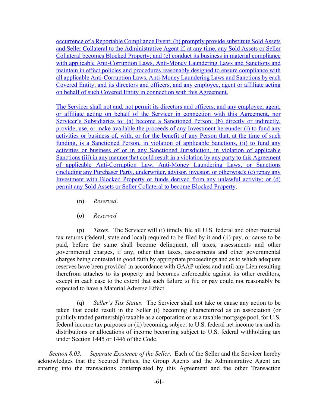 -61- occurrence of a Reportable Compliance Event; (b) promptly provide substitute Sold Assets and Seller Collateral to the Administrative Agent if, at any time, any Sold Assets or Seller Collateral becomes Blocked Property; and (c) conduct its business in material compliance with applicable Anti-Corruption Laws, Anti-Money Laundering Laws and Sanctions and maintain in effect policies and procedures reasonably designed to ensure compliance with all applicable Anti-Corruption Laws, Anti-Money Laundering Laws and Sanctions by each Covered Entity, and its directors and officers, and any employee, agent or affiliate acting on behalf of such Covered Entity in connection with this Agreement. The Servicer shall not and, not permit its directors and officers, and any employee, agent, or affiliate acting on behalf of the Servicer in connection with this Agreement, nor Servicer’s Subsidiaries to: (a) become a Sanctioned Person; (b) directly or indirectly, provide, use, or make available the proceeds of any Investment hereunder (i) to fund any activities or business of, with, or for the benefit of any Person that, at the time of such funding, is a Sanctioned Person, in violation of applicable Sanctions, (ii) to fund any activities or business of or in any Sanctioned Jurisdiction, in violation of applicable Sanctions (iii) in any manner that could result in a violation by any party to this Agreement of applicable Anti-Corruption Law, Anti-Money Laundering Laws, or Sanctions (including any Purchaser Party, underwriter, advisor, investor, or otherwise); (c) repay any Investment with Blocked Property or funds derived from any unlawful activity; or (d) permit any Sold Assets or Seller Collateral to become Blocked Property. (n) Reserved. (o) Reserved. (p) Taxes. The Servicer will (i) timely file all U.S. federal and other material tax returns (federal, state and local) required to be filed by it and (ii) pay, or cause to be paid, before the same shall become delinquent, all taxes, assessments and other governmental charges, if any, other than taxes, assessments and other governmental charges being contested in good faith by appropriate proceedings and as to which adequate reserves have been provided in accordance with GAAP unless and until any Lien resulting therefrom attaches to its property and becomes enforceable against its other creditors, except in each case to the extent that such failure to file or pay could not reasonably be expected to have a Material Adverse Effect. (q) Seller’s Tax Status. The Servicer shall not take or cause any action to be taken that could result in the Seller (i) becoming characterized as an association (or publicly traded partnership) taxable as a corporation or as a taxable mortgage pool, for U.S. federal income tax purposes or (ii) becoming subject to U.S. federal net income tax and its distributions or allocations of income becoming subject to U.S. federal withholding tax under Section 1445 or 1446 of the Code. Section 8.03. Separate Existence of the Seller. Each of the Seller and the Servicer hereby acknowledges that the Secured Parties, the Group Agents and the Administrative Agent are entering into the transactions contemplated by this Agreement and the other Transaction
