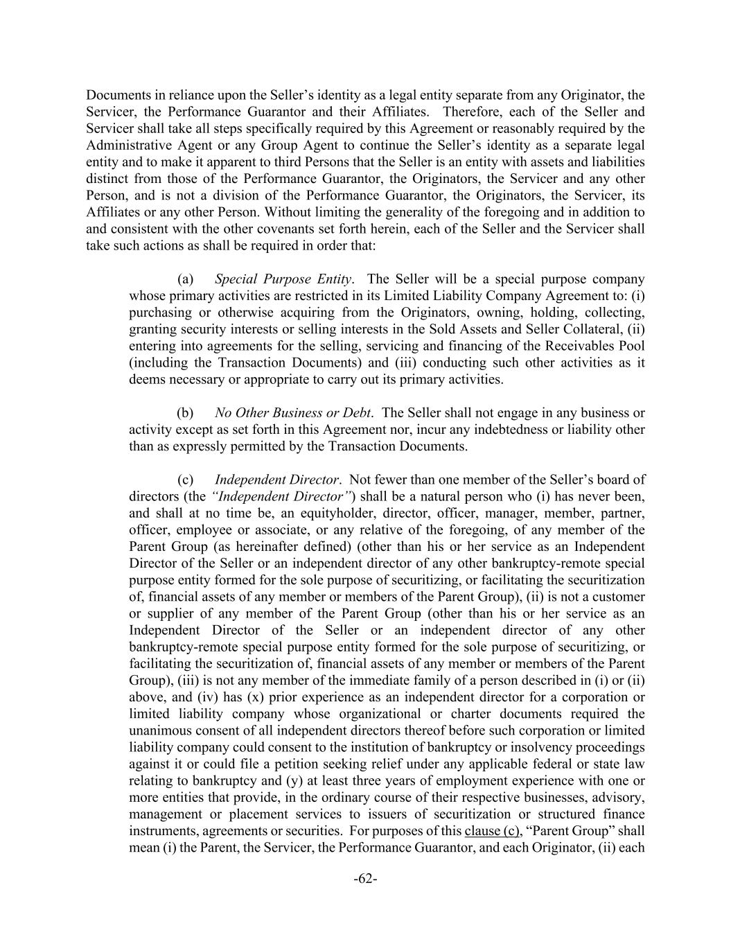 -62- Documents in reliance upon the Seller’s identity as a legal entity separate from any Originator, the Servicer, the Performance Guarantor and their Affiliates. Therefore, each of the Seller and Servicer shall take all steps specifically required by this Agreement or reasonably required by the Administrative Agent or any Group Agent to continue the Seller’s identity as a separate legal entity and to make it apparent to third Persons that the Seller is an entity with assets and liabilities distinct from those of the Performance Guarantor, the Originators, the Servicer and any other Person, and is not a division of the Performance Guarantor, the Originators, the Servicer, its Affiliates or any other Person. Without limiting the generality of the foregoing and in addition to and consistent with the other covenants set forth herein, each of the Seller and the Servicer shall take such actions as shall be required in order that: (a) Special Purpose Entity. The Seller will be a special purpose company whose primary activities are restricted in its Limited Liability Company Agreement to: (i) purchasing or otherwise acquiring from the Originators, owning, holding, collecting, granting security interests or selling interests in the Sold Assets and Seller Collateral, (ii) entering into agreements for the selling, servicing and financing of the Receivables Pool (including the Transaction Documents) and (iii) conducting such other activities as it deems necessary or appropriate to carry out its primary activities. (b) No Other Business or Debt. The Seller shall not engage in any business or activity except as set forth in this Agreement nor, incur any indebtedness or liability other than as expressly permitted by the Transaction Documents. (c) Independent Director. Not fewer than one member of the Seller’s board of directors (the “Independent Director”) shall be a natural person who (i) has never been, and shall at no time be, an equityholder, director, officer, manager, member, partner, officer, employee or associate, or any relative of the foregoing, of any member of the Parent Group (as hereinafter defined) (other than his or her service as an Independent Director of the Seller or an independent director of any other bankruptcy-remote special purpose entity formed for the sole purpose of securitizing, or facilitating the securitization of, financial assets of any member or members of the Parent Group), (ii) is not a customer or supplier of any member of the Parent Group (other than his or her service as an Independent Director of the Seller or an independent director of any other bankruptcy-remote special purpose entity formed for the sole purpose of securitizing, or facilitating the securitization of, financial assets of any member or members of the Parent Group), (iii) is not any member of the immediate family of a person described in (i) or (ii) above, and (iv) has (x) prior experience as an independent director for a corporation or limited liability company whose organizational or charter documents required the unanimous consent of all independent directors thereof before such corporation or limited liability company could consent to the institution of bankruptcy or insolvency proceedings against it or could file a petition seeking relief under any applicable federal or state law relating to bankruptcy and (y) at least three years of employment experience with one or more entities that provide, in the ordinary course of their respective businesses, advisory, management or placement services to issuers of securitization or structured finance instruments, agreements or securities. For purposes of this clause (c), “Parent Group” shall mean (i) the Parent, the Servicer, the Performance Guarantor, and each Originator, (ii) each