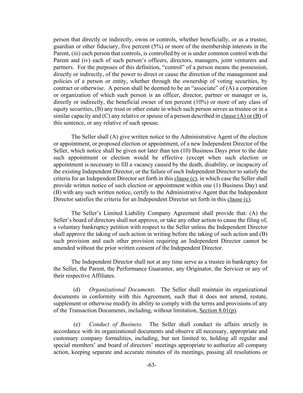 -63- person that directly or indirectly, owns or controls, whether beneficially, or as a trustee, guardian or other fiduciary, five percent (5%) or more of the membership interests in the Parent, (iii) each person that controls, is controlled by or is under common control with the Parent and (iv) each of such person’s officers, directors, managers, joint venturers and partners. For the purposes of this definition, “control” of a person means the possession, directly or indirectly, of the power to direct or cause the direction of the management and policies of a person or entity, whether through the ownership of voting securities, by contract or otherwise. A person shall be deemed to be an “associate” of (A) a corporation or organization of which such person is an officer, director, partner or manager or is, directly or indirectly, the beneficial owner of ten percent (10%) or more of any class of equity securities, (B) any trust or other estate in which such person serves as trustee or in a similar capacity and (C) any relative or spouse of a person described in clause (A) or (B) of this sentence, or any relative of such spouse. The Seller shall (A) give written notice to the Administrative Agent of the election or appointment, or proposed election or appointment, of a new Independent Director of the Seller, which notice shall be given not later than ten (10) Business Days prior to the date such appointment or election would be effective (except when such election or appointment is necessary to fill a vacancy caused by the death, disability, or incapacity of the existing Independent Director, or the failure of such Independent Director to satisfy the criteria for an Independent Director set forth in this clause (c), in which case the Seller shall provide written notice of such election or appointment within one (1) Business Day) and (B) with any such written notice, certify to the Administrative Agent that the Independent Director satisfies the criteria for an Independent Director set forth in this clause (c). The Seller’s Limited Liability Company Agreement shall provide that: (A) the Seller’s board of directors shall not approve, or take any other action to cause the filing of, a voluntary bankruptcy petition with respect to the Seller unless the Independent Director shall approve the taking of such action in writing before the taking of such action and (B) such provision and each other provision requiring an Independent Director cannot be amended without the prior written consent of the Independent Director. The Independent Director shall not at any time serve as a trustee in bankruptcy for the Seller, the Parent, the Performance Guarantor, any Originator, the Servicer or any of their respective Affiliates. (d) Organizational Documents. The Seller shall maintain its organizational documents in conformity with this Agreement, such that it does not amend, restate, supplement or otherwise modify its ability to comply with the terms and provisions of any of the Transaction Documents, including, without limitation, Section 8.01(p). (e) Conduct of Business. The Seller shall conduct its affairs strictly in accordance with its organizational documents and observe all necessary, appropriate and customary company formalities, including, but not limited to, holding all regular and special members’ and board of directors’ meetings appropriate to authorize all company action, keeping separate and accurate minutes of its meetings, passing all resolutions or