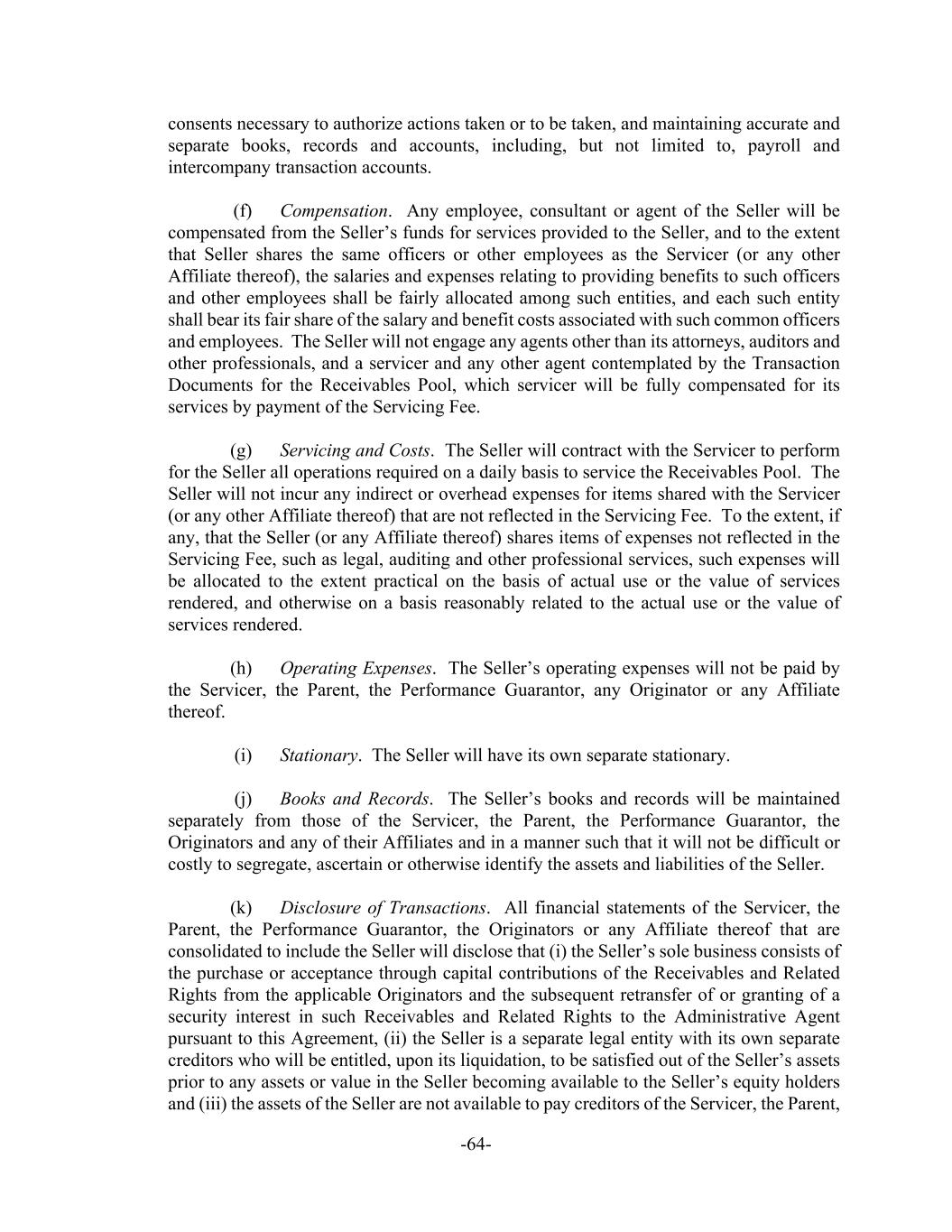 -64- consents necessary to authorize actions taken or to be taken, and maintaining accurate and separate books, records and accounts, including, but not limited to, payroll and intercompany transaction accounts. (f) Compensation. Any employee, consultant or agent of the Seller will be compensated from the Seller’s funds for services provided to the Seller, and to the extent that Seller shares the same officers or other employees as the Servicer (or any other Affiliate thereof), the salaries and expenses relating to providing benefits to such officers and other employees shall be fairly allocated among such entities, and each such entity shall bear its fair share of the salary and benefit costs associated with such common officers and employees. The Seller will not engage any agents other than its attorneys, auditors and other professionals, and a servicer and any other agent contemplated by the Transaction Documents for the Receivables Pool, which servicer will be fully compensated for its services by payment of the Servicing Fee. (g) Servicing and Costs. The Seller will contract with the Servicer to perform for the Seller all operations required on a daily basis to service the Receivables Pool. The Seller will not incur any indirect or overhead expenses for items shared with the Servicer (or any other Affiliate thereof) that are not reflected in the Servicing Fee. To the extent, if any, that the Seller (or any Affiliate thereof) shares items of expenses not reflected in the Servicing Fee, such as legal, auditing and other professional services, such expenses will be allocated to the extent practical on the basis of actual use or the value of services rendered, and otherwise on a basis reasonably related to the actual use or the value of services rendered. (h) Operating Expenses. The Seller’s operating expenses will not be paid by the Servicer, the Parent, the Performance Guarantor, any Originator or any Affiliate thereof. (i) Stationary. The Seller will have its own separate stationary. (j) Books and Records. The Seller’s books and records will be maintained separately from those of the Servicer, the Parent, the Performance Guarantor, the Originators and any of their Affiliates and in a manner such that it will not be difficult or costly to segregate, ascertain or otherwise identify the assets and liabilities of the Seller. (k) Disclosure of Transactions. All financial statements of the Servicer, the Parent, the Performance Guarantor, the Originators or any Affiliate thereof that are consolidated to include the Seller will disclose that (i) the Seller’s sole business consists of the purchase or acceptance through capital contributions of the Receivables and Related Rights from the applicable Originators and the subsequent retransfer of or granting of a security interest in such Receivables and Related Rights to the Administrative Agent pursuant to this Agreement, (ii) the Seller is a separate legal entity with its own separate creditors who will be entitled, upon its liquidation, to be satisfied out of the Seller’s assets prior to any assets or value in the Seller becoming available to the Seller’s equity holders and (iii) the assets of the Seller are not available to pay creditors of the Servicer, the Parent,
