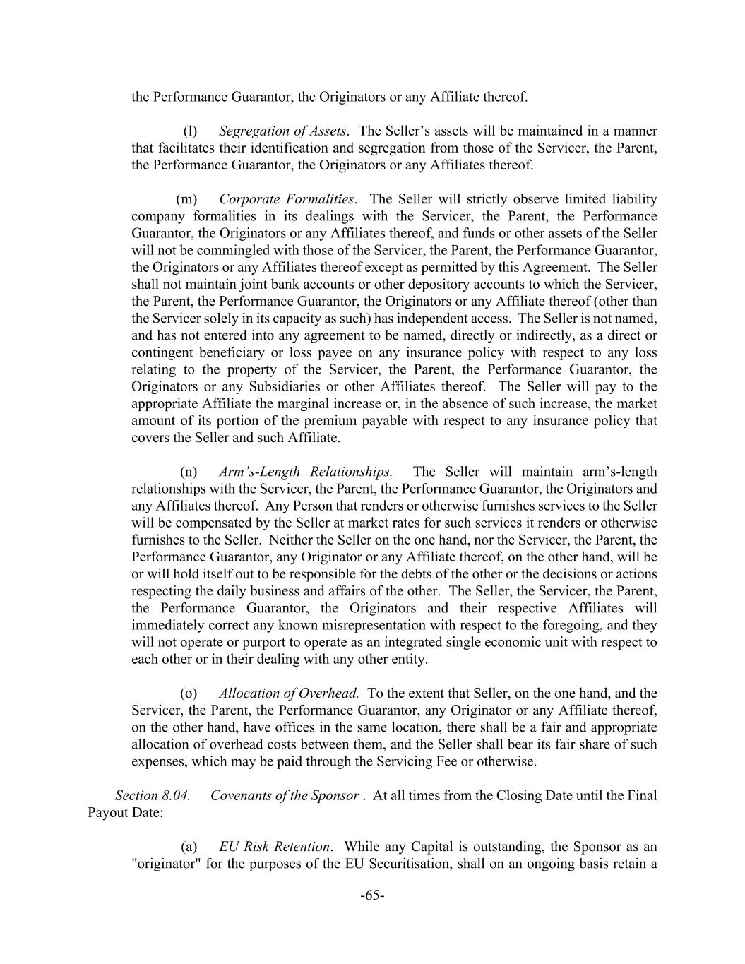 -65- the Performance Guarantor, the Originators or any Affiliate thereof. (l) Segregation of Assets. The Seller’s assets will be maintained in a manner that facilitates their identification and segregation from those of the Servicer, the Parent, the Performance Guarantor, the Originators or any Affiliates thereof. (m) Corporate Formalities. The Seller will strictly observe limited liability company formalities in its dealings with the Servicer, the Parent, the Performance Guarantor, the Originators or any Affiliates thereof, and funds or other assets of the Seller will not be commingled with those of the Servicer, the Parent, the Performance Guarantor, the Originators or any Affiliates thereof except as permitted by this Agreement. The Seller shall not maintain joint bank accounts or other depository accounts to which the Servicer, the Parent, the Performance Guarantor, the Originators or any Affiliate thereof (other than the Servicer solely in its capacity as such) has independent access. The Seller is not named, and has not entered into any agreement to be named, directly or indirectly, as a direct or contingent beneficiary or loss payee on any insurance policy with respect to any loss relating to the property of the Servicer, the Parent, the Performance Guarantor, the Originators or any Subsidiaries or other Affiliates thereof. The Seller will pay to the appropriate Affiliate the marginal increase or, in the absence of such increase, the market amount of its portion of the premium payable with respect to any insurance policy that covers the Seller and such Affiliate. (n) Arm’s-Length Relationships. The Seller will maintain arm’s-length relationships with the Servicer, the Parent, the Performance Guarantor, the Originators and any Affiliates thereof. Any Person that renders or otherwise furnishes services to the Seller will be compensated by the Seller at market rates for such services it renders or otherwise furnishes to the Seller. Neither the Seller on the one hand, nor the Servicer, the Parent, the Performance Guarantor, any Originator or any Affiliate thereof, on the other hand, will be or will hold itself out to be responsible for the debts of the other or the decisions or actions respecting the daily business and affairs of the other. The Seller, the Servicer, the Parent, the Performance Guarantor, the Originators and their respective Affiliates will immediately correct any known misrepresentation with respect to the foregoing, and they will not operate or purport to operate as an integrated single economic unit with respect to each other or in their dealing with any other entity. (o) Allocation of Overhead. To the extent that Seller, on the one hand, and the Servicer, the Parent, the Performance Guarantor, any Originator or any Affiliate thereof, on the other hand, have offices in the same location, there shall be a fair and appropriate allocation of overhead costs between them, and the Seller shall bear its fair share of such expenses, which may be paid through the Servicing Fee or otherwise. Section 8.04. Covenants of the Sponsor . At all times from the Closing Date until the Final Payout Date: (a) EU Risk Retention. While any Capital is outstanding, the Sponsor as an "originator" for the purposes of the EU Securitisation, shall on an ongoing basis retain a