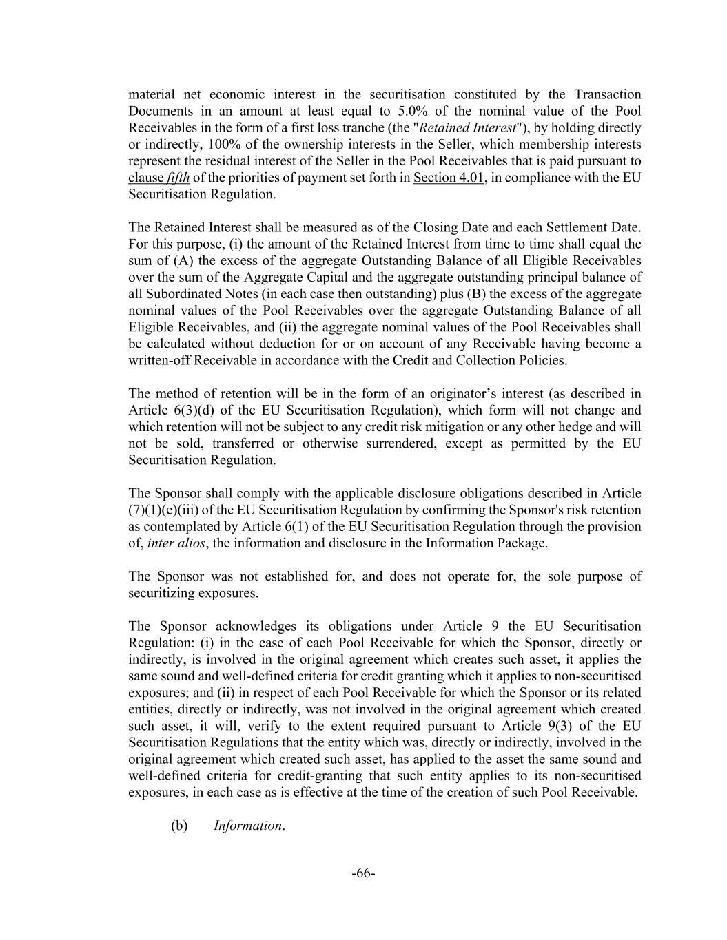 -66- material net economic interest in the securitisation constituted by the Transaction Documents in an amount at least equal to 5.0% of the nominal value of the Pool Receivables in the form of a first loss tranche (the "Retained Interest"), by holding directly or indirectly, 100% of the ownership interests in the Seller, which membership interests represent the residual interest of the Seller in the Pool Receivables that is paid pursuant to clause fifth of the priorities of payment set forth in Section 4.01, in compliance with the EU Securitisation Regulation. The Retained Interest shall be measured as of the Closing Date and each Settlement Date. For this purpose, (i) the amount of the Retained Interest from time to time shall equal the sum of (A) the excess of the aggregate Outstanding Balance of all Eligible Receivables over the sum of the Aggregate Capital and the aggregate outstanding principal balance of all Subordinated Notes (in each case then outstanding) plus (B) the excess of the aggregate nominal values of the Pool Receivables over the aggregate Outstanding Balance of all Eligible Receivables, and (ii) the aggregate nominal values of the Pool Receivables shall be calculated without deduction for or on account of any Receivable having become a written-off Receivable in accordance with the Credit and Collection Policies. The method of retention will be in the form of an originator’s interest (as described in Article 6(3)(d) of the EU Securitisation Regulation), which form will not change and which retention will not be subject to any credit risk mitigation or any other hedge and will not be sold, transferred or otherwise surrendered, except as permitted by the EU Securitisation Regulation. The Sponsor shall comply with the applicable disclosure obligations described in Article (7)(1)(e)(iii) of the EU Securitisation Regulation by confirming the Sponsor's risk retention as contemplated by Article 6(1) of the EU Securitisation Regulation through the provision of, inter alios, the information and disclosure in the Information Package. The Sponsor was not established for, and does not operate for, the sole purpose of securitizing exposures. The Sponsor acknowledges its obligations under Article 9 the EU Securitisation Regulation: (i) in the case of each Pool Receivable for which the Sponsor, directly or indirectly, is involved in the original agreement which creates such asset, it applies the same sound and well-defined criteria for credit granting which it applies to non-securitised exposures; and (ii) in respect of each Pool Receivable for which the Sponsor or its related entities, directly or indirectly, was not involved in the original agreement which created such asset, it will, verify to the extent required pursuant to Article 9(3) of the EU Securitisation Regulations that the entity which was, directly or indirectly, involved in the original agreement which created such asset, has applied to the asset the same sound and well-defined criteria for credit-granting that such entity applies to its non-securitised exposures, in each case as is effective at the time of the creation of such Pool Receivable. (b) Information.