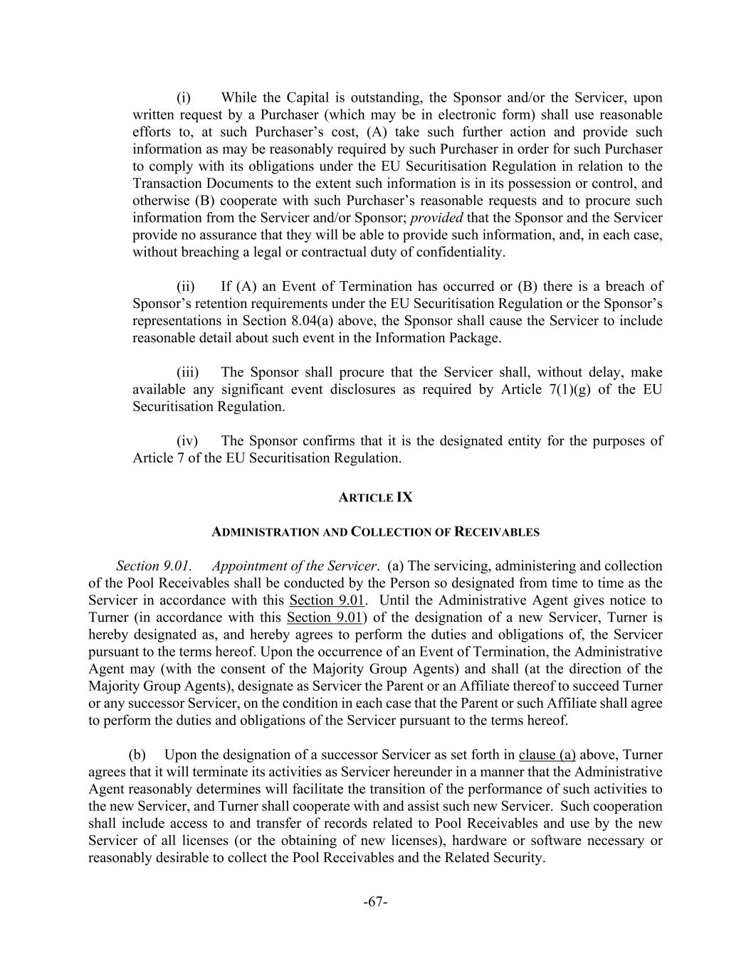 -67- (i) While the Capital is outstanding, the Sponsor and/or the Servicer, upon written request by a Purchaser (which may be in electronic form) shall use reasonable efforts to, at such Purchaser’s cost, (A) take such further action and provide such information as may be reasonably required by such Purchaser in order for such Purchaser to comply with its obligations under the EU Securitisation Regulation in relation to the Transaction Documents to the extent such information is in its possession or control, and otherwise (B) cooperate with such Purchaser’s reasonable requests and to procure such information from the Servicer and/or Sponsor; provided that the Sponsor and the Servicer provide no assurance that they will be able to provide such information, and, in each case, without breaching a legal or contractual duty of confidentiality. (ii) If (A) an Event of Termination has occurred or (B) there is a breach of Sponsor’s retention requirements under the EU Securitisation Regulation or the Sponsor’s representations in Section 8.04(a) above, the Sponsor shall cause the Servicer to include reasonable detail about such event in the Information Package. (iii) The Sponsor shall procure that the Servicer shall, without delay, make available any significant event disclosures as required by Article 7(1)(g) of the EU Securitisation Regulation. (iv) The Sponsor confirms that it is the designated entity for the purposes of Article 7 of the EU Securitisation Regulation. ARTICLE IX ADMINISTRATION AND COLLECTION OF RECEIVABLES Section 9.01. Appointment of the Servicer. (a) The servicing, administering and collection of the Pool Receivables shall be conducted by the Person so designated from time to time as the Servicer in accordance with this Section 9.01. Until the Administrative Agent gives notice to Turner (in accordance with this Section 9.01) of the designation of a new Servicer, Turner is hereby designated as, and hereby agrees to perform the duties and obligations of, the Servicer pursuant to the terms hereof. Upon the occurrence of an Event of Termination, the Administrative Agent may (with the consent of the Majority Group Agents) and shall (at the direction of the Majority Group Agents), designate as Servicer the Parent or an Affiliate thereof to succeed Turner or any successor Servicer, on the condition in each case that the Parent or such Affiliate shall agree to perform the duties and obligations of the Servicer pursuant to the terms hereof. (b) Upon the designation of a successor Servicer as set forth in clause (a) above, Turner agrees that it will terminate its activities as Servicer hereunder in a manner that the Administrative Agent reasonably determines will facilitate the transition of the performance of such activities to the new Servicer, and Turner shall cooperate with and assist such new Servicer. Such cooperation shall include access to and transfer of records related to Pool Receivables and use by the new Servicer of all licenses (or the obtaining of new licenses), hardware or software necessary or reasonably desirable to collect the Pool Receivables and the Related Security.