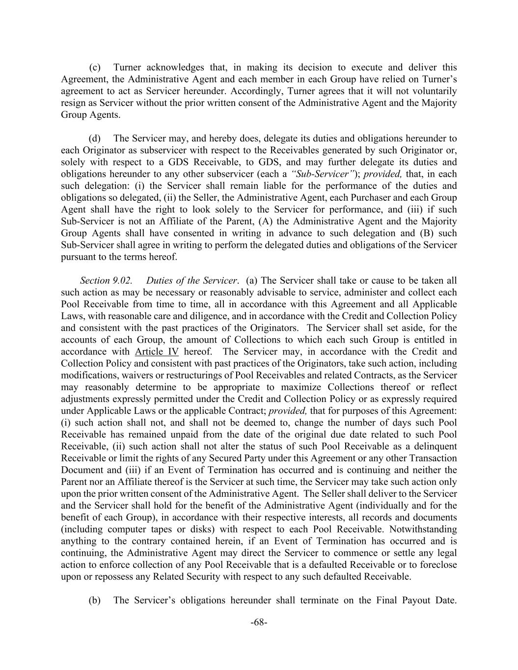 -68- (c) Turner acknowledges that, in making its decision to execute and deliver this Agreement, the Administrative Agent and each member in each Group have relied on Turner’s agreement to act as Servicer hereunder. Accordingly, Turner agrees that it will not voluntarily resign as Servicer without the prior written consent of the Administrative Agent and the Majority Group Agents. (d) The Servicer may, and hereby does, delegate its duties and obligations hereunder to each Originator as subservicer with respect to the Receivables generated by such Originator or, solely with respect to a GDS Receivable, to GDS, and may further delegate its duties and obligations hereunder to any other subservicer (each a “Sub-Servicer”); provided, that, in each such delegation: (i) the Servicer shall remain liable for the performance of the duties and obligations so delegated, (ii) the Seller, the Administrative Agent, each Purchaser and each Group Agent shall have the right to look solely to the Servicer for performance, and (iii) if such Sub-Servicer is not an Affiliate of the Parent, (A) the Administrative Agent and the Majority Group Agents shall have consented in writing in advance to such delegation and (B) such Sub-Servicer shall agree in writing to perform the delegated duties and obligations of the Servicer pursuant to the terms hereof. Section 9.02. Duties of the Servicer. (a) The Servicer shall take or cause to be taken all such action as may be necessary or reasonably advisable to service, administer and collect each Pool Receivable from time to time, all in accordance with this Agreement and all Applicable Laws, with reasonable care and diligence, and in accordance with the Credit and Collection Policy and consistent with the past practices of the Originators. The Servicer shall set aside, for the accounts of each Group, the amount of Collections to which each such Group is entitled in accordance with Article IV hereof. The Servicer may, in accordance with the Credit and Collection Policy and consistent with past practices of the Originators, take such action, including modifications, waivers or restructurings of Pool Receivables and related Contracts, as the Servicer may reasonably determine to be appropriate to maximize Collections thereof or reflect adjustments expressly permitted under the Credit and Collection Policy or as expressly required under Applicable Laws or the applicable Contract; provided, that for purposes of this Agreement: (i) such action shall not, and shall not be deemed to, change the number of days such Pool Receivable has remained unpaid from the date of the original due date related to such Pool Receivable, (ii) such action shall not alter the status of such Pool Receivable as a delinquent Receivable or limit the rights of any Secured Party under this Agreement or any other Transaction Document and (iii) if an Event of Termination has occurred and is continuing and neither the Parent nor an Affiliate thereof is the Servicer at such time, the Servicer may take such action only upon the prior written consent of the Administrative Agent. The Seller shall deliver to the Servicer and the Servicer shall hold for the benefit of the Administrative Agent (individually and for the benefit of each Group), in accordance with their respective interests, all records and documents (including computer tapes or disks) with respect to each Pool Receivable. Notwithstanding anything to the contrary contained herein, if an Event of Termination has occurred and is continuing, the Administrative Agent may direct the Servicer to commence or settle any legal action to enforce collection of any Pool Receivable that is a defaulted Receivable or to foreclose upon or repossess any Related Security with respect to any such defaulted Receivable. (b) The Servicer’s obligations hereunder shall terminate on the Final Payout Date.