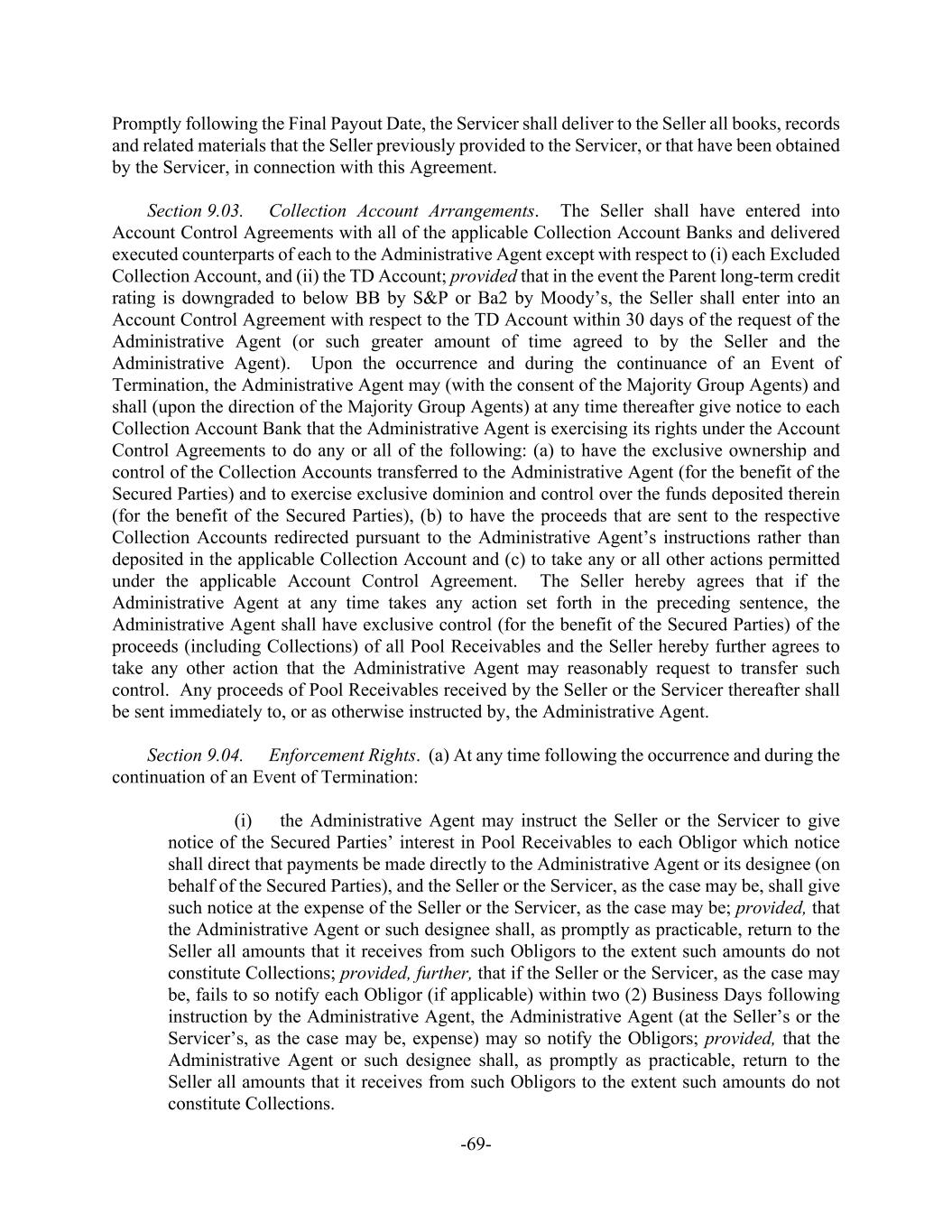 -69- Promptly following the Final Payout Date, the Servicer shall deliver to the Seller all books, records and related materials that the Seller previously provided to the Servicer, or that have been obtained by the Servicer, in connection with this Agreement. Section 9.03. Collection Account Arrangements. The Seller shall have entered into Account Control Agreements with all of the applicable Collection Account Banks and delivered executed counterparts of each to the Administrative Agent except with respect to (i) each Excluded Collection Account, and (ii) the TD Account; provided that in the event the Parent long-term credit rating is downgraded to below BB by S&P or Ba2 by Moody’s, the Seller shall enter into an Account Control Agreement with respect to the TD Account within 30 days of the request of the Administrative Agent (or such greater amount of time agreed to by the Seller and the Administrative Agent). Upon the occurrence and during the continuance of an Event of Termination, the Administrative Agent may (with the consent of the Majority Group Agents) and shall (upon the direction of the Majority Group Agents) at any time thereafter give notice to each Collection Account Bank that the Administrative Agent is exercising its rights under the Account Control Agreements to do any or all of the following: (a) to have the exclusive ownership and control of the Collection Accounts transferred to the Administrative Agent (for the benefit of the Secured Parties) and to exercise exclusive dominion and control over the funds deposited therein (for the benefit of the Secured Parties), (b) to have the proceeds that are sent to the respective Collection Accounts redirected pursuant to the Administrative Agent’s instructions rather than deposited in the applicable Collection Account and (c) to take any or all other actions permitted under the applicable Account Control Agreement. The Seller hereby agrees that if the Administrative Agent at any time takes any action set forth in the preceding sentence, the Administrative Agent shall have exclusive control (for the benefit of the Secured Parties) of the proceeds (including Collections) of all Pool Receivables and the Seller hereby further agrees to take any other action that the Administrative Agent may reasonably request to transfer such control. Any proceeds of Pool Receivables received by the Seller or the Servicer thereafter shall be sent immediately to, or as otherwise instructed by, the Administrative Agent. Section 9.04. Enforcement Rights. (a) At any time following the occurrence and during the continuation of an Event of Termination: (i) the Administrative Agent may instruct the Seller or the Servicer to give notice of the Secured Parties’ interest in Pool Receivables to each Obligor which notice shall direct that payments be made directly to the Administrative Agent or its designee (on behalf of the Secured Parties), and the Seller or the Servicer, as the case may be, shall give such notice at the expense of the Seller or the Servicer, as the case may be; provided, that the Administrative Agent or such designee shall, as promptly as practicable, return to the Seller all amounts that it receives from such Obligors to the extent such amounts do not constitute Collections; provided, further, that if the Seller or the Servicer, as the case may be, fails to so notify each Obligor (if applicable) within two (2) Business Days following instruction by the Administrative Agent, the Administrative Agent (at the Seller’s or the Servicer’s, as the case may be, expense) may so notify the Obligors; provided, that the Administrative Agent or such designee shall, as promptly as practicable, return to the Seller all amounts that it receives from such Obligors to the extent such amounts do not constitute Collections.