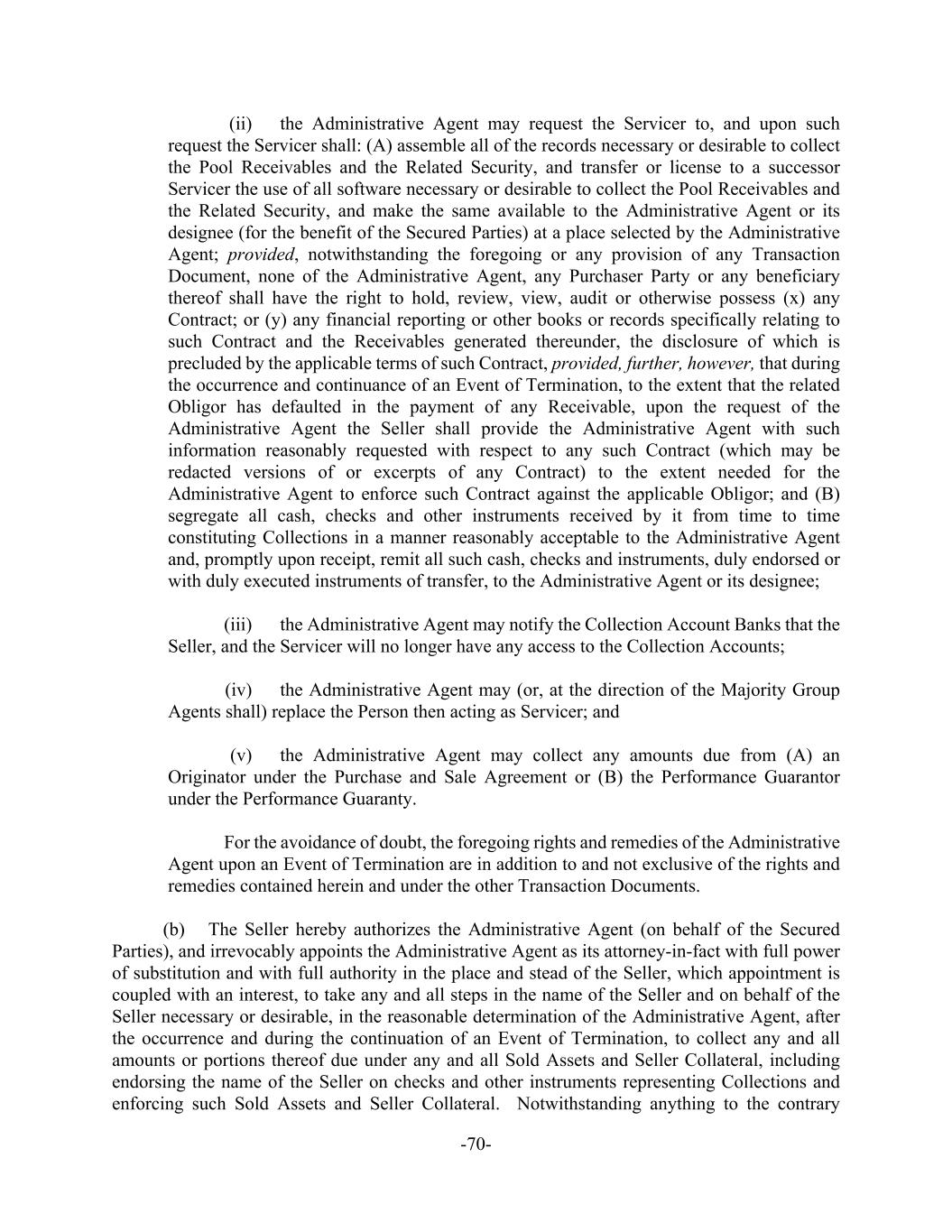 -70- (ii) the Administrative Agent may request the Servicer to, and upon such request the Servicer shall: (A) assemble all of the records necessary or desirable to collect the Pool Receivables and the Related Security, and transfer or license to a successor Servicer the use of all software necessary or desirable to collect the Pool Receivables and the Related Security, and make the same available to the Administrative Agent or its designee (for the benefit of the Secured Parties) at a place selected by the Administrative Agent; provided, notwithstanding the foregoing or any provision of any Transaction Document, none of the Administrative Agent, any Purchaser Party or any beneficiary thereof shall have the right to hold, review, view, audit or otherwise possess (x) any Contract; or (y) any financial reporting or other books or records specifically relating to such Contract and the Receivables generated thereunder, the disclosure of which is precluded by the applicable terms of such Contract, provided, further, however, that during the occurrence and continuance of an Event of Termination, to the extent that the related Obligor has defaulted in the payment of any Receivable, upon the request of the Administrative Agent the Seller shall provide the Administrative Agent with such information reasonably requested with respect to any such Contract (which may be redacted versions of or excerpts of any Contract) to the extent needed for the Administrative Agent to enforce such Contract against the applicable Obligor; and (B) segregate all cash, checks and other instruments received by it from time to time constituting Collections in a manner reasonably acceptable to the Administrative Agent and, promptly upon receipt, remit all such cash, checks and instruments, duly endorsed or with duly executed instruments of transfer, to the Administrative Agent or its designee; (iii) the Administrative Agent may notify the Collection Account Banks that the Seller, and the Servicer will no longer have any access to the Collection Accounts; (iv) the Administrative Agent may (or, at the direction of the Majority Group Agents shall) replace the Person then acting as Servicer; and (v) the Administrative Agent may collect any amounts due from (A) an Originator under the Purchase and Sale Agreement or (B) the Performance Guarantor under the Performance Guaranty. For the avoidance of doubt, the foregoing rights and remedies of the Administrative Agent upon an Event of Termination are in addition to and not exclusive of the rights and remedies contained herein and under the other Transaction Documents. (b) The Seller hereby authorizes the Administrative Agent (on behalf of the Secured Parties), and irrevocably appoints the Administrative Agent as its attorney-in-fact with full power of substitution and with full authority in the place and stead of the Seller, which appointment is coupled with an interest, to take any and all steps in the name of the Seller and on behalf of the Seller necessary or desirable, in the reasonable determination of the Administrative Agent, after the occurrence and during the continuation of an Event of Termination, to collect any and all amounts or portions thereof due under any and all Sold Assets and Seller Collateral, including endorsing the name of the Seller on checks and other instruments representing Collections and enforcing such Sold Assets and Seller Collateral. Notwithstanding anything to the contrary