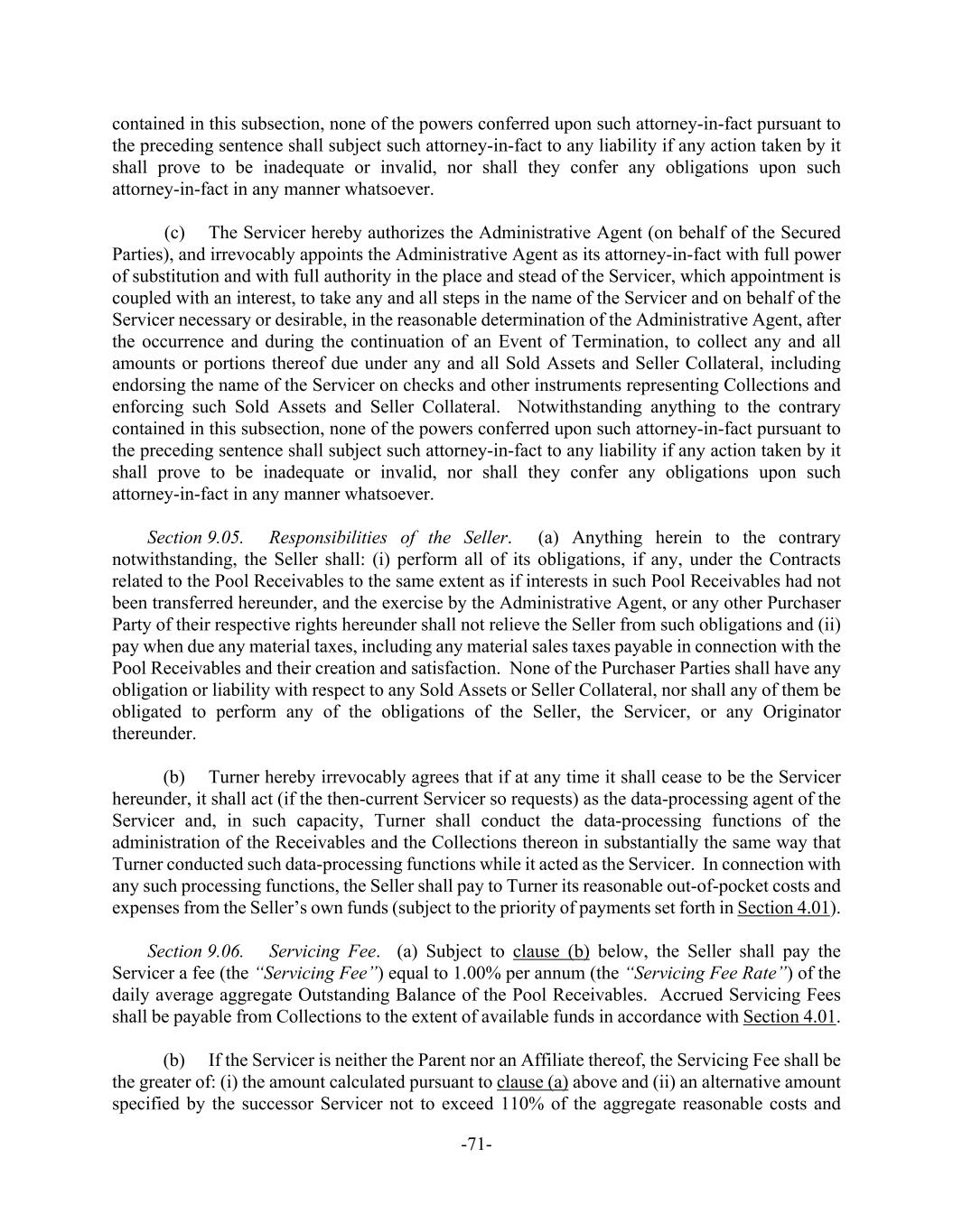 -71- contained in this subsection, none of the powers conferred upon such attorney-in-fact pursuant to the preceding sentence shall subject such attorney-in-fact to any liability if any action taken by it shall prove to be inadequate or invalid, nor shall they confer any obligations upon such attorney-in-fact in any manner whatsoever. (c) The Servicer hereby authorizes the Administrative Agent (on behalf of the Secured Parties), and irrevocably appoints the Administrative Agent as its attorney-in-fact with full power of substitution and with full authority in the place and stead of the Servicer, which appointment is coupled with an interest, to take any and all steps in the name of the Servicer and on behalf of the Servicer necessary or desirable, in the reasonable determination of the Administrative Agent, after the occurrence and during the continuation of an Event of Termination, to collect any and all amounts or portions thereof due under any and all Sold Assets and Seller Collateral, including endorsing the name of the Servicer on checks and other instruments representing Collections and enforcing such Sold Assets and Seller Collateral. Notwithstanding anything to the contrary contained in this subsection, none of the powers conferred upon such attorney-in-fact pursuant to the preceding sentence shall subject such attorney-in-fact to any liability if any action taken by it shall prove to be inadequate or invalid, nor shall they confer any obligations upon such attorney-in-fact in any manner whatsoever. Section 9.05. Responsibilities of the Seller. (a) Anything herein to the contrary notwithstanding, the Seller shall: (i) perform all of its obligations, if any, under the Contracts related to the Pool Receivables to the same extent as if interests in such Pool Receivables had not been transferred hereunder, and the exercise by the Administrative Agent, or any other Purchaser Party of their respective rights hereunder shall not relieve the Seller from such obligations and (ii) pay when due any material taxes, including any material sales taxes payable in connection with the Pool Receivables and their creation and satisfaction. None of the Purchaser Parties shall have any obligation or liability with respect to any Sold Assets or Seller Collateral, nor shall any of them be obligated to perform any of the obligations of the Seller, the Servicer, or any Originator thereunder. (b) Turner hereby irrevocably agrees that if at any time it shall cease to be the Servicer hereunder, it shall act (if the then-current Servicer so requests) as the data-processing agent of the Servicer and, in such capacity, Turner shall conduct the data-processing functions of the administration of the Receivables and the Collections thereon in substantially the same way that Turner conducted such data-processing functions while it acted as the Servicer. In connection with any such processing functions, the Seller shall pay to Turner its reasonable out-of-pocket costs and expenses from the Seller’s own funds (subject to the priority of payments set forth in Section 4.01). Section 9.06. Servicing Fee. (a) Subject to clause (b) below, the Seller shall pay the Servicer a fee (the “Servicing Fee”) equal to 1.00% per annum (the “Servicing Fee Rate”) of the daily average aggregate Outstanding Balance of the Pool Receivables. Accrued Servicing Fees shall be payable from Collections to the extent of available funds in accordance with Section 4.01. (b) If the Servicer is neither the Parent nor an Affiliate thereof, the Servicing Fee shall be the greater of: (i) the amount calculated pursuant to clause (a) above and (ii) an alternative amount specified by the successor Servicer not to exceed 110% of the aggregate reasonable costs and