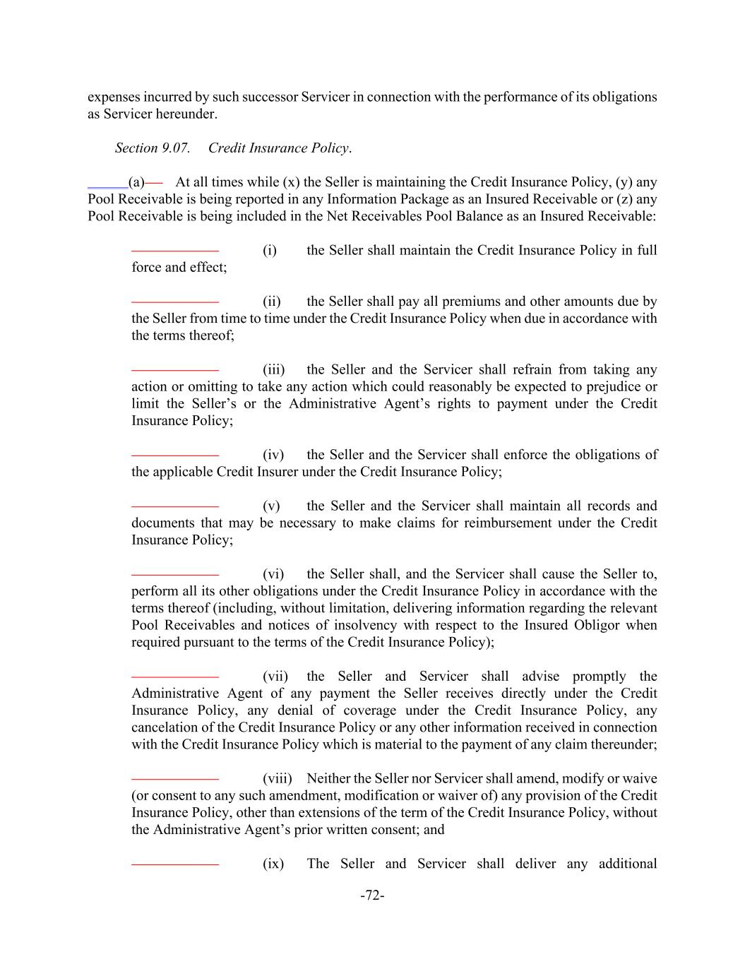 -72- expenses incurred by such successor Servicer in connection with the performance of its obligations as Servicer hereunder. Section 9.07. Credit Insurance Policy. (a) At all times while (x) the Seller is maintaining the Credit Insurance Policy, (y) any Pool Receivable is being reported in any Information Package as an Insured Receivable or (z) any Pool Receivable is being included in the Net Receivables Pool Balance as an Insured Receivable: (i) the Seller shall maintain the Credit Insurance Policy in full force and effect; (ii) the Seller shall pay all premiums and other amounts due by the Seller from time to time under the Credit Insurance Policy when due in accordance with the terms thereof; (iii) the Seller and the Servicer shall refrain from taking any action or omitting to take any action which could reasonably be expected to prejudice or limit the Seller’s or the Administrative Agent’s rights to payment under the Credit Insurance Policy; (iv) the Seller and the Servicer shall enforce the obligations of the applicable Credit Insurer under the Credit Insurance Policy; (v) the Seller and the Servicer shall maintain all records and documents that may be necessary to make claims for reimbursement under the Credit Insurance Policy; (vi) the Seller shall, and the Servicer shall cause the Seller to, perform all its other obligations under the Credit Insurance Policy in accordance with the terms thereof (including, without limitation, delivering information regarding the relevant Pool Receivables and notices of insolvency with respect to the Insured Obligor when required pursuant to the terms of the Credit Insurance Policy); (vii) the Seller and Servicer shall advise promptly the Administrative Agent of any payment the Seller receives directly under the Credit Insurance Policy, any denial of coverage under the Credit Insurance Policy, any cancelation of the Credit Insurance Policy or any other information received in connection with the Credit Insurance Policy which is material to the payment of any claim thereunder; (viii) Neither the Seller nor Servicer shall amend, modify or waive (or consent to any such amendment, modification or waiver of) any provision of the Credit Insurance Policy, other than extensions of the term of the Credit Insurance Policy, without the Administrative Agent’s prior written consent; and (ix) The Seller and Servicer shall deliver any additional