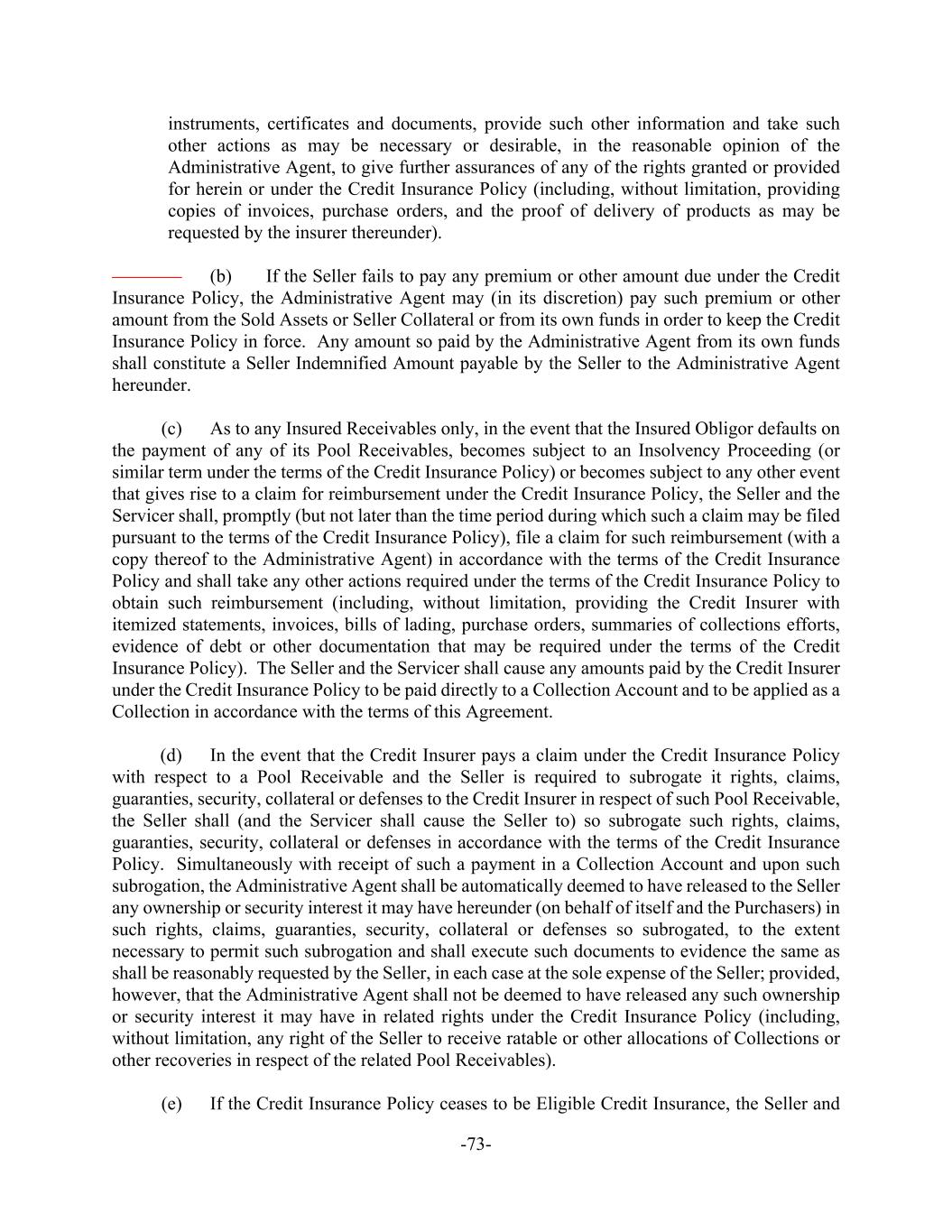 -73- instruments, certificates and documents, provide such other information and take such other actions as may be necessary or desirable, in the reasonable opinion of the Administrative Agent, to give further assurances of any of the rights granted or provided for herein or under the Credit Insurance Policy (including, without limitation, providing copies of invoices, purchase orders, and the proof of delivery of products as may be requested by the insurer thereunder). (b) If the Seller fails to pay any premium or other amount due under the Credit Insurance Policy, the Administrative Agent may (in its discretion) pay such premium or other amount from the Sold Assets or Seller Collateral or from its own funds in order to keep the Credit Insurance Policy in force. Any amount so paid by the Administrative Agent from its own funds shall constitute a Seller Indemnified Amount payable by the Seller to the Administrative Agent hereunder. (c) As to any Insured Receivables only, in the event that the Insured Obligor defaults on the payment of any of its Pool Receivables, becomes subject to an Insolvency Proceeding (or similar term under the terms of the Credit Insurance Policy) or becomes subject to any other event that gives rise to a claim for reimbursement under the Credit Insurance Policy, the Seller and the Servicer shall, promptly (but not later than the time period during which such a claim may be filed pursuant to the terms of the Credit Insurance Policy), file a claim for such reimbursement (with a copy thereof to the Administrative Agent) in accordance with the terms of the Credit Insurance Policy and shall take any other actions required under the terms of the Credit Insurance Policy to obtain such reimbursement (including, without limitation, providing the Credit Insurer with itemized statements, invoices, bills of lading, purchase orders, summaries of collections efforts, evidence of debt or other documentation that may be required under the terms of the Credit Insurance Policy). The Seller and the Servicer shall cause any amounts paid by the Credit Insurer under the Credit Insurance Policy to be paid directly to a Collection Account and to be applied as a Collection in accordance with the terms of this Agreement. (d) In the event that the Credit Insurer pays a claim under the Credit Insurance Policy with respect to a Pool Receivable and the Seller is required to subrogate it rights, claims, guaranties, security, collateral or defenses to the Credit Insurer in respect of such Pool Receivable, the Seller shall (and the Servicer shall cause the Seller to) so subrogate such rights, claims, guaranties, security, collateral or defenses in accordance with the terms of the Credit Insurance Policy. Simultaneously with receipt of such a payment in a Collection Account and upon such subrogation, the Administrative Agent shall be automatically deemed to have released to the Seller any ownership or security interest it may have hereunder (on behalf of itself and the Purchasers) in such rights, claims, guaranties, security, collateral or defenses so subrogated, to the extent necessary to permit such subrogation and shall execute such documents to evidence the same as shall be reasonably requested by the Seller, in each case at the sole expense of the Seller; provided, however, that the Administrative Agent shall not be deemed to have released any such ownership or security interest it may have in related rights under the Credit Insurance Policy (including, without limitation, any right of the Seller to receive ratable or other allocations of Collections or other recoveries in respect of the related Pool Receivables). (e) If the Credit Insurance Policy ceases to be Eligible Credit Insurance, the Seller and