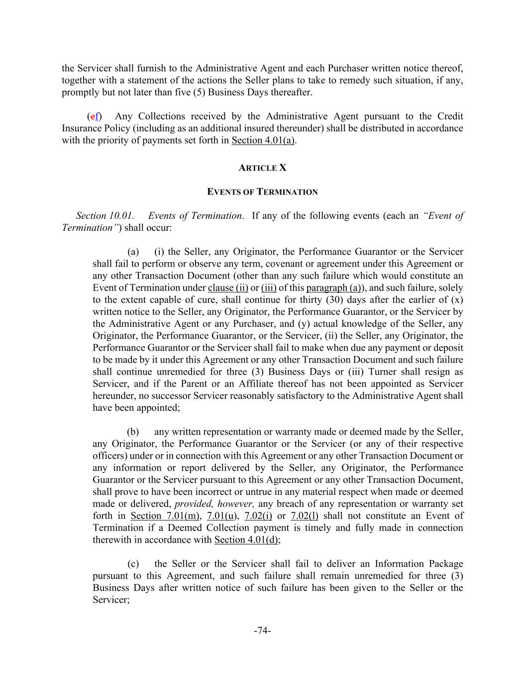 -74- the Servicer shall furnish to the Administrative Agent and each Purchaser written notice thereof, together with a statement of the actions the Seller plans to take to remedy such situation, if any, promptly but not later than five (5) Business Days thereafter. (ef) Any Collections received by the Administrative Agent pursuant to the Credit Insurance Policy (including as an additional insured thereunder) shall be distributed in accordance with the priority of payments set forth in Section 4.01(a). ARTICLE X EVENTS OF TERMINATION Section 10.01. Events of Termination. If any of the following events (each an “Event of Termination”) shall occur: (a) (i) the Seller, any Originator, the Performance Guarantor or the Servicer shall fail to perform or observe any term, covenant or agreement under this Agreement or any other Transaction Document (other than any such failure which would constitute an Event of Termination under clause (ii) or (iii) of this paragraph (a)), and such failure, solely to the extent capable of cure, shall continue for thirty (30) days after the earlier of (x) written notice to the Seller, any Originator, the Performance Guarantor, or the Servicer by the Administrative Agent or any Purchaser, and (y) actual knowledge of the Seller, any Originator, the Performance Guarantor, or the Servicer, (ii) the Seller, any Originator, the Performance Guarantor or the Servicer shall fail to make when due any payment or deposit to be made by it under this Agreement or any other Transaction Document and such failure shall continue unremedied for three (3) Business Days or (iii) Turner shall resign as Servicer, and if the Parent or an Affiliate thereof has not been appointed as Servicer hereunder, no successor Servicer reasonably satisfactory to the Administrative Agent shall have been appointed; (b) any written representation or warranty made or deemed made by the Seller, any Originator, the Performance Guarantor or the Servicer (or any of their respective officers) under or in connection with this Agreement or any other Transaction Document or any information or report delivered by the Seller, any Originator, the Performance Guarantor or the Servicer pursuant to this Agreement or any other Transaction Document, shall prove to have been incorrect or untrue in any material respect when made or deemed made or delivered, provided, however, any breach of any representation or warranty set forth in Section 7.01(m), 7.01(u), 7.02(i) or 7.02(l) shall not constitute an Event of Termination if a Deemed Collection payment is timely and fully made in connection therewith in accordance with Section 4.01(d); (c) the Seller or the Servicer shall fail to deliver an Information Package pursuant to this Agreement, and such failure shall remain unremedied for three (3) Business Days after written notice of such failure has been given to the Seller or the Servicer;