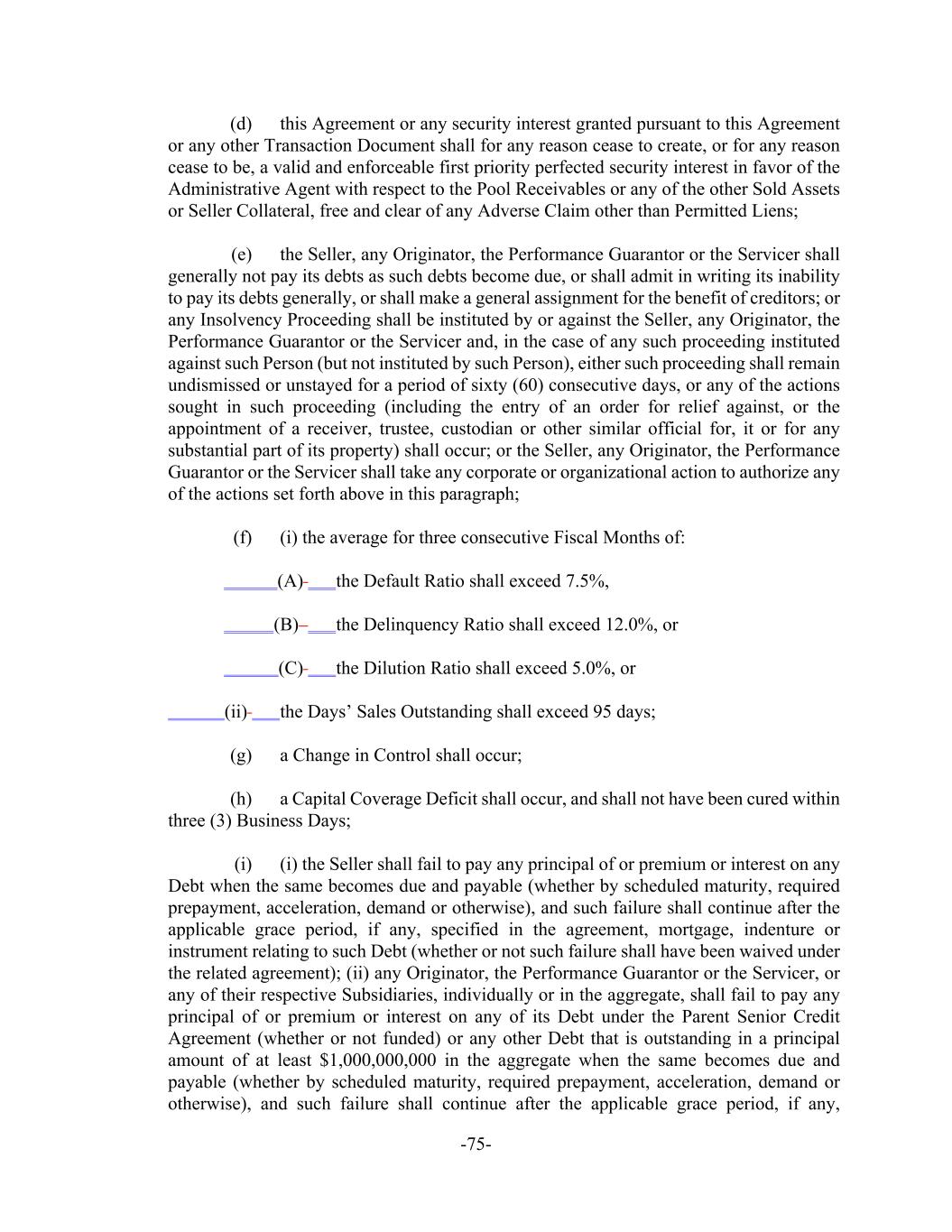 -75- (d) this Agreement or any security interest granted pursuant to this Agreement or any other Transaction Document shall for any reason cease to create, or for any reason cease to be, a valid and enforceable first priority perfected security interest in favor of the Administrative Agent with respect to the Pool Receivables or any of the other Sold Assets or Seller Collateral, free and clear of any Adverse Claim other than Permitted Liens; (e) the Seller, any Originator, the Performance Guarantor or the Servicer shall generally not pay its debts as such debts become due, or shall admit in writing its inability to pay its debts generally, or shall make a general assignment for the benefit of creditors; or any Insolvency Proceeding shall be instituted by or against the Seller, any Originator, the Performance Guarantor or the Servicer and, in the case of any such proceeding instituted against such Person (but not instituted by such Person), either such proceeding shall remain undismissed or unstayed for a period of sixty (60) consecutive days, or any of the actions sought in such proceeding (including the entry of an order for relief against, or the appointment of a receiver, trustee, custodian or other similar official for, it or for any substantial part of its property) shall occur; or the Seller, any Originator, the Performance Guarantor or the Servicer shall take any corporate or organizational action to authorize any of the actions set forth above in this paragraph; (f) (i) the average for three consecutive Fiscal Months of: (A) the Default Ratio shall exceed 7.5%, (B) the Delinquency Ratio shall exceed 12.0%, or (C) the Dilution Ratio shall exceed 5.0%, or (ii) the Days’ Sales Outstanding shall exceed 95 days; (g) a Change in Control shall occur; (h) a Capital Coverage Deficit shall occur, and shall not have been cured within three (3) Business Days; (i) (i) the Seller shall fail to pay any principal of or premium or interest on any Debt when the same becomes due and payable (whether by scheduled maturity, required prepayment, acceleration, demand or otherwise), and such failure shall continue after the applicable grace period, if any, specified in the agreement, mortgage, indenture or instrument relating to such Debt (whether or not such failure shall have been waived under the related agreement); (ii) any Originator, the Performance Guarantor or the Servicer, or any of their respective Subsidiaries, individually or in the aggregate, shall fail to pay any principal of or premium or interest on any of its Debt under the Parent Senior Credit Agreement (whether or not funded) or any other Debt that is outstanding in a principal amount of at least $1,000,000,000 in the aggregate when the same becomes due and payable (whether by scheduled maturity, required prepayment, acceleration, demand or otherwise), and such failure shall continue after the applicable grace period, if any,