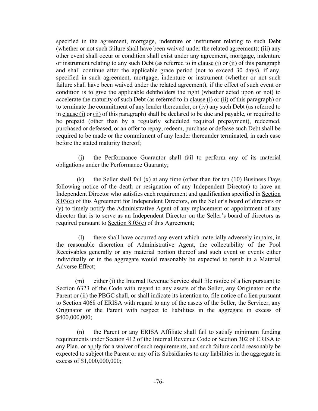 -76- specified in the agreement, mortgage, indenture or instrument relating to such Debt (whether or not such failure shall have been waived under the related agreement); (iii) any other event shall occur or condition shall exist under any agreement, mortgage, indenture or instrument relating to any such Debt (as referred to in clause (i) or (ii) of this paragraph and shall continue after the applicable grace period (not to exceed 30 days), if any, specified in such agreement, mortgage, indenture or instrument (whether or not such failure shall have been waived under the related agreement), if the effect of such event or condition is to give the applicable debtholders the right (whether acted upon or not) to accelerate the maturity of such Debt (as referred to in clause (i) or (ii) of this paragraph) or to terminate the commitment of any lender thereunder, or (iv) any such Debt (as referred to in clause (i) or (ii) of this paragraph) shall be declared to be due and payable, or required to be prepaid (other than by a regularly scheduled required prepayment), redeemed, purchased or defeased, or an offer to repay, redeem, purchase or defease such Debt shall be required to be made or the commitment of any lender thereunder terminated, in each case before the stated maturity thereof; (j) the Performance Guarantor shall fail to perform any of its material obligations under the Performance Guaranty; (k) the Seller shall fail (x) at any time (other than for ten (10) Business Days following notice of the death or resignation of any Independent Director) to have an Independent Director who satisfies each requirement and qualification specified in Section 8.03(c) of this Agreement for Independent Directors, on the Seller’s board of directors or (y) to timely notify the Administrative Agent of any replacement or appointment of any director that is to serve as an Independent Director on the Seller’s board of directors as required pursuant to Section 8.03(c) of this Agreement; (l) there shall have occurred any event which materially adversely impairs, in the reasonable discretion of Administrative Agent, the collectability of the Pool Receivables generally or any material portion thereof and such event or events either individually or in the aggregate would reasonably be expected to result in a Material Adverse Effect; (m) either (i) the Internal Revenue Service shall file notice of a lien pursuant to Section 6323 of the Code with regard to any assets of the Seller, any Originator or the Parent or (ii) the PBGC shall, or shall indicate its intention to, file notice of a lien pursuant to Section 4068 of ERISA with regard to any of the assets of the Seller, the Servicer, any Originator or the Parent with respect to liabilities in the aggregate in excess of $400,000,000; (n) the Parent or any ERISA Affiliate shall fail to satisfy minimum funding requirements under Section 412 of the Internal Revenue Code or Section 302 of ERISA to any Plan, or apply for a waiver of such requirements, and such failure could reasonably be expected to subject the Parent or any of its Subsidiaries to any liabilities in the aggregate in excess of $1,000,000,000;