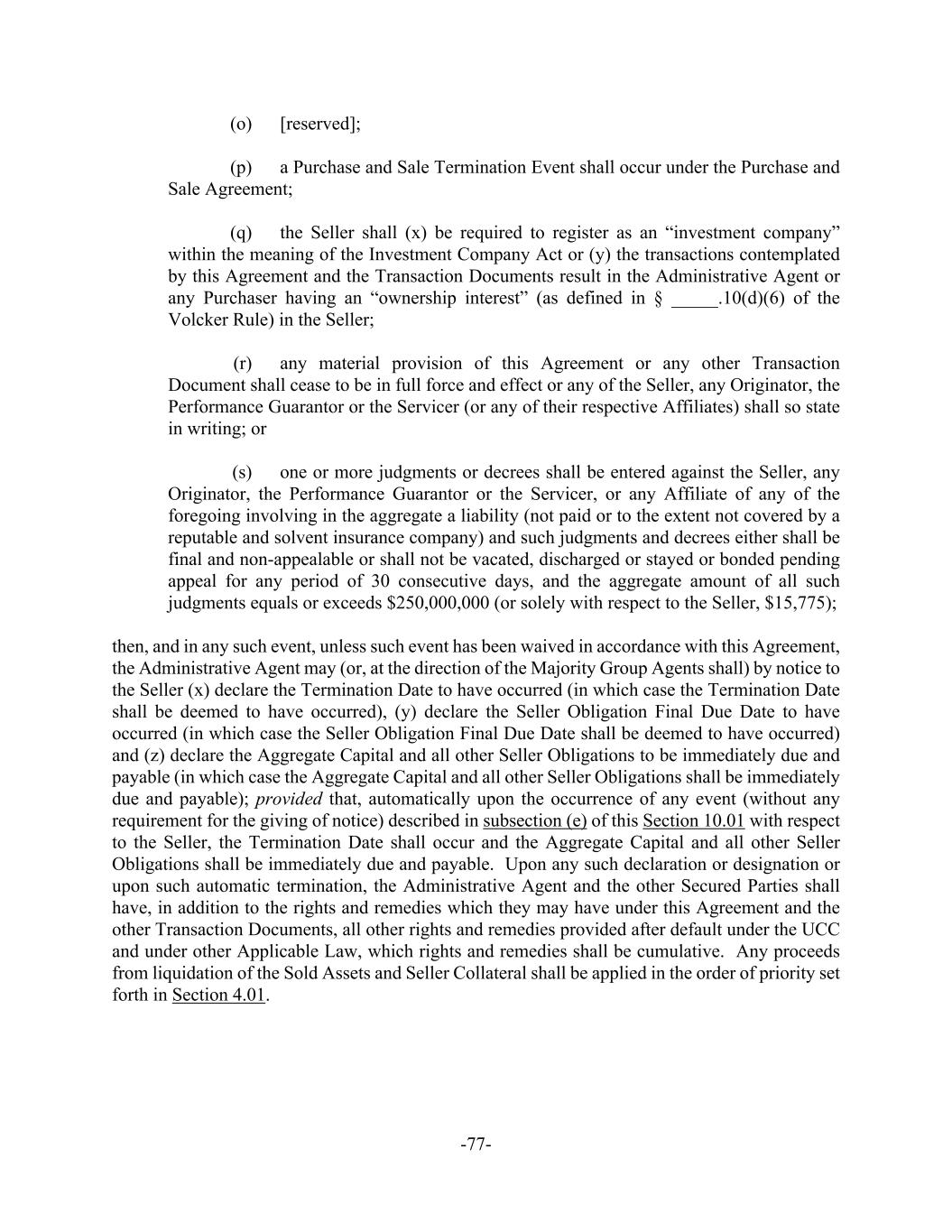 -77- (o) [reserved]; (p) a Purchase and Sale Termination Event shall occur under the Purchase and Sale Agreement; (q) the Seller shall (x) be required to register as an “investment company” within the meaning of the Investment Company Act or (y) the transactions contemplated by this Agreement and the Transaction Documents result in the Administrative Agent or any Purchaser having an “ownership interest” (as defined in § _____.10(d)(6) of the Volcker Rule) in the Seller; (r) any material provision of this Agreement or any other Transaction Document shall cease to be in full force and effect or any of the Seller, any Originator, the Performance Guarantor or the Servicer (or any of their respective Affiliates) shall so state in writing; or (s) one or more judgments or decrees shall be entered against the Seller, any Originator, the Performance Guarantor or the Servicer, or any Affiliate of any of the foregoing involving in the aggregate a liability (not paid or to the extent not covered by a reputable and solvent insurance company) and such judgments and decrees either shall be final and non-appealable or shall not be vacated, discharged or stayed or bonded pending appeal for any period of 30 consecutive days, and the aggregate amount of all such judgments equals or exceeds $250,000,000 (or solely with respect to the Seller, $15,775); then, and in any such event, unless such event has been waived in accordance with this Agreement, the Administrative Agent may (or, at the direction of the Majority Group Agents shall) by notice to the Seller (x) declare the Termination Date to have occurred (in which case the Termination Date shall be deemed to have occurred), (y) declare the Seller Obligation Final Due Date to have occurred (in which case the Seller Obligation Final Due Date shall be deemed to have occurred) and (z) declare the Aggregate Capital and all other Seller Obligations to be immediately due and payable (in which case the Aggregate Capital and all other Seller Obligations shall be immediately due and payable); provided that, automatically upon the occurrence of any event (without any requirement for the giving of notice) described in subsection (e) of this Section 10.01 with respect to the Seller, the Termination Date shall occur and the Aggregate Capital and all other Seller Obligations shall be immediately due and payable. Upon any such declaration or designation or upon such automatic termination, the Administrative Agent and the other Secured Parties shall have, in addition to the rights and remedies which they may have under this Agreement and the other Transaction Documents, all other rights and remedies provided after default under the UCC and under other Applicable Law, which rights and remedies shall be cumulative. Any proceeds from liquidation of the Sold Assets and Seller Collateral shall be applied in the order of priority set forth in Section 4.01.