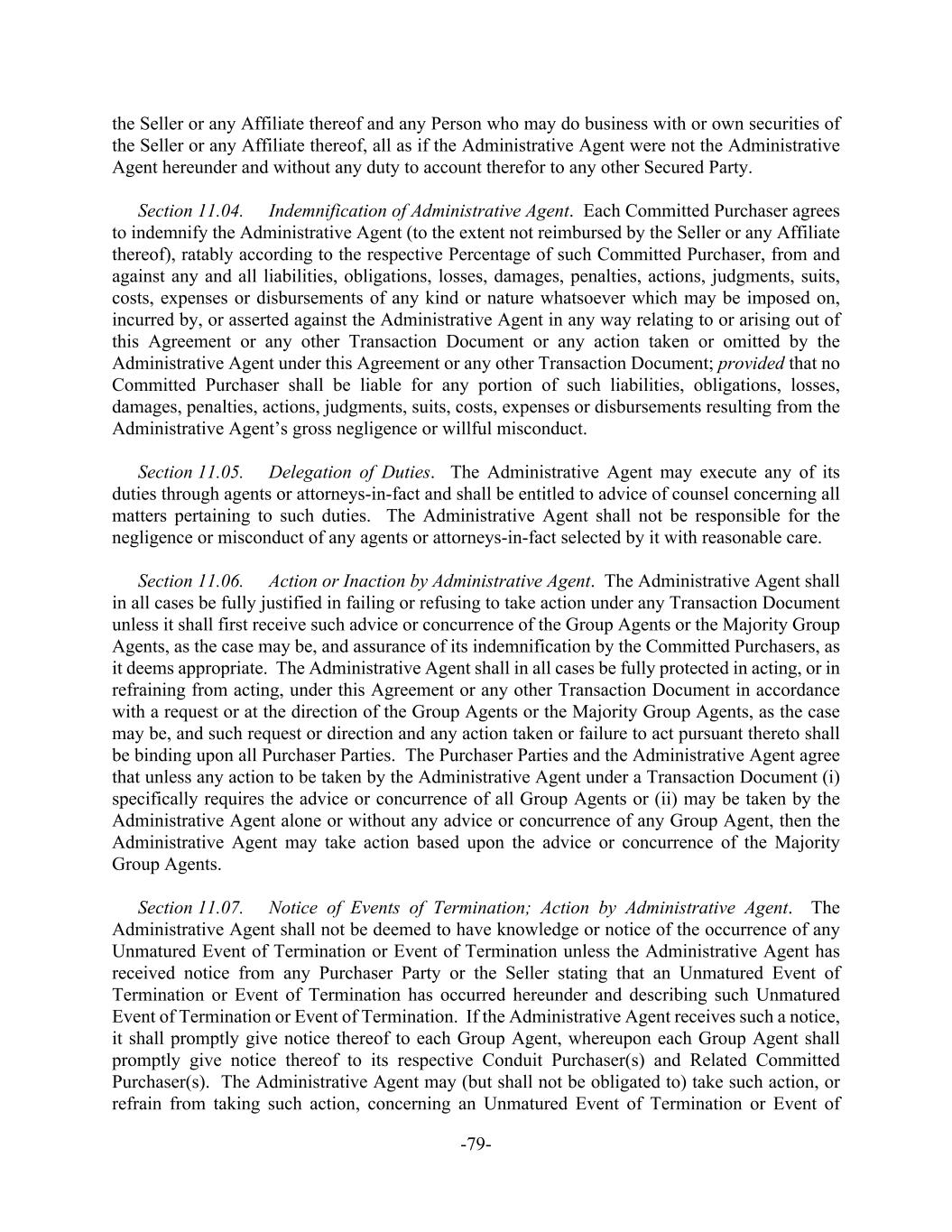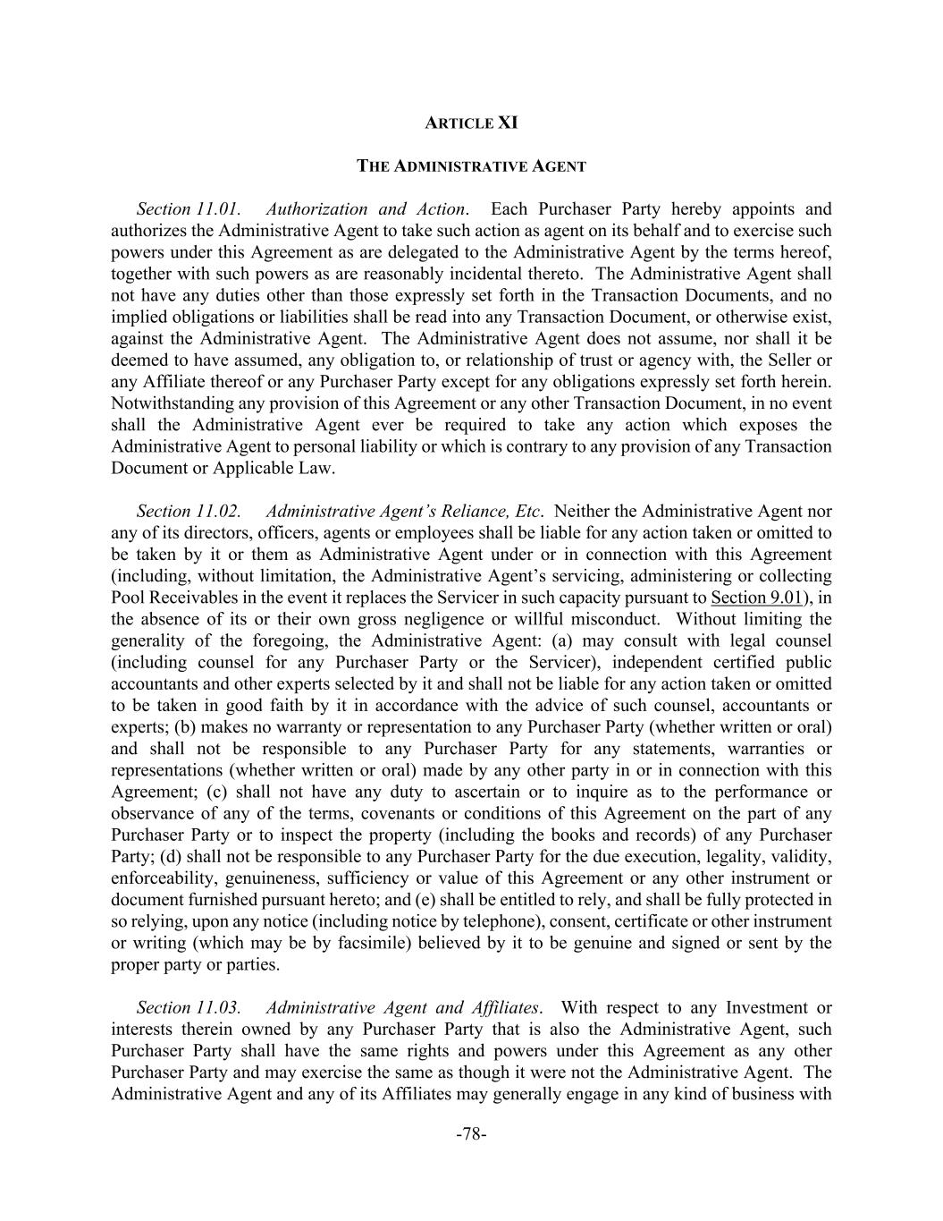 -78- ARTICLE XI THE ADMINISTRATIVE AGENT Section 11.01. Authorization and Action. Each Purchaser Party hereby appoints and authorizes the Administrative Agent to take such action as agent on its behalf and to exercise such powers under this Agreement as are delegated to the Administrative Agent by the terms hereof, together with such powers as are reasonably incidental thereto. The Administrative Agent shall not have any duties other than those expressly set forth in the Transaction Documents, and no implied obligations or liabilities shall be read into any Transaction Document, or otherwise exist, against the Administrative Agent. The Administrative Agent does not assume, nor shall it be deemed to have assumed, any obligation to, or relationship of trust or agency with, the Seller or any Affiliate thereof or any Purchaser Party except for any obligations expressly set forth herein. Notwithstanding any provision of this Agreement or any other Transaction Document, in no event shall the Administrative Agent ever be required to take any action which exposes the Administrative Agent to personal liability or which is contrary to any provision of any Transaction Document or Applicable Law. Section 11.02. Administrative Agent’s Reliance, Etc. Neither the Administrative Agent nor any of its directors, officers, agents or employees shall be liable for any action taken or omitted to be taken by it or them as Administrative Agent under or in connection with this Agreement (including, without limitation, the Administrative Agent’s servicing, administering or collecting Pool Receivables in the event it replaces the Servicer in such capacity pursuant to Section 9.01), in the absence of its or their own gross negligence or willful misconduct. Without limiting the generality of the foregoing, the Administrative Agent: (a) may consult with legal counsel (including counsel for any Purchaser Party or the Servicer), independent certified public accountants and other experts selected by it and shall not be liable for any action taken or omitted to be taken in good faith by it in accordance with the advice of such counsel, accountants or experts; (b) makes no warranty or representation to any Purchaser Party (whether written or oral) and shall not be responsible to any Purchaser Party for any statements, warranties or representations (whether written or oral) made by any other party in or in connection with this Agreement; (c) shall not have any duty to ascertain or to inquire as to the performance or observance of any of the terms, covenants or conditions of this Agreement on the part of any Purchaser Party or to inspect the property (including the books and records) of any Purchaser Party; (d) shall not be responsible to any Purchaser Party for the due execution, legality, validity, enforceability, genuineness, sufficiency or value of this Agreement or any other instrument or document furnished pursuant hereto; and (e) shall be entitled to rely, and shall be fully protected in so relying, upon any notice (including notice by telephone), consent, certificate or other instrument or writing (which may be by facsimile) believed by it to be genuine and signed or sent by the proper party or parties. Section 11.03. Administrative Agent and Affiliates. With respect to any Investment or interests therein owned by any Purchaser Party that is also the Administrative Agent, such Purchaser Party shall have the same rights and powers under this Agreement as any other Purchaser Party and may exercise the same as though it were not the Administrative Agent. The Administrative Agent and any of its Affiliates may generally engage in any kind of business with