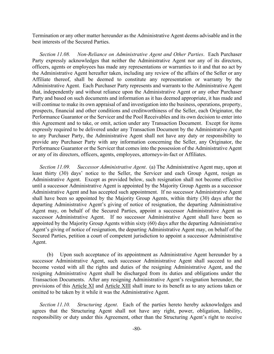 -80- Termination or any other matter hereunder as the Administrative Agent deems advisable and in the best interests of the Secured Parties. Section 11.08. Non-Reliance on Administrative Agent and Other Parties. Each Purchaser Party expressly acknowledges that neither the Administrative Agent nor any of its directors, officers, agents or employees has made any representations or warranties to it and that no act by the Administrative Agent hereafter taken, including any review of the affairs of the Seller or any Affiliate thereof, shall be deemed to constitute any representation or warranty by the Administrative Agent. Each Purchaser Party represents and warrants to the Administrative Agent that, independently and without reliance upon the Administrative Agent or any other Purchaser Party and based on such documents and information as it has deemed appropriate, it has made and will continue to make its own appraisal of and investigation into the business, operations, property, prospects, financial and other conditions and creditworthiness of the Seller, each Originator, the Performance Guarantor or the Servicer and the Pool Receivables and its own decision to enter into this Agreement and to take, or omit, action under any Transaction Document. Except for items expressly required to be delivered under any Transaction Document by the Administrative Agent to any Purchaser Party, the Administrative Agent shall not have any duty or responsibility to provide any Purchaser Party with any information concerning the Seller, any Originator, the Performance Guarantor or the Servicer that comes into the possession of the Administrative Agent or any of its directors, officers, agents, employees, attorneys-in-fact or Affiliates. Section 11.09. Successor Administrative Agent. (a) The Administrative Agent may, upon at least thirty (30) days’ notice to the Seller, the Servicer and each Group Agent, resign as Administrative Agent. Except as provided below, such resignation shall not become effective until a successor Administrative Agent is appointed by the Majority Group Agents as a successor Administrative Agent and has accepted such appointment. If no successor Administrative Agent shall have been so appointed by the Majority Group Agents, within thirty (30) days after the departing Administrative Agent’s giving of notice of resignation, the departing Administrative Agent may, on behalf of the Secured Parties, appoint a successor Administrative Agent as successor Administrative Agent. If no successor Administrative Agent shall have been so appointed by the Majority Group Agents within sixty (60) days after the departing Administrative Agent’s giving of notice of resignation, the departing Administrative Agent may, on behalf of the Secured Parties, petition a court of competent jurisdiction to appoint a successor Administrative Agent. (b) Upon such acceptance of its appointment as Administrative Agent hereunder by a successor Administrative Agent, such successor Administrative Agent shall succeed to and become vested with all the rights and duties of the resigning Administrative Agent, and the resigning Administrative Agent shall be discharged from its duties and obligations under the Transaction Documents. After any resigning Administrative Agent’s resignation hereunder, the provisions of this Article XI and Article XIII shall inure to its benefit as to any actions taken or omitted to be taken by it while it was the Administrative Agent. Section 11.10. Structuring Agent. Each of the parties hereto hereby acknowledges and agrees that the Structuring Agent shall not have any right, power, obligation, liability, responsibility or duty under this Agreement, other than the Structuring Agent’s right to receive