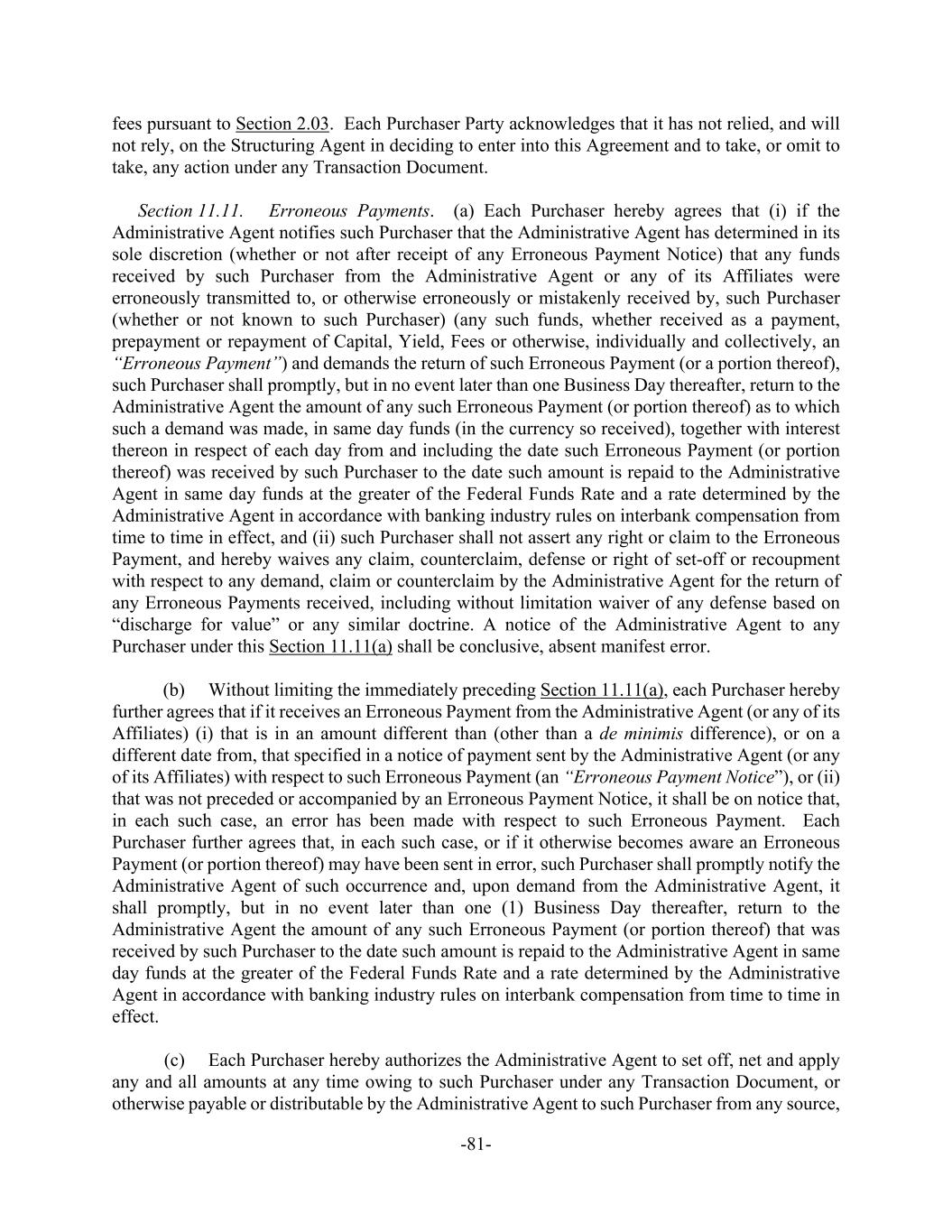 -81- fees pursuant to Section 2.03. Each Purchaser Party acknowledges that it has not relied, and will not rely, on the Structuring Agent in deciding to enter into this Agreement and to take, or omit to take, any action under any Transaction Document. Section 11.11. Erroneous Payments. (a) Each Purchaser hereby agrees that (i) if the Administrative Agent notifies such Purchaser that the Administrative Agent has determined in its sole discretion (whether or not after receipt of any Erroneous Payment Notice) that any funds received by such Purchaser from the Administrative Agent or any of its Affiliates were erroneously transmitted to, or otherwise erroneously or mistakenly received by, such Purchaser (whether or not known to such Purchaser) (any such funds, whether received as a payment, prepayment or repayment of Capital, Yield, Fees or otherwise, individually and collectively, an “Erroneous Payment”) and demands the return of such Erroneous Payment (or a portion thereof), such Purchaser shall promptly, but in no event later than one Business Day thereafter, return to the Administrative Agent the amount of any such Erroneous Payment (or portion thereof) as to which such a demand was made, in same day funds (in the currency so received), together with interest thereon in respect of each day from and including the date such Erroneous Payment (or portion thereof) was received by such Purchaser to the date such amount is repaid to the Administrative Agent in same day funds at the greater of the Federal Funds Rate and a rate determined by the Administrative Agent in accordance with banking industry rules on interbank compensation from time to time in effect, and (ii) such Purchaser shall not assert any right or claim to the Erroneous Payment, and hereby waives any claim, counterclaim, defense or right of set-off or recoupment with respect to any demand, claim or counterclaim by the Administrative Agent for the return of any Erroneous Payments received, including without limitation waiver of any defense based on “discharge for value” or any similar doctrine. A notice of the Administrative Agent to any Purchaser under this Section 11.11(a) shall be conclusive, absent manifest error. (b) Without limiting the immediately preceding Section 11.11(a), each Purchaser hereby further agrees that if it receives an Erroneous Payment from the Administrative Agent (or any of its Affiliates) (i) that is in an amount different than (other than a de minimis difference), or on a different date from, that specified in a notice of payment sent by the Administrative Agent (or any of its Affiliates) with respect to such Erroneous Payment (an “Erroneous Payment Notice”), or (ii) that was not preceded or accompanied by an Erroneous Payment Notice, it shall be on notice that, in each such case, an error has been made with respect to such Erroneous Payment. Each Purchaser further agrees that, in each such case, or if it otherwise becomes aware an Erroneous Payment (or portion thereof) may have been sent in error, such Purchaser shall promptly notify the Administrative Agent of such occurrence and, upon demand from the Administrative Agent, it shall promptly, but in no event later than one (1) Business Day thereafter, return to the Administrative Agent the amount of any such Erroneous Payment (or portion thereof) that was received by such Purchaser to the date such amount is repaid to the Administrative Agent in same day funds at the greater of the Federal Funds Rate and a rate determined by the Administrative Agent in accordance with banking industry rules on interbank compensation from time to time in effect. (c) Each Purchaser hereby authorizes the Administrative Agent to set off, net and apply any and all amounts at any time owing to such Purchaser under any Transaction Document, or otherwise payable or distributable by the Administrative Agent to such Purchaser from any source,
