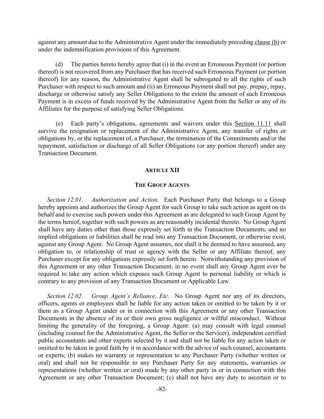 -82- against any amount due to the Administrative Agent under the immediately preceding clause (b) or under the indemnification provisions of this Agreement. (d) The parties hereto hereby agree that (i) in the event an Erroneous Payment (or portion thereof) is not recovered from any Purchaser that has received such Erroneous Payment (or portion thereof) for any reason, the Administrative Agent shall be subrogated to all the rights of such Purchaser with respect to such amount and (ii) an Erroneous Payment shall not pay, prepay, repay, discharge or otherwise satisfy any Seller Obligations to the extent the amount of such Erroneous Payment is in excess of funds received by the Administrative Agent from the Seller or any of its Affiliates for the purpose of satisfying Seller Obligations. (e) Each party’s obligations, agreements and waivers under this Section 11.11 shall survive the resignation or replacement of the Administrative Agent, any transfer of rights or obligations by, or the replacement of, a Purchaser, the termination of the Commitments and/or the repayment, satisfaction or discharge of all Seller Obligations (or any portion thereof) under any Transaction Document. ARTICLE XII THE GROUP AGENTS Section 12.01. Authorization and Action. Each Purchaser Party that belongs to a Group hereby appoints and authorizes the Group Agent for such Group to take such action as agent on its behalf and to exercise such powers under this Agreement as are delegated to such Group Agent by the terms hereof, together with such powers as are reasonably incidental thereto. No Group Agent shall have any duties other than those expressly set forth in the Transaction Documents, and no implied obligations or liabilities shall be read into any Transaction Document, or otherwise exist, against any Group Agent. No Group Agent assumes, nor shall it be deemed to have assumed, any obligation to, or relationship of trust or agency with the Seller or any Affiliate thereof, any Purchaser except for any obligations expressly set forth herein. Notwithstanding any provision of this Agreement or any other Transaction Document, in no event shall any Group Agent ever be required to take any action which exposes such Group Agent to personal liability or which is contrary to any provision of any Transaction Document or Applicable Law. Section 12.02. Group Agent’s Reliance, Etc. No Group Agent nor any of its directors, officers, agents or employees shall be liable for any action taken or omitted to be taken by it or them as a Group Agent under or in connection with this Agreement or any other Transaction Documents in the absence of its or their own gross negligence or willful misconduct. Without limiting the generality of the foregoing, a Group Agent: (a) may consult with legal counsel (including counsel for the Administrative Agent, the Seller or the Servicer), independent certified public accountants and other experts selected by it and shall not be liable for any action taken or omitted to be taken in good faith by it in accordance with the advice of such counsel, accountants or experts; (b) makes no warranty or representation to any Purchaser Party (whether written or oral) and shall not be responsible to any Purchaser Party for any statements, warranties or representations (whether written or oral) made by any other party in or in connection with this Agreement or any other Transaction Document; (c) shall not have any duty to ascertain or to