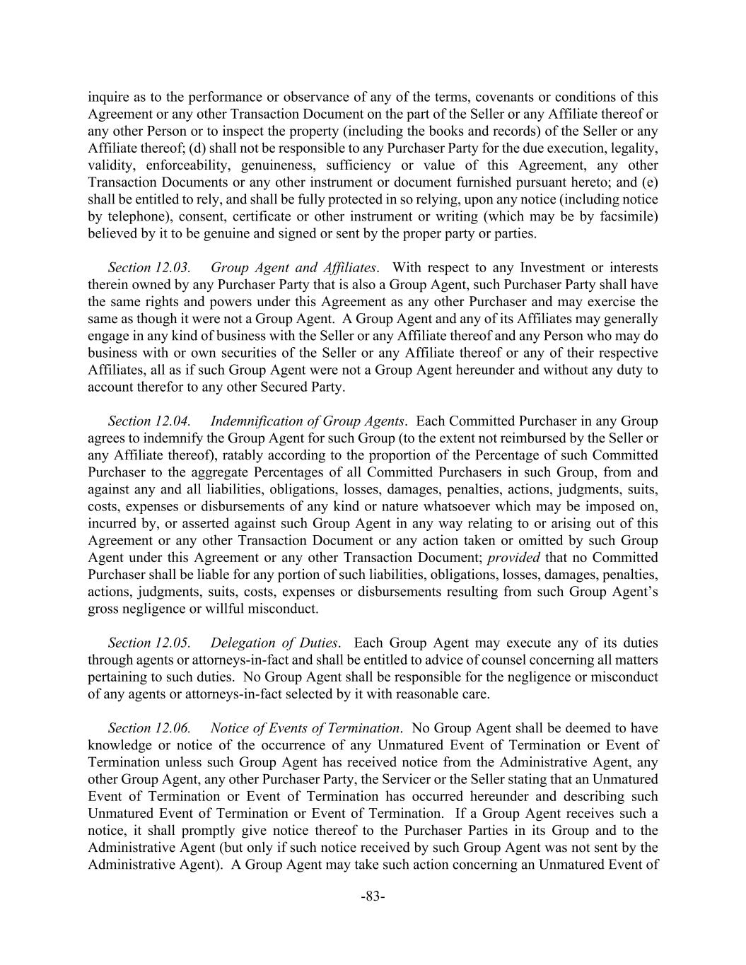 -83- inquire as to the performance or observance of any of the terms, covenants or conditions of this Agreement or any other Transaction Document on the part of the Seller or any Affiliate thereof or any other Person or to inspect the property (including the books and records) of the Seller or any Affiliate thereof; (d) shall not be responsible to any Purchaser Party for the due execution, legality, validity, enforceability, genuineness, sufficiency or value of this Agreement, any other Transaction Documents or any other instrument or document furnished pursuant hereto; and (e) shall be entitled to rely, and shall be fully protected in so relying, upon any notice (including notice by telephone), consent, certificate or other instrument or writing (which may be by facsimile) believed by it to be genuine and signed or sent by the proper party or parties. Section 12.03. Group Agent and Affiliates. With respect to any Investment or interests therein owned by any Purchaser Party that is also a Group Agent, such Purchaser Party shall have the same rights and powers under this Agreement as any other Purchaser and may exercise the same as though it were not a Group Agent. A Group Agent and any of its Affiliates may generally engage in any kind of business with the Seller or any Affiliate thereof and any Person who may do business with or own securities of the Seller or any Affiliate thereof or any of their respective Affiliates, all as if such Group Agent were not a Group Agent hereunder and without any duty to account therefor to any other Secured Party. Section 12.04. Indemnification of Group Agents. Each Committed Purchaser in any Group agrees to indemnify the Group Agent for such Group (to the extent not reimbursed by the Seller or any Affiliate thereof), ratably according to the proportion of the Percentage of such Committed Purchaser to the aggregate Percentages of all Committed Purchasers in such Group, from and against any and all liabilities, obligations, losses, damages, penalties, actions, judgments, suits, costs, expenses or disbursements of any kind or nature whatsoever which may be imposed on, incurred by, or asserted against such Group Agent in any way relating to or arising out of this Agreement or any other Transaction Document or any action taken or omitted by such Group Agent under this Agreement or any other Transaction Document; provided that no Committed Purchaser shall be liable for any portion of such liabilities, obligations, losses, damages, penalties, actions, judgments, suits, costs, expenses or disbursements resulting from such Group Agent’s gross negligence or willful misconduct. Section 12.05. Delegation of Duties. Each Group Agent may execute any of its duties through agents or attorneys-in-fact and shall be entitled to advice of counsel concerning all matters pertaining to such duties. No Group Agent shall be responsible for the negligence or misconduct of any agents or attorneys-in-fact selected by it with reasonable care. Section 12.06. Notice of Events of Termination. No Group Agent shall be deemed to have knowledge or notice of the occurrence of any Unmatured Event of Termination or Event of Termination unless such Group Agent has received notice from the Administrative Agent, any other Group Agent, any other Purchaser Party, the Servicer or the Seller stating that an Unmatured Event of Termination or Event of Termination has occurred hereunder and describing such Unmatured Event of Termination or Event of Termination. If a Group Agent receives such a notice, it shall promptly give notice thereof to the Purchaser Parties in its Group and to the Administrative Agent (but only if such notice received by such Group Agent was not sent by the Administrative Agent). A Group Agent may take such action concerning an Unmatured Event of