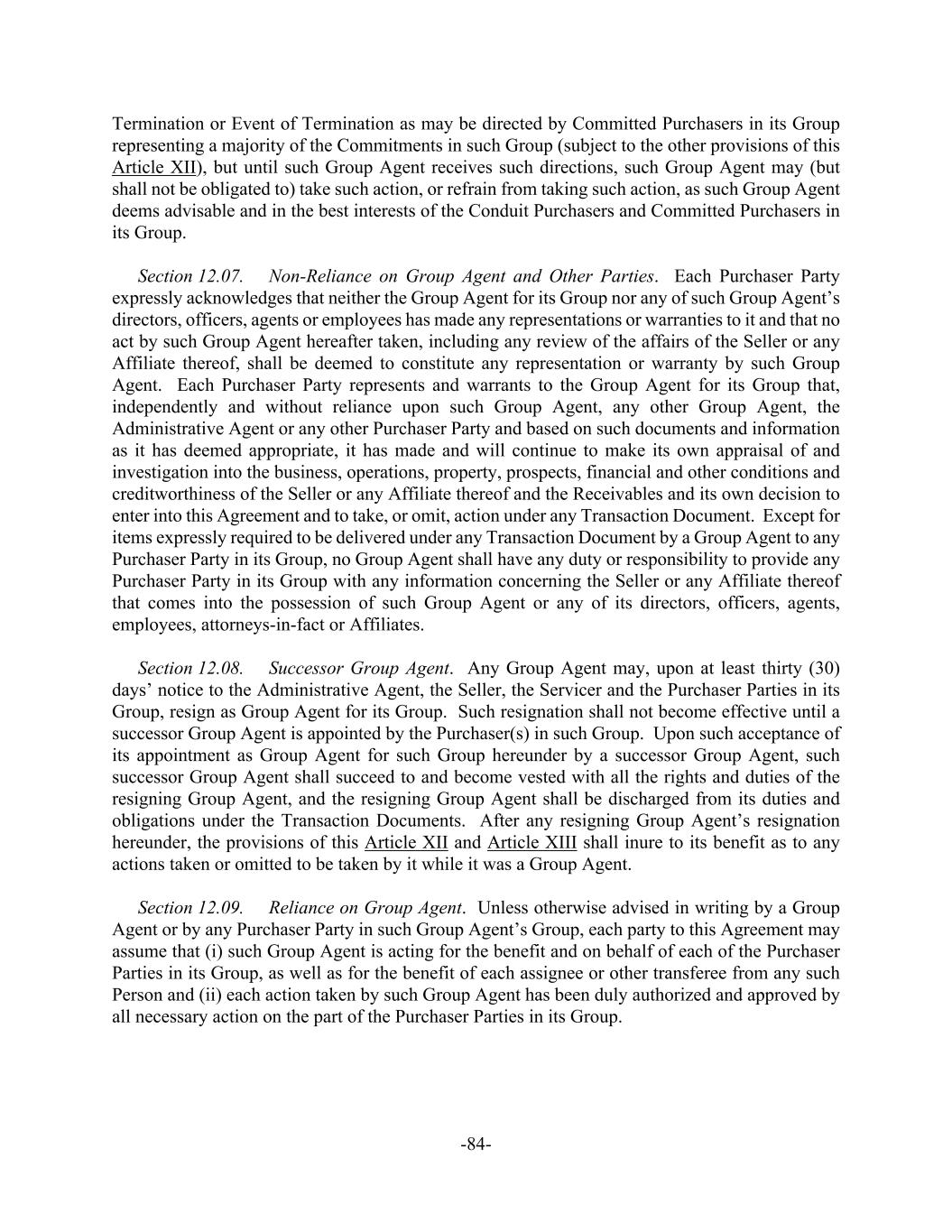 -84- Termination or Event of Termination as may be directed by Committed Purchasers in its Group representing a majority of the Commitments in such Group (subject to the other provisions of this Article XII), but until such Group Agent receives such directions, such Group Agent may (but shall not be obligated to) take such action, or refrain from taking such action, as such Group Agent deems advisable and in the best interests of the Conduit Purchasers and Committed Purchasers in its Group. Section 12.07. Non-Reliance on Group Agent and Other Parties. Each Purchaser Party expressly acknowledges that neither the Group Agent for its Group nor any of such Group Agent’s directors, officers, agents or employees has made any representations or warranties to it and that no act by such Group Agent hereafter taken, including any review of the affairs of the Seller or any Affiliate thereof, shall be deemed to constitute any representation or warranty by such Group Agent. Each Purchaser Party represents and warrants to the Group Agent for its Group that, independently and without reliance upon such Group Agent, any other Group Agent, the Administrative Agent or any other Purchaser Party and based on such documents and information as it has deemed appropriate, it has made and will continue to make its own appraisal of and investigation into the business, operations, property, prospects, financial and other conditions and creditworthiness of the Seller or any Affiliate thereof and the Receivables and its own decision to enter into this Agreement and to take, or omit, action under any Transaction Document. Except for items expressly required to be delivered under any Transaction Document by a Group Agent to any Purchaser Party in its Group, no Group Agent shall have any duty or responsibility to provide any Purchaser Party in its Group with any information concerning the Seller or any Affiliate thereof that comes into the possession of such Group Agent or any of its directors, officers, agents, employees, attorneys-in-fact or Affiliates. Section 12.08. Successor Group Agent. Any Group Agent may, upon at least thirty (30) days’ notice to the Administrative Agent, the Seller, the Servicer and the Purchaser Parties in its Group, resign as Group Agent for its Group. Such resignation shall not become effective until a successor Group Agent is appointed by the Purchaser(s) in such Group. Upon such acceptance of its appointment as Group Agent for such Group hereunder by a successor Group Agent, such successor Group Agent shall succeed to and become vested with all the rights and duties of the resigning Group Agent, and the resigning Group Agent shall be discharged from its duties and obligations under the Transaction Documents. After any resigning Group Agent’s resignation hereunder, the provisions of this Article XII and Article XIII shall inure to its benefit as to any actions taken or omitted to be taken by it while it was a Group Agent. Section 12.09. Reliance on Group Agent. Unless otherwise advised in writing by a Group Agent or by any Purchaser Party in such Group Agent’s Group, each party to this Agreement may assume that (i) such Group Agent is acting for the benefit and on behalf of each of the Purchaser Parties in its Group, as well as for the benefit of each assignee or other transferee from any such Person and (ii) each action taken by such Group Agent has been duly authorized and approved by all necessary action on the part of the Purchaser Parties in its Group.