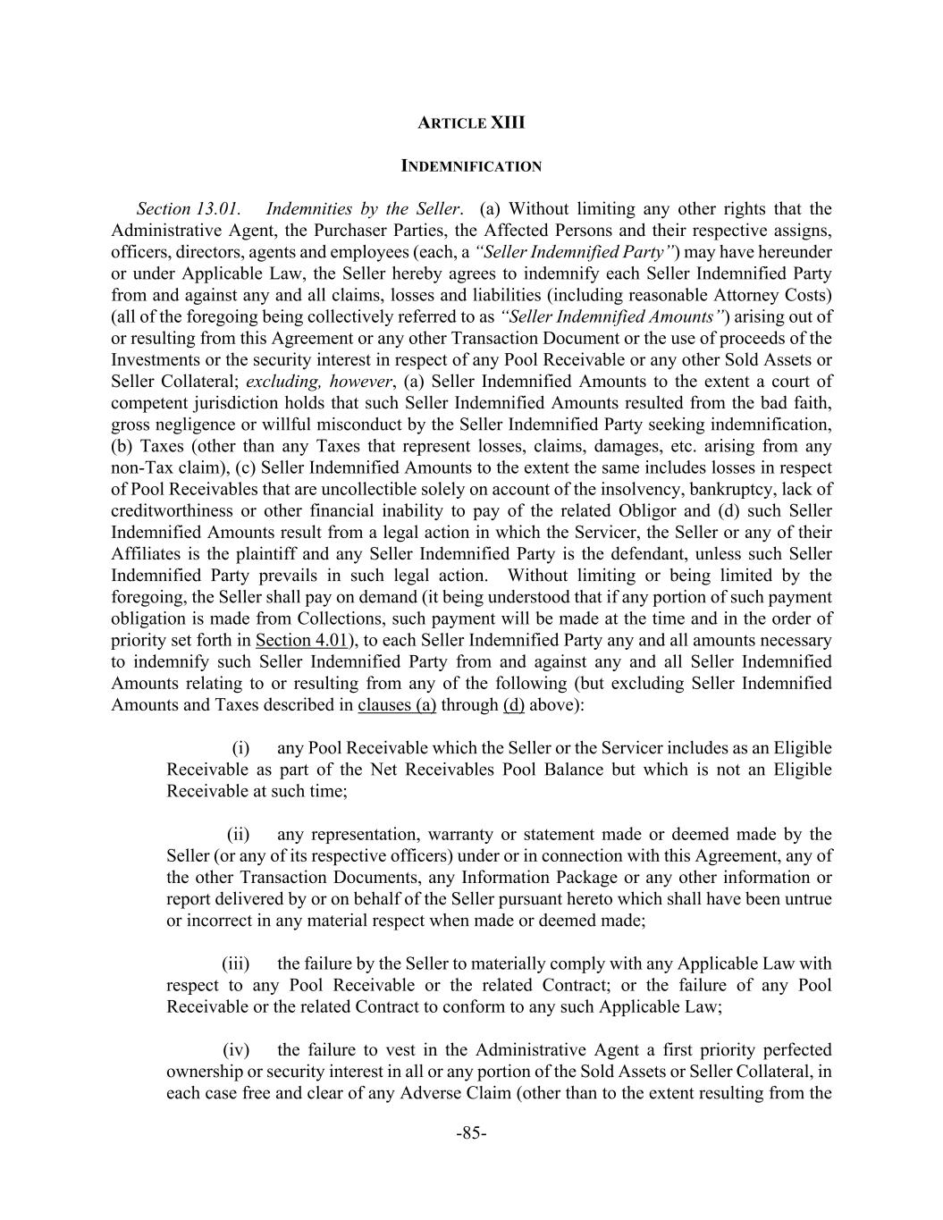 -85- ARTICLE XIII INDEMNIFICATION Section 13.01. Indemnities by the Seller. (a) Without limiting any other rights that the Administrative Agent, the Purchaser Parties, the Affected Persons and their respective assigns, officers, directors, agents and employees (each, a “Seller Indemnified Party”) may have hereunder or under Applicable Law, the Seller hereby agrees to indemnify each Seller Indemnified Party from and against any and all claims, losses and liabilities (including reasonable Attorney Costs) (all of the foregoing being collectively referred to as “Seller Indemnified Amounts”) arising out of or resulting from this Agreement or any other Transaction Document or the use of proceeds of the Investments or the security interest in respect of any Pool Receivable or any other Sold Assets or Seller Collateral; excluding, however, (a) Seller Indemnified Amounts to the extent a court of competent jurisdiction holds that such Seller Indemnified Amounts resulted from the bad faith, gross negligence or willful misconduct by the Seller Indemnified Party seeking indemnification, (b) Taxes (other than any Taxes that represent losses, claims, damages, etc. arising from any non-Tax claim), (c) Seller Indemnified Amounts to the extent the same includes losses in respect of Pool Receivables that are uncollectible solely on account of the insolvency, bankruptcy, lack of creditworthiness or other financial inability to pay of the related Obligor and (d) such Seller Indemnified Amounts result from a legal action in which the Servicer, the Seller or any of their Affiliates is the plaintiff and any Seller Indemnified Party is the defendant, unless such Seller Indemnified Party prevails in such legal action. Without limiting or being limited by the foregoing, the Seller shall pay on demand (it being understood that if any portion of such payment obligation is made from Collections, such payment will be made at the time and in the order of priority set forth in Section 4.01), to each Seller Indemnified Party any and all amounts necessary to indemnify such Seller Indemnified Party from and against any and all Seller Indemnified Amounts relating to or resulting from any of the following (but excluding Seller Indemnified Amounts and Taxes described in clauses (a) through (d) above): (i) any Pool Receivable which the Seller or the Servicer includes as an Eligible Receivable as part of the Net Receivables Pool Balance but which is not an Eligible Receivable at such time; (ii) any representation, warranty or statement made or deemed made by the Seller (or any of its respective officers) under or in connection with this Agreement, any of the other Transaction Documents, any Information Package or any other information or report delivered by or on behalf of the Seller pursuant hereto which shall have been untrue or incorrect in any material respect when made or deemed made; (iii) the failure by the Seller to materially comply with any Applicable Law with respect to any Pool Receivable or the related Contract; or the failure of any Pool Receivable or the related Contract to conform to any such Applicable Law; (iv) the failure to vest in the Administrative Agent a first priority perfected ownership or security interest in all or any portion of the Sold Assets or Seller Collateral, in each case free and clear of any Adverse Claim (other than to the extent resulting from the