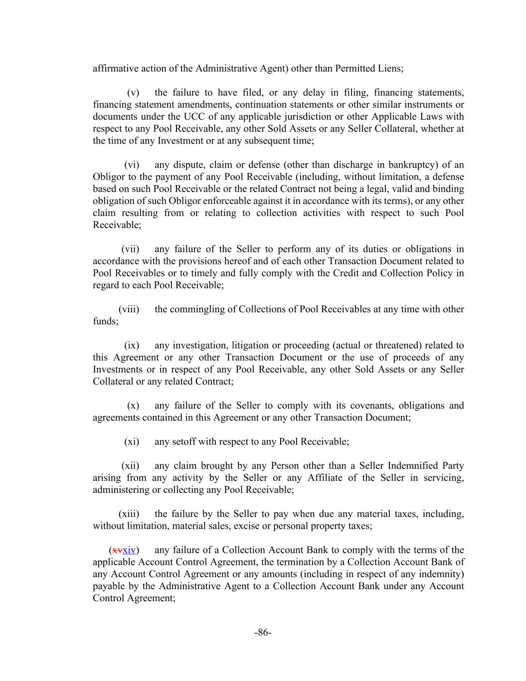 -86- affirmative action of the Administrative Agent) other than Permitted Liens; (v) the failure to have filed, or any delay in filing, financing statements, financing statement amendments, continuation statements or other similar instruments or documents under the UCC of any applicable jurisdiction or other Applicable Laws with respect to any Pool Receivable, any other Sold Assets or any Seller Collateral, whether at the time of any Investment or at any subsequent time; (vi) any dispute, claim or defense (other than discharge in bankruptcy) of an Obligor to the payment of any Pool Receivable (including, without limitation, a defense based on such Pool Receivable or the related Contract not being a legal, valid and binding obligation of such Obligor enforceable against it in accordance with its terms), or any other claim resulting from or relating to collection activities with respect to such Pool Receivable; (vii) any failure of the Seller to perform any of its duties or obligations in accordance with the provisions hereof and of each other Transaction Document related to Pool Receivables or to timely and fully comply with the Credit and Collection Policy in regard to each Pool Receivable; (viii) the commingling of Collections of Pool Receivables at any time with other funds; (ix) any investigation, litigation or proceeding (actual or threatened) related to this Agreement or any other Transaction Document or the use of proceeds of any Investments or in respect of any Pool Receivable, any other Sold Assets or any Seller Collateral or any related Contract; (x) any failure of the Seller to comply with its covenants, obligations and agreements contained in this Agreement or any other Transaction Document; (xi) any setoff with respect to any Pool Receivable; (xii) any claim brought by any Person other than a Seller Indemnified Party arising from any activity by the Seller or any Affiliate of the Seller in servicing, administering or collecting any Pool Receivable; (xiii) the failure by the Seller to pay when due any material taxes, including, without limitation, material sales, excise or personal property taxes; (xvxiv) any failure of a Collection Account Bank to comply with the terms of the applicable Account Control Agreement, the termination by a Collection Account Bank of any Account Control Agreement or any amounts (including in respect of any indemnity) payable by the Administrative Agent to a Collection Account Bank under any Account Control Agreement;