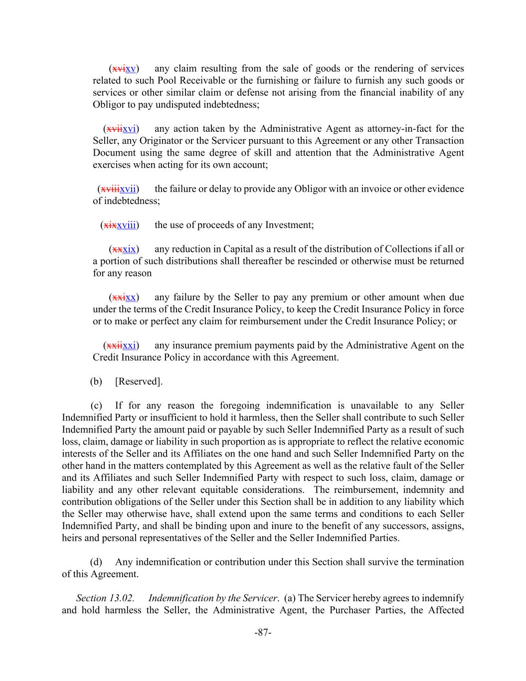 -87- (xvixv) any claim resulting from the sale of goods or the rendering of services related to such Pool Receivable or the furnishing or failure to furnish any such goods or services or other similar claim or defense not arising from the financial inability of any Obligor to pay undisputed indebtedness; (xviixvi) any action taken by the Administrative Agent as attorney-in-fact for the Seller, any Originator or the Servicer pursuant to this Agreement or any other Transaction Document using the same degree of skill and attention that the Administrative Agent exercises when acting for its own account; (xviiixvii) the failure or delay to provide any Obligor with an invoice or other evidence of indebtedness; (xixxviii) the use of proceeds of any Investment; (xxxix) any reduction in Capital as a result of the distribution of Collections if all or a portion of such distributions shall thereafter be rescinded or otherwise must be returned for any reason (xxixx) any failure by the Seller to pay any premium or other amount when due under the terms of the Credit Insurance Policy, to keep the Credit Insurance Policy in force or to make or perfect any claim for reimbursement under the Credit Insurance Policy; or (xxiixxi) any insurance premium payments paid by the Administrative Agent on the Credit Insurance Policy in accordance with this Agreement. (b) [Reserved]. (c) If for any reason the foregoing indemnification is unavailable to any Seller Indemnified Party or insufficient to hold it harmless, then the Seller shall contribute to such Seller Indemnified Party the amount paid or payable by such Seller Indemnified Party as a result of such loss, claim, damage or liability in such proportion as is appropriate to reflect the relative economic interests of the Seller and its Affiliates on the one hand and such Seller Indemnified Party on the other hand in the matters contemplated by this Agreement as well as the relative fault of the Seller and its Affiliates and such Seller Indemnified Party with respect to such loss, claim, damage or liability and any other relevant equitable considerations. The reimbursement, indemnity and contribution obligations of the Seller under this Section shall be in addition to any liability which the Seller may otherwise have, shall extend upon the same terms and conditions to each Seller Indemnified Party, and shall be binding upon and inure to the benefit of any successors, assigns, heirs and personal representatives of the Seller and the Seller Indemnified Parties. (d) Any indemnification or contribution under this Section shall survive the termination of this Agreement. Section 13.02. Indemnification by the Servicer. (a) The Servicer hereby agrees to indemnify and hold harmless the Seller, the Administrative Agent, the Purchaser Parties, the Affected