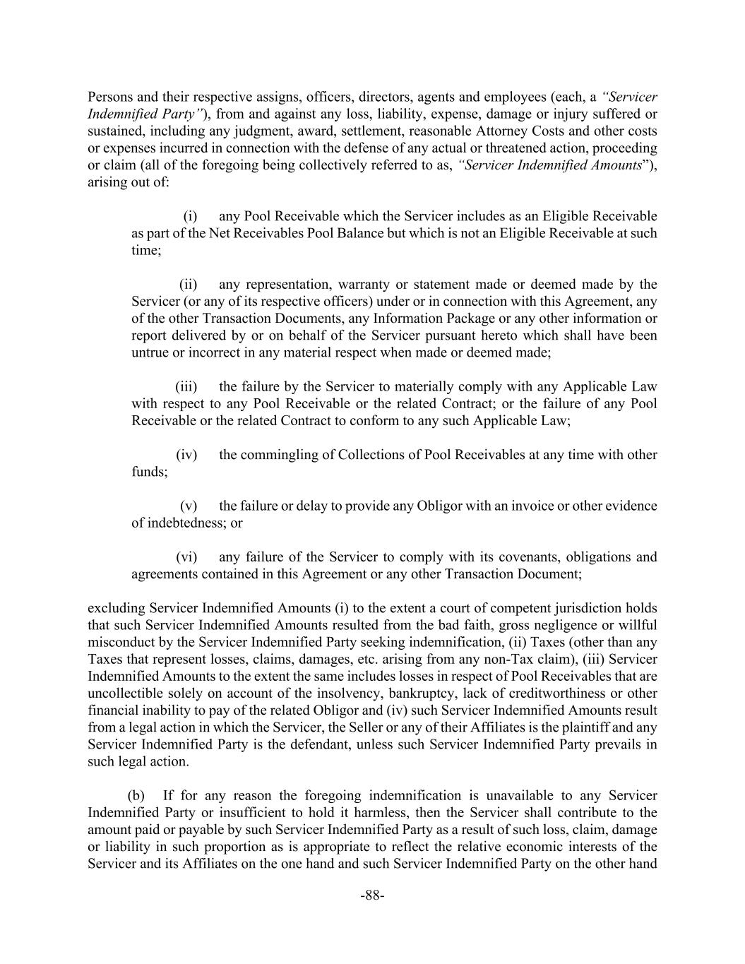 -88- Persons and their respective assigns, officers, directors, agents and employees (each, a “Servicer Indemnified Party”), from and against any loss, liability, expense, damage or injury suffered or sustained, including any judgment, award, settlement, reasonable Attorney Costs and other costs or expenses incurred in connection with the defense of any actual or threatened action, proceeding or claim (all of the foregoing being collectively referred to as, “Servicer Indemnified Amounts”), arising out of: (i) any Pool Receivable which the Servicer includes as an Eligible Receivable as part of the Net Receivables Pool Balance but which is not an Eligible Receivable at such time; (ii) any representation, warranty or statement made or deemed made by the Servicer (or any of its respective officers) under or in connection with this Agreement, any of the other Transaction Documents, any Information Package or any other information or report delivered by or on behalf of the Servicer pursuant hereto which shall have been untrue or incorrect in any material respect when made or deemed made; (iii) the failure by the Servicer to materially comply with any Applicable Law with respect to any Pool Receivable or the related Contract; or the failure of any Pool Receivable or the related Contract to conform to any such Applicable Law; (iv) the commingling of Collections of Pool Receivables at any time with other funds; (v) the failure or delay to provide any Obligor with an invoice or other evidence of indebtedness; or (vi) any failure of the Servicer to comply with its covenants, obligations and agreements contained in this Agreement or any other Transaction Document; excluding Servicer Indemnified Amounts (i) to the extent a court of competent jurisdiction holds that such Servicer Indemnified Amounts resulted from the bad faith, gross negligence or willful misconduct by the Servicer Indemnified Party seeking indemnification, (ii) Taxes (other than any Taxes that represent losses, claims, damages, etc. arising from any non-Tax claim), (iii) Servicer Indemnified Amounts to the extent the same includes losses in respect of Pool Receivables that are uncollectible solely on account of the insolvency, bankruptcy, lack of creditworthiness or other financial inability to pay of the related Obligor and (iv) such Servicer Indemnified Amounts result from a legal action in which the Servicer, the Seller or any of their Affiliates is the plaintiff and any Servicer Indemnified Party is the defendant, unless such Servicer Indemnified Party prevails in such legal action. (b) If for any reason the foregoing indemnification is unavailable to any Servicer Indemnified Party or insufficient to hold it harmless, then the Servicer shall contribute to the amount paid or payable by such Servicer Indemnified Party as a result of such loss, claim, damage or liability in such proportion as is appropriate to reflect the relative economic interests of the Servicer and its Affiliates on the one hand and such Servicer Indemnified Party on the other hand