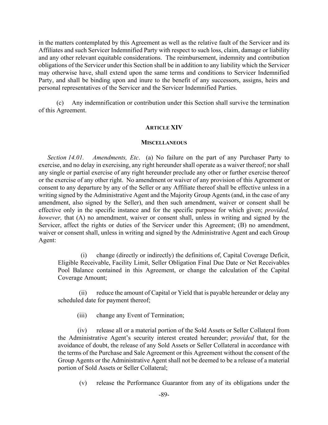 -89- in the matters contemplated by this Agreement as well as the relative fault of the Servicer and its Affiliates and such Servicer Indemnified Party with respect to such loss, claim, damage or liability and any other relevant equitable considerations. The reimbursement, indemnity and contribution obligations of the Servicer under this Section shall be in addition to any liability which the Servicer may otherwise have, shall extend upon the same terms and conditions to Servicer Indemnified Party, and shall be binding upon and inure to the benefit of any successors, assigns, heirs and personal representatives of the Servicer and the Servicer Indemnified Parties. (c) Any indemnification or contribution under this Section shall survive the termination of this Agreement. ARTICLE XIV MISCELLANEOUS Section 14.01. Amendments, Etc. (a) No failure on the part of any Purchaser Party to exercise, and no delay in exercising, any right hereunder shall operate as a waiver thereof; nor shall any single or partial exercise of any right hereunder preclude any other or further exercise thereof or the exercise of any other right. No amendment or waiver of any provision of this Agreement or consent to any departure by any of the Seller or any Affiliate thereof shall be effective unless in a writing signed by the Administrative Agent and the Majority Group Agents (and, in the case of any amendment, also signed by the Seller), and then such amendment, waiver or consent shall be effective only in the specific instance and for the specific purpose for which given; provided, however, that (A) no amendment, waiver or consent shall, unless in writing and signed by the Servicer, affect the rights or duties of the Servicer under this Agreement; (B) no amendment, waiver or consent shall, unless in writing and signed by the Administrative Agent and each Group Agent: (i) change (directly or indirectly) the definitions of, Capital Coverage Deficit, Eligible Receivable, Facility Limit, Seller Obligation Final Due Date or Net Receivables Pool Balance contained in this Agreement, or change the calculation of the Capital Coverage Amount; (ii) reduce the amount of Capital or Yield that is payable hereunder or delay any scheduled date for payment thereof; (iii) change any Event of Termination; (iv) release all or a material portion of the Sold Assets or Seller Collateral from the Administrative Agent’s security interest created hereunder; provided that, for the avoidance of doubt, the release of any Sold Assets or Seller Collateral in accordance with the terms of the Purchase and Sale Agreement or this Agreement without the consent of the Group Agents or the Administrative Agent shall not be deemed to be a release of a material portion of Sold Assets or Seller Collateral; (v) release the Performance Guarantor from any of its obligations under the