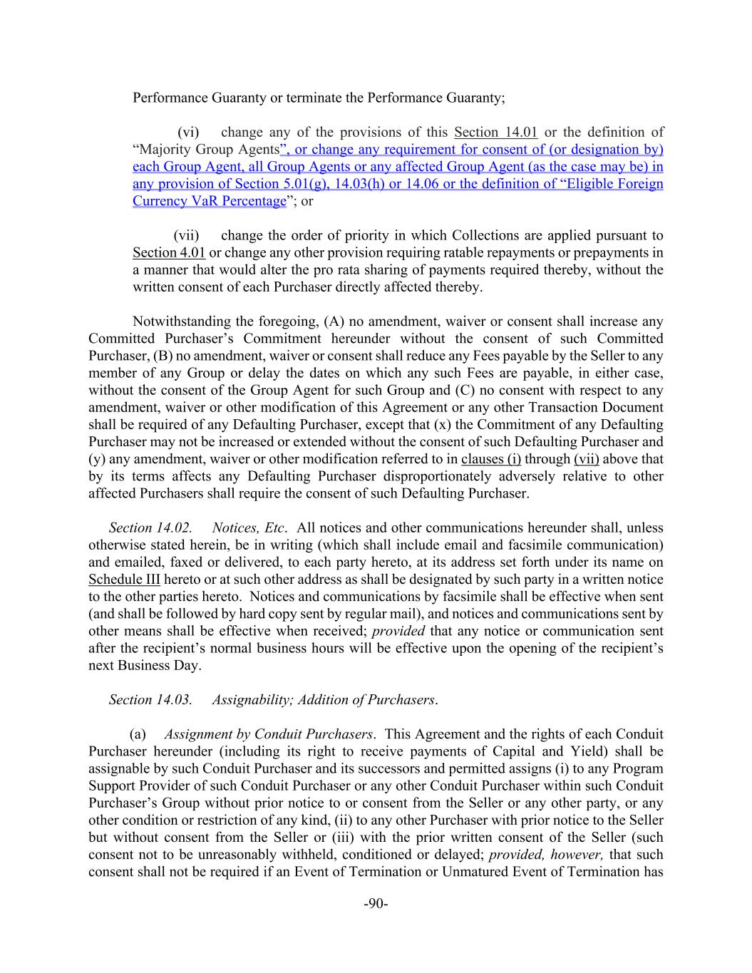-90- Performance Guaranty or terminate the Performance Guaranty; (vi) change any of the provisions of this Section 14.01 or the definition of “Majority Group Agents”, or change any requirement for consent of (or designation by) each Group Agent, all Group Agents or any affected Group Agent (as the case may be) in any provision of Section 5.01(g), 14.03(h) or 14.06 or the definition of “Eligible Foreign Currency VaR Percentage”; or (vii) change the order of priority in which Collections are applied pursuant to Section 4.01 or change any other provision requiring ratable repayments or prepayments in a manner that would alter the pro rata sharing of payments required thereby, without the written consent of each Purchaser directly affected thereby. Notwithstanding the foregoing, (A) no amendment, waiver or consent shall increase any Committed Purchaser’s Commitment hereunder without the consent of such Committed Purchaser, (B) no amendment, waiver or consent shall reduce any Fees payable by the Seller to any member of any Group or delay the dates on which any such Fees are payable, in either case, without the consent of the Group Agent for such Group and (C) no consent with respect to any amendment, waiver or other modification of this Agreement or any other Transaction Document shall be required of any Defaulting Purchaser, except that (x) the Commitment of any Defaulting Purchaser may not be increased or extended without the consent of such Defaulting Purchaser and (y) any amendment, waiver or other modification referred to in clauses (i) through (vii) above that by its terms affects any Defaulting Purchaser disproportionately adversely relative to other affected Purchasers shall require the consent of such Defaulting Purchaser. Section 14.02. Notices, Etc. All notices and other communications hereunder shall, unless otherwise stated herein, be in writing (which shall include email and facsimile communication) and emailed, faxed or delivered, to each party hereto, at its address set forth under its name on Schedule III hereto or at such other address as shall be designated by such party in a written notice to the other parties hereto. Notices and communications by facsimile shall be effective when sent (and shall be followed by hard copy sent by regular mail), and notices and communications sent by other means shall be effective when received; provided that any notice or communication sent after the recipient’s normal business hours will be effective upon the opening of the recipient’s next Business Day. Section 14.03. Assignability; Addition of Purchasers. (a) Assignment by Conduit Purchasers. This Agreement and the rights of each Conduit Purchaser hereunder (including its right to receive payments of Capital and Yield) shall be assignable by such Conduit Purchaser and its successors and permitted assigns (i) to any Program Support Provider of such Conduit Purchaser or any other Conduit Purchaser within such Conduit Purchaser’s Group without prior notice to or consent from the Seller or any other party, or any other condition or restriction of any kind, (ii) to any other Purchaser with prior notice to the Seller but without consent from the Seller or (iii) with the prior written consent of the Seller (such consent not to be unreasonably withheld, conditioned or delayed; provided, however, that such consent shall not be required if an Event of Termination or Unmatured Event of Termination has