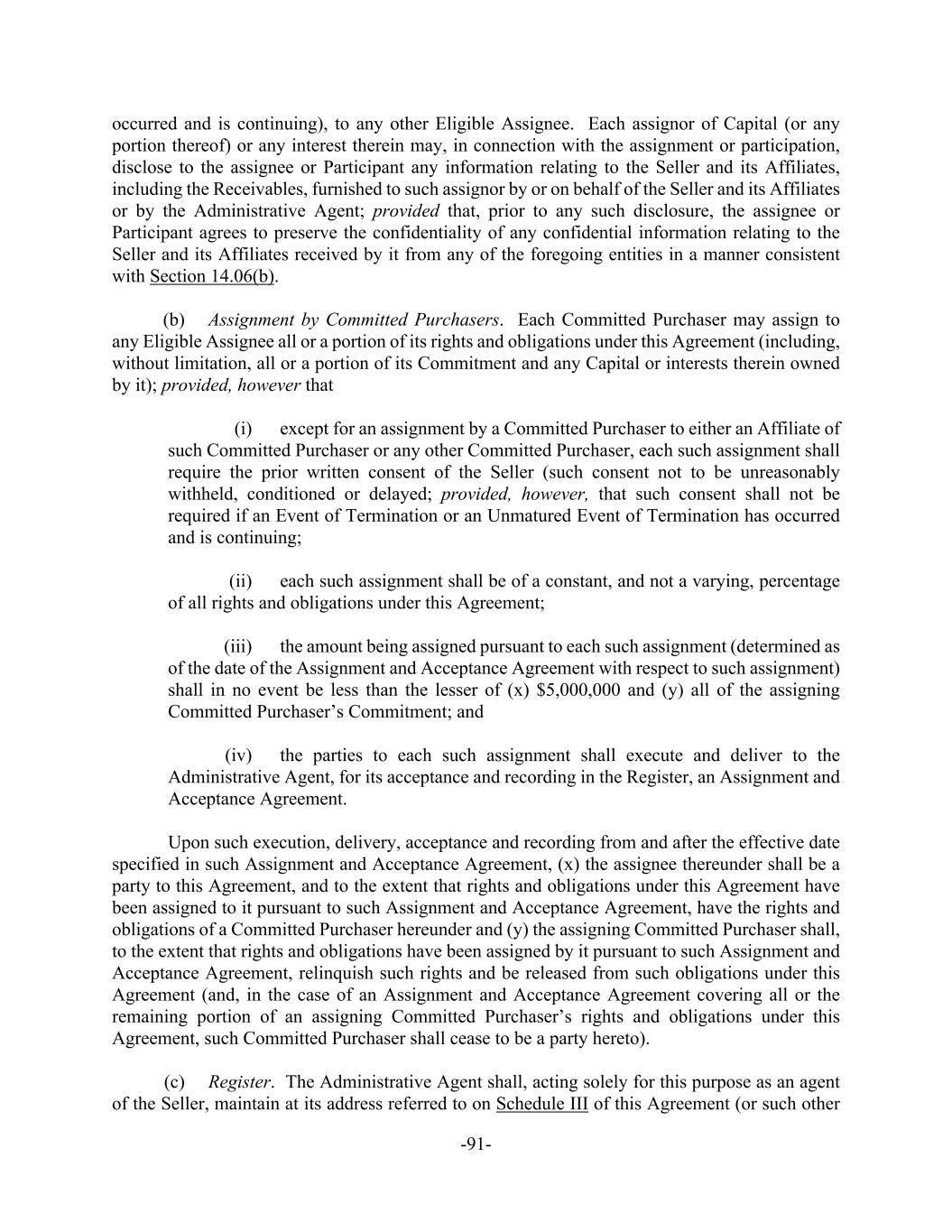 -91- occurred and is continuing), to any other Eligible Assignee. Each assignor of Capital (or any portion thereof) or any interest therein may, in connection with the assignment or participation, disclose to the assignee or Participant any information relating to the Seller and its Affiliates, including the Receivables, furnished to such assignor by or on behalf of the Seller and its Affiliates or by the Administrative Agent; provided that, prior to any such disclosure, the assignee or Participant agrees to preserve the confidentiality of any confidential information relating to the Seller and its Affiliates received by it from any of the foregoing entities in a manner consistent with Section 14.06(b). (b) Assignment by Committed Purchasers. Each Committed Purchaser may assign to any Eligible Assignee all or a portion of its rights and obligations under this Agreement (including, without limitation, all or a portion of its Commitment and any Capital or interests therein owned by it); provided, however that (i) except for an assignment by a Committed Purchaser to either an Affiliate of such Committed Purchaser or any other Committed Purchaser, each such assignment shall require the prior written consent of the Seller (such consent not to be unreasonably withheld, conditioned or delayed; provided, however, that such consent shall not be required if an Event of Termination or an Unmatured Event of Termination has occurred and is continuing; (ii) each such assignment shall be of a constant, and not a varying, percentage of all rights and obligations under this Agreement; (iii) the amount being assigned pursuant to each such assignment (determined as of the date of the Assignment and Acceptance Agreement with respect to such assignment) shall in no event be less than the lesser of (x) $5,000,000 and (y) all of the assigning Committed Purchaser’s Commitment; and (iv) the parties to each such assignment shall execute and deliver to the Administrative Agent, for its acceptance and recording in the Register, an Assignment and Acceptance Agreement. Upon such execution, delivery, acceptance and recording from and after the effective date specified in such Assignment and Acceptance Agreement, (x) the assignee thereunder shall be a party to this Agreement, and to the extent that rights and obligations under this Agreement have been assigned to it pursuant to such Assignment and Acceptance Agreement, have the rights and obligations of a Committed Purchaser hereunder and (y) the assigning Committed Purchaser shall, to the extent that rights and obligations have been assigned by it pursuant to such Assignment and Acceptance Agreement, relinquish such rights and be released from such obligations under this Agreement (and, in the case of an Assignment and Acceptance Agreement covering all or the remaining portion of an assigning Committed Purchaser’s rights and obligations under this Agreement, such Committed Purchaser shall cease to be a party hereto). (c) Register. The Administrative Agent shall, acting solely for this purpose as an agent of the Seller, maintain at its address referred to on Schedule III of this Agreement (or such other