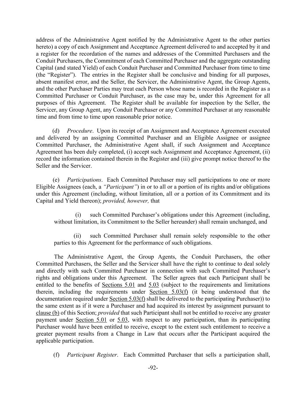 -92- address of the Administrative Agent notified by the Administrative Agent to the other parties hereto) a copy of each Assignment and Acceptance Agreement delivered to and accepted by it and a register for the recordation of the names and addresses of the Committed Purchasers and the Conduit Purchasers, the Commitment of each Committed Purchaser and the aggregate outstanding Capital (and stated Yield) of each Conduit Purchaser and Committed Purchaser from time to time (the “Register”). The entries in the Register shall be conclusive and binding for all purposes, absent manifest error, and the Seller, the Servicer, the Administrative Agent, the Group Agents, and the other Purchaser Parties may treat each Person whose name is recorded in the Register as a Committed Purchaser or Conduit Purchaser, as the case may be, under this Agreement for all purposes of this Agreement. The Register shall be available for inspection by the Seller, the Servicer, any Group Agent, any Conduit Purchaser or any Committed Purchaser at any reasonable time and from time to time upon reasonable prior notice. (d) Procedure. Upon its receipt of an Assignment and Acceptance Agreement executed and delivered by an assigning Committed Purchaser and an Eligible Assignee or assignee Committed Purchaser, the Administrative Agent shall, if such Assignment and Acceptance Agreement has been duly completed, (i) accept such Assignment and Acceptance Agreement, (ii) record the information contained therein in the Register and (iii) give prompt notice thereof to the Seller and the Servicer. (e) Participations. Each Committed Purchaser may sell participations to one or more Eligible Assignees (each, a “Participant”) in or to all or a portion of its rights and/or obligations under this Agreement (including, without limitation, all or a portion of its Commitment and its Capital and Yield thereon); provided, however, that (i) such Committed Purchaser’s obligations under this Agreement (including, without limitation, its Commitment to the Seller hereunder) shall remain unchanged, and (ii) such Committed Purchaser shall remain solely responsible to the other parties to this Agreement for the performance of such obligations. The Administrative Agent, the Group Agents, the Conduit Purchasers, the other Committed Purchasers, the Seller and the Servicer shall have the right to continue to deal solely and directly with such Committed Purchaser in connection with such Committed Purchaser’s rights and obligations under this Agreement. The Seller agrees that each Participant shall be entitled to the benefits of Sections 5.01 and 5.03 (subject to the requirements and limitations therein, including the requirements under Section 5.03(f) (it being understood that the documentation required under Section 5.03(f) shall be delivered to the participating Purchaser)) to the same extent as if it were a Purchaser and had acquired its interest by assignment pursuant to clause (b) of this Section; provided that such Participant shall not be entitled to receive any greater payment under Section 5.01 or 5.03, with respect to any participation, than its participating Purchaser would have been entitled to receive, except to the extent such entitlement to receive a greater payment results from a Change in Law that occurs after the Participant acquired the applicable participation. (f) Participant Register. Each Committed Purchaser that sells a participation shall,