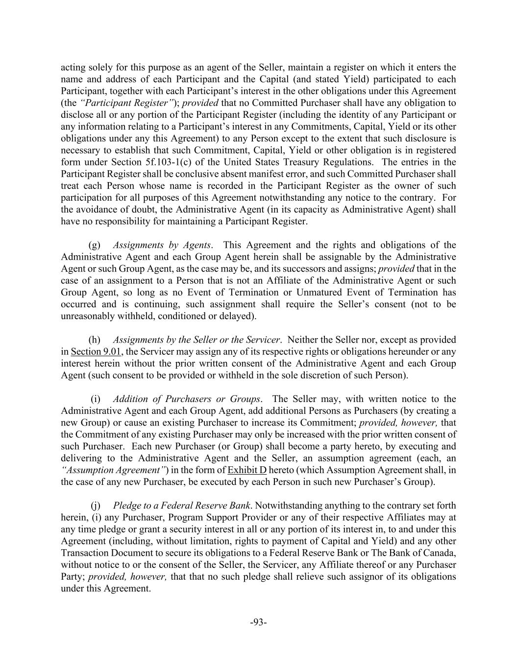 -93- acting solely for this purpose as an agent of the Seller, maintain a register on which it enters the name and address of each Participant and the Capital (and stated Yield) participated to each Participant, together with each Participant’s interest in the other obligations under this Agreement (the “Participant Register”); provided that no Committed Purchaser shall have any obligation to disclose all or any portion of the Participant Register (including the identity of any Participant or any information relating to a Participant’s interest in any Commitments, Capital, Yield or its other obligations under any this Agreement) to any Person except to the extent that such disclosure is necessary to establish that such Commitment, Capital, Yield or other obligation is in registered form under Section 5f.103-1(c) of the United States Treasury Regulations. The entries in the Participant Register shall be conclusive absent manifest error, and such Committed Purchaser shall treat each Person whose name is recorded in the Participant Register as the owner of such participation for all purposes of this Agreement notwithstanding any notice to the contrary. For the avoidance of doubt, the Administrative Agent (in its capacity as Administrative Agent) shall have no responsibility for maintaining a Participant Register. (g) Assignments by Agents. This Agreement and the rights and obligations of the Administrative Agent and each Group Agent herein shall be assignable by the Administrative Agent or such Group Agent, as the case may be, and its successors and assigns; provided that in the case of an assignment to a Person that is not an Affiliate of the Administrative Agent or such Group Agent, so long as no Event of Termination or Unmatured Event of Termination has occurred and is continuing, such assignment shall require the Seller’s consent (not to be unreasonably withheld, conditioned or delayed). (h) Assignments by the Seller or the Servicer. Neither the Seller nor, except as provided in Section 9.01, the Servicer may assign any of its respective rights or obligations hereunder or any interest herein without the prior written consent of the Administrative Agent and each Group Agent (such consent to be provided or withheld in the sole discretion of such Person). (i) Addition of Purchasers or Groups. The Seller may, with written notice to the Administrative Agent and each Group Agent, add additional Persons as Purchasers (by creating a new Group) or cause an existing Purchaser to increase its Commitment; provided, however, that the Commitment of any existing Purchaser may only be increased with the prior written consent of such Purchaser. Each new Purchaser (or Group) shall become a party hereto, by executing and delivering to the Administrative Agent and the Seller, an assumption agreement (each, an “Assumption Agreement”) in the form of Exhibit D hereto (which Assumption Agreement shall, in the case of any new Purchaser, be executed by each Person in such new Purchaser’s Group). (j) Pledge to a Federal Reserve Bank. Notwithstanding anything to the contrary set forth herein, (i) any Purchaser, Program Support Provider or any of their respective Affiliates may at any time pledge or grant a security interest in all or any portion of its interest in, to and under this Agreement (including, without limitation, rights to payment of Capital and Yield) and any other Transaction Document to secure its obligations to a Federal Reserve Bank or The Bank of Canada, without notice to or the consent of the Seller, the Servicer, any Affiliate thereof or any Purchaser Party; provided, however, that that no such pledge shall relieve such assignor of its obligations under this Agreement.