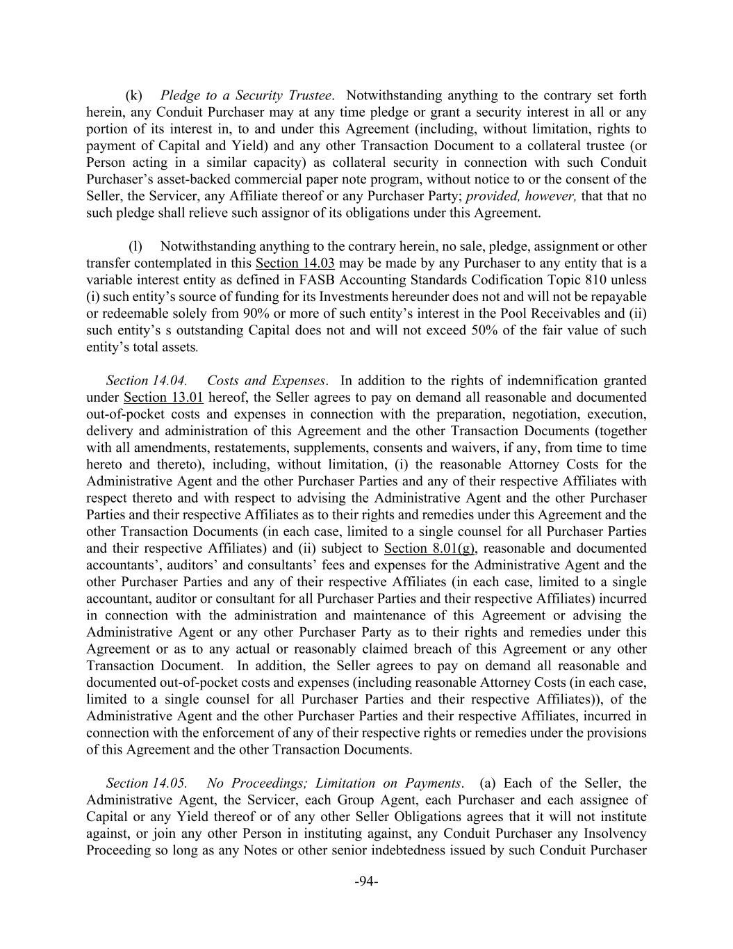-94- (k) Pledge to a Security Trustee. Notwithstanding anything to the contrary set forth herein, any Conduit Purchaser may at any time pledge or grant a security interest in all or any portion of its interest in, to and under this Agreement (including, without limitation, rights to payment of Capital and Yield) and any other Transaction Document to a collateral trustee (or Person acting in a similar capacity) as collateral security in connection with such Conduit Purchaser’s asset-backed commercial paper note program, without notice to or the consent of the Seller, the Servicer, any Affiliate thereof or any Purchaser Party; provided, however, that that no such pledge shall relieve such assignor of its obligations under this Agreement. (l) Notwithstanding anything to the contrary herein, no sale, pledge, assignment or other transfer contemplated in this Section 14.03 may be made by any Purchaser to any entity that is a variable interest entity as defined in FASB Accounting Standards Codification Topic 810 unless (i) such entity’s source of funding for its Investments hereunder does not and will not be repayable or redeemable solely from 90% or more of such entity’s interest in the Pool Receivables and (ii) such entity’s s outstanding Capital does not and will not exceed 50% of the fair value of such entity’s total assets. Section 14.04. Costs and Expenses. In addition to the rights of indemnification granted under Section 13.01 hereof, the Seller agrees to pay on demand all reasonable and documented out-of-pocket costs and expenses in connection with the preparation, negotiation, execution, delivery and administration of this Agreement and the other Transaction Documents (together with all amendments, restatements, supplements, consents and waivers, if any, from time to time hereto and thereto), including, without limitation, (i) the reasonable Attorney Costs for the Administrative Agent and the other Purchaser Parties and any of their respective Affiliates with respect thereto and with respect to advising the Administrative Agent and the other Purchaser Parties and their respective Affiliates as to their rights and remedies under this Agreement and the other Transaction Documents (in each case, limited to a single counsel for all Purchaser Parties and their respective Affiliates) and (ii) subject to Section 8.01(g), reasonable and documented accountants’, auditors’ and consultants’ fees and expenses for the Administrative Agent and the other Purchaser Parties and any of their respective Affiliates (in each case, limited to a single accountant, auditor or consultant for all Purchaser Parties and their respective Affiliates) incurred in connection with the administration and maintenance of this Agreement or advising the Administrative Agent or any other Purchaser Party as to their rights and remedies under this Agreement or as to any actual or reasonably claimed breach of this Agreement or any other Transaction Document. In addition, the Seller agrees to pay on demand all reasonable and documented out-of-pocket costs and expenses (including reasonable Attorney Costs (in each case, limited to a single counsel for all Purchaser Parties and their respective Affiliates)), of the Administrative Agent and the other Purchaser Parties and their respective Affiliates, incurred in connection with the enforcement of any of their respective rights or remedies under the provisions of this Agreement and the other Transaction Documents. Section 14.05. No Proceedings; Limitation on Payments. (a) Each of the Seller, the Administrative Agent, the Servicer, each Group Agent, each Purchaser and each assignee of Capital or any Yield thereof or of any other Seller Obligations agrees that it will not institute against, or join any other Person in instituting against, any Conduit Purchaser any Insolvency Proceeding so long as any Notes or other senior indebtedness issued by such Conduit Purchaser