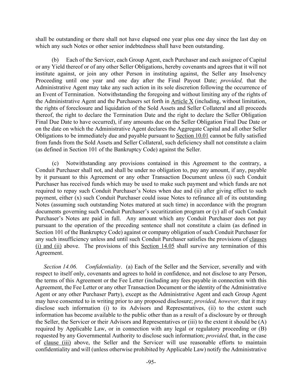 -95- shall be outstanding or there shall not have elapsed one year plus one day since the last day on which any such Notes or other senior indebtedness shall have been outstanding. (b) Each of the Servicer, each Group Agent, each Purchaser and each assignee of Capital or any Yield thereof or of any other Seller Obligations, hereby covenants and agrees that it will not institute against, or join any other Person in instituting against, the Seller any Insolvency Proceeding until one year and one day after the Final Payout Date; provided, that the Administrative Agent may take any such action in its sole discretion following the occurrence of an Event of Termination. Notwithstanding the foregoing and without limiting any of the rights of the Administrative Agent and the Purchasers set forth in Article X (including, without limitation, the rights of foreclosure and liquidation of the Sold Assets and Seller Collateral and all proceeds thereof, the right to declare the Termination Date and the right to declare the Seller Obligation Final Due Date to have occurred), if any amounts due on the Seller Obligation Final Due Date or on the date on which the Administrative Agent declares the Aggregate Capital and all other Seller Obligations to be immediately due and payable pursuant to Section 10.01 cannot be fully satisfied from funds from the Sold Assets and Seller Collateral, such deficiency shall not constitute a claim (as defined in Section 101 of the Bankruptcy Code) against the Seller. (c) Notwithstanding any provisions contained in this Agreement to the contrary, a Conduit Purchaser shall not, and shall be under no obligation to, pay any amount, if any, payable by it pursuant to this Agreement or any other Transaction Document unless (i) such Conduit Purchaser has received funds which may be used to make such payment and which funds are not required to repay such Conduit Purchaser’s Notes when due and (ii) after giving effect to such payment, either (x) such Conduit Purchaser could issue Notes to refinance all of its outstanding Notes (assuming such outstanding Notes matured at such time) in accordance with the program documents governing such Conduit Purchaser’s securitization program or (y) all of such Conduit Purchaser’s Notes are paid in full. Any amount which any Conduit Purchaser does not pay pursuant to the operation of the preceding sentence shall not constitute a claim (as defined in Section 101 of the Bankruptcy Code) against or company obligation of such Conduit Purchaser for any such insufficiency unless and until such Conduit Purchaser satisfies the provisions of clauses (i) and (ii) above. The provisions of this Section 14.05 shall survive any termination of this Agreement. Section 14.06. Confidentiality. (a) Each of the Seller and the Servicer, severally and with respect to itself only, covenants and agrees to hold in confidence, and not disclose to any Person, the terms of this Agreement or the Fee Letter (including any fees payable in connection with this Agreement, the Fee Letter or any other Transaction Document or the identity of the Administrative Agent or any other Purchaser Party), except as the Administrative Agent and each Group Agent may have consented to in writing prior to any proposed disclosure; provided, however, that it may disclose such information (i) to its Advisors and Representatives, (ii) to the extent such information has become available to the public other than as a result of a disclosure by or through the Seller, the Servicer or their Advisors and Representatives or (iii) to the extent it should be (A) required by Applicable Law, or in connection with any legal or regulatory proceeding or (B) requested by any Governmental Authority to disclose such information; provided, that, in the case of clause (iii) above, the Seller and the Servicer will use reasonable efforts to maintain confidentiality and will (unless otherwise prohibited by Applicable Law) notify the Administrative
