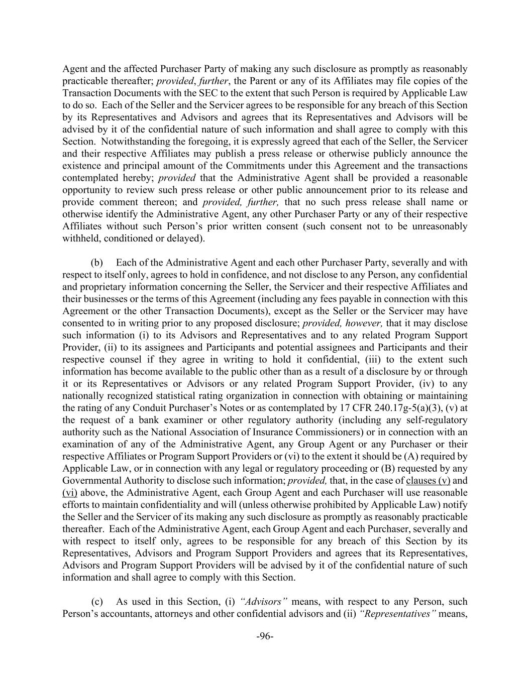 -96- Agent and the affected Purchaser Party of making any such disclosure as promptly as reasonably practicable thereafter; provided, further, the Parent or any of its Affiliates may file copies of the Transaction Documents with the SEC to the extent that such Person is required by Applicable Law to do so. Each of the Seller and the Servicer agrees to be responsible for any breach of this Section by its Representatives and Advisors and agrees that its Representatives and Advisors will be advised by it of the confidential nature of such information and shall agree to comply with this Section. Notwithstanding the foregoing, it is expressly agreed that each of the Seller, the Servicer and their respective Affiliates may publish a press release or otherwise publicly announce the existence and principal amount of the Commitments under this Agreement and the transactions contemplated hereby; provided that the Administrative Agent shall be provided a reasonable opportunity to review such press release or other public announcement prior to its release and provide comment thereon; and provided, further, that no such press release shall name or otherwise identify the Administrative Agent, any other Purchaser Party or any of their respective Affiliates without such Person’s prior written consent (such consent not to be unreasonably withheld, conditioned or delayed). (b) Each of the Administrative Agent and each other Purchaser Party, severally and with respect to itself only, agrees to hold in confidence, and not disclose to any Person, any confidential and proprietary information concerning the Seller, the Servicer and their respective Affiliates and their businesses or the terms of this Agreement (including any fees payable in connection with this Agreement or the other Transaction Documents), except as the Seller or the Servicer may have consented to in writing prior to any proposed disclosure; provided, however, that it may disclose such information (i) to its Advisors and Representatives and to any related Program Support Provider, (ii) to its assignees and Participants and potential assignees and Participants and their respective counsel if they agree in writing to hold it confidential, (iii) to the extent such information has become available to the public other than as a result of a disclosure by or through it or its Representatives or Advisors or any related Program Support Provider, (iv) to any nationally recognized statistical rating organization in connection with obtaining or maintaining the rating of any Conduit Purchaser’s Notes or as contemplated by 17 CFR 240.17g-5(a)(3), (v) at the request of a bank examiner or other regulatory authority (including any self-regulatory authority such as the National Association of Insurance Commissioners) or in connection with an examination of any of the Administrative Agent, any Group Agent or any Purchaser or their respective Affiliates or Program Support Providers or (vi) to the extent it should be (A) required by Applicable Law, or in connection with any legal or regulatory proceeding or (B) requested by any Governmental Authority to disclose such information; provided, that, in the case of clauses (v) and (vi) above, the Administrative Agent, each Group Agent and each Purchaser will use reasonable efforts to maintain confidentiality and will (unless otherwise prohibited by Applicable Law) notify the Seller and the Servicer of its making any such disclosure as promptly as reasonably practicable thereafter. Each of the Administrative Agent, each Group Agent and each Purchaser, severally and with respect to itself only, agrees to be responsible for any breach of this Section by its Representatives, Advisors and Program Support Providers and agrees that its Representatives, Advisors and Program Support Providers will be advised by it of the confidential nature of such information and shall agree to comply with this Section. (c) As used in this Section, (i) “Advisors” means, with respect to any Person, such Person’s accountants, attorneys and other confidential advisors and (ii) “Representatives” means,