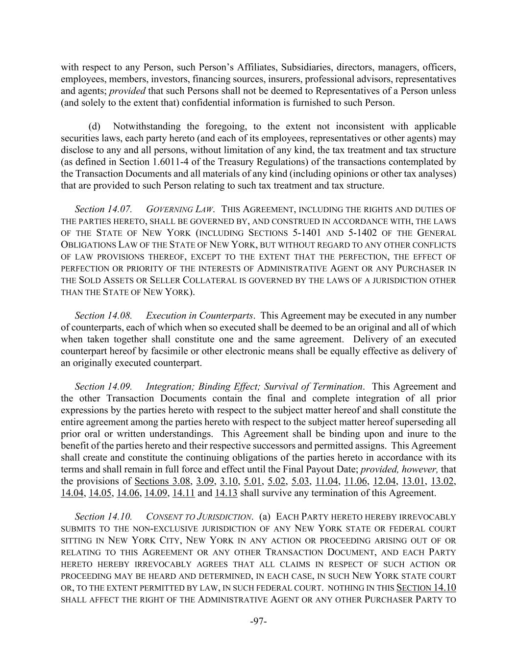 -97- with respect to any Person, such Person’s Affiliates, Subsidiaries, directors, managers, officers, employees, members, investors, financing sources, insurers, professional advisors, representatives and agents; provided that such Persons shall not be deemed to Representatives of a Person unless (and solely to the extent that) confidential information is furnished to such Person. (d) Notwithstanding the foregoing, to the extent not inconsistent with applicable securities laws, each party hereto (and each of its employees, representatives or other agents) may disclose to any and all persons, without limitation of any kind, the tax treatment and tax structure (as defined in Section 1.6011-4 of the Treasury Regulations) of the transactions contemplated by the Transaction Documents and all materials of any kind (including opinions or other tax analyses) that are provided to such Person relating to such tax treatment and tax structure. Section 14.07. GOVERNING LAW. THIS AGREEMENT, INCLUDING THE RIGHTS AND DUTIES OF THE PARTIES HERETO, SHALL BE GOVERNED BY, AND CONSTRUED IN ACCORDANCE WITH, THE LAWS OF THE STATE OF NEW YORK (INCLUDING SECTIONS 5-1401 AND 5-1402 OF THE GENERAL OBLIGATIONS LAW OF THE STATE OF NEW YORK, BUT WITHOUT REGARD TO ANY OTHER CONFLICTS OF LAW PROVISIONS THEREOF, EXCEPT TO THE EXTENT THAT THE PERFECTION, THE EFFECT OF PERFECTION OR PRIORITY OF THE INTERESTS OF ADMINISTRATIVE AGENT OR ANY PURCHASER IN THE SOLD ASSETS OR SELLER COLLATERAL IS GOVERNED BY THE LAWS OF A JURISDICTION OTHER THAN THE STATE OF NEW YORK). Section 14.08. Execution in Counterparts. This Agreement may be executed in any number of counterparts, each of which when so executed shall be deemed to be an original and all of which when taken together shall constitute one and the same agreement. Delivery of an executed counterpart hereof by facsimile or other electronic means shall be equally effective as delivery of an originally executed counterpart. Section 14.09. Integration; Binding Effect; Survival of Termination. This Agreement and the other Transaction Documents contain the final and complete integration of all prior expressions by the parties hereto with respect to the subject matter hereof and shall constitute the entire agreement among the parties hereto with respect to the subject matter hereof superseding all prior oral or written understandings. This Agreement shall be binding upon and inure to the benefit of the parties hereto and their respective successors and permitted assigns. This Agreement shall create and constitute the continuing obligations of the parties hereto in accordance with its terms and shall remain in full force and effect until the Final Payout Date; provided, however, that the provisions of Sections 3.08, 3.09, 3.10, 5.01, 5.02, 5.03, 11.04, 11.06, 12.04, 13.01, 13.02, 14.04, 14.05, 14.06, 14.09, 14.11 and 14.13 shall survive any termination of this Agreement. Section 14.10. CONSENT TO JURISDICTION. (a) EACH PARTY HERETO HEREBY IRREVOCABLY SUBMITS TO THE NON-EXCLUSIVE JURISDICTION OF ANY NEW YORK STATE OR FEDERAL COURT SITTING IN NEW YORK CITY, NEW YORK IN ANY ACTION OR PROCEEDING ARISING OUT OF OR RELATING TO THIS AGREEMENT OR ANY OTHER TRANSACTION DOCUMENT, AND EACH PARTY HERETO HEREBY IRREVOCABLY AGREES THAT ALL CLAIMS IN RESPECT OF SUCH ACTION OR PROCEEDING MAY BE HEARD AND DETERMINED, IN EACH CASE, IN SUCH NEW YORK STATE COURT OR, TO THE EXTENT PERMITTED BY LAW, IN SUCH FEDERAL COURT. NOTHING IN THIS SECTION 14.10 SHALL AFFECT THE RIGHT OF THE ADMINISTRATIVE AGENT OR ANY OTHER PURCHASER PARTY TO