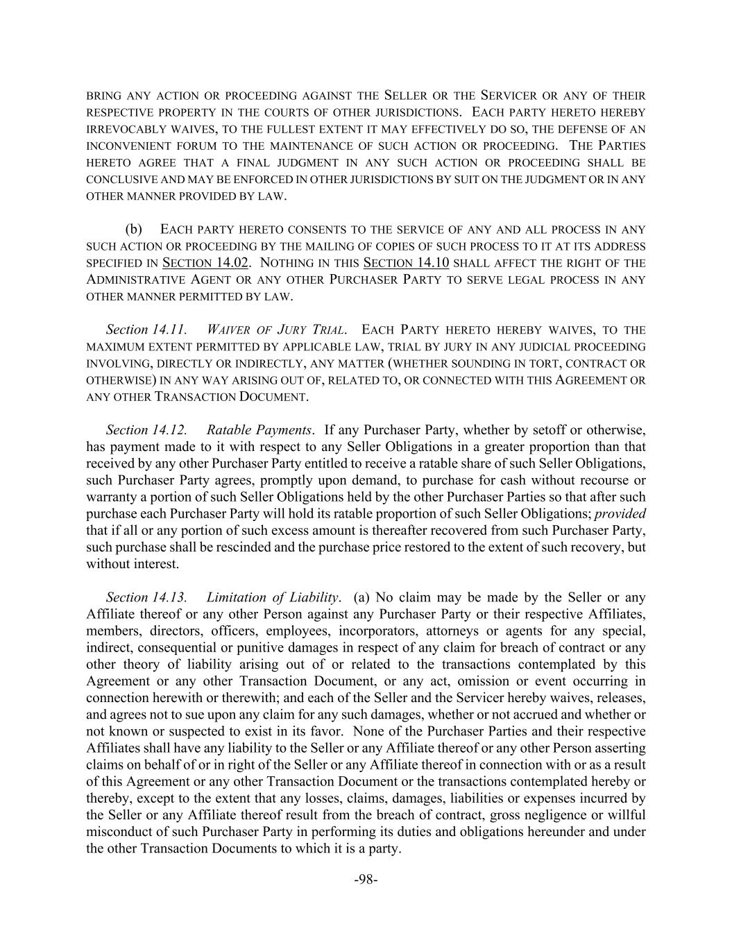 -98- BRING ANY ACTION OR PROCEEDING AGAINST THE SELLER OR THE SERVICER OR ANY OF THEIR RESPECTIVE PROPERTY IN THE COURTS OF OTHER JURISDICTIONS. EACH PARTY HERETO HEREBY IRREVOCABLY WAIVES, TO THE FULLEST EXTENT IT MAY EFFECTIVELY DO SO, THE DEFENSE OF AN INCONVENIENT FORUM TO THE MAINTENANCE OF SUCH ACTION OR PROCEEDING. THE PARTIES HERETO AGREE THAT A FINAL JUDGMENT IN ANY SUCH ACTION OR PROCEEDING SHALL BE CONCLUSIVE AND MAY BE ENFORCED IN OTHER JURISDICTIONS BY SUIT ON THE JUDGMENT OR IN ANY OTHER MANNER PROVIDED BY LAW. (b) EACH PARTY HERETO CONSENTS TO THE SERVICE OF ANY AND ALL PROCESS IN ANY SUCH ACTION OR PROCEEDING BY THE MAILING OF COPIES OF SUCH PROCESS TO IT AT ITS ADDRESS SPECIFIED IN SECTION 14.02. NOTHING IN THIS SECTION 14.10 SHALL AFFECT THE RIGHT OF THE ADMINISTRATIVE AGENT OR ANY OTHER PURCHASER PARTY TO SERVE LEGAL PROCESS IN ANY OTHER MANNER PERMITTED BY LAW. Section 14.11. WAIVER OF JURY TRIAL. EACH PARTY HERETO HEREBY WAIVES, TO THE MAXIMUM EXTENT PERMITTED BY APPLICABLE LAW, TRIAL BY JURY IN ANY JUDICIAL PROCEEDING INVOLVING, DIRECTLY OR INDIRECTLY, ANY MATTER (WHETHER SOUNDING IN TORT, CONTRACT OR OTHERWISE) IN ANY WAY ARISING OUT OF, RELATED TO, OR CONNECTED WITH THIS AGREEMENT OR ANY OTHER TRANSACTION DOCUMENT. Section 14.12. Ratable Payments. If any Purchaser Party, whether by setoff or otherwise, has payment made to it with respect to any Seller Obligations in a greater proportion than that received by any other Purchaser Party entitled to receive a ratable share of such Seller Obligations, such Purchaser Party agrees, promptly upon demand, to purchase for cash without recourse or warranty a portion of such Seller Obligations held by the other Purchaser Parties so that after such purchase each Purchaser Party will hold its ratable proportion of such Seller Obligations; provided that if all or any portion of such excess amount is thereafter recovered from such Purchaser Party, such purchase shall be rescinded and the purchase price restored to the extent of such recovery, but without interest. Section 14.13. Limitation of Liability. (a) No claim may be made by the Seller or any Affiliate thereof or any other Person against any Purchaser Party or their respective Affiliates, members, directors, officers, employees, incorporators, attorneys or agents for any special, indirect, consequential or punitive damages in respect of any claim for breach of contract or any other theory of liability arising out of or related to the transactions contemplated by this Agreement or any other Transaction Document, or any act, omission or event occurring in connection herewith or therewith; and each of the Seller and the Servicer hereby waives, releases, and agrees not to sue upon any claim for any such damages, whether or not accrued and whether or not known or suspected to exist in its favor. None of the Purchaser Parties and their respective Affiliates shall have any liability to the Seller or any Affiliate thereof or any other Person asserting claims on behalf of or in right of the Seller or any Affiliate thereof in connection with or as a result of this Agreement or any other Transaction Document or the transactions contemplated hereby or thereby, except to the extent that any losses, claims, damages, liabilities or expenses incurred by the Seller or any Affiliate thereof result from the breach of contract, gross negligence or willful misconduct of such Purchaser Party in performing its duties and obligations hereunder and under the other Transaction Documents to which it is a party.