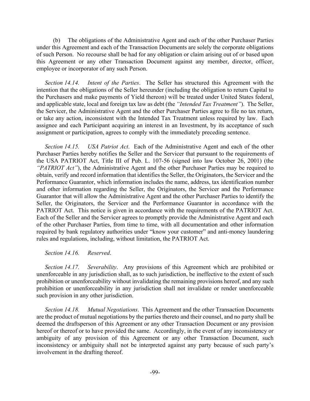 -99- (b) The obligations of the Administrative Agent and each of the other Purchaser Parties under this Agreement and each of the Transaction Documents are solely the corporate obligations of such Person. No recourse shall be had for any obligation or claim arising out of or based upon this Agreement or any other Transaction Document against any member, director, officer, employee or incorporator of any such Person. Section 14.14. Intent of the Parties. The Seller has structured this Agreement with the intention that the obligations of the Seller hereunder (including the obligation to return Capital to the Purchasers and make payments of Yield thereon) will be treated under United States federal, and applicable state, local and foreign tax law as debt (the “Intended Tax Treatment”). The Seller, the Servicer, the Administrative Agent and the other Purchaser Parties agree to file no tax return, or take any action, inconsistent with the Intended Tax Treatment unless required by law. Each assignee and each Participant acquiring an interest in an Investment, by its acceptance of such assignment or participation, agrees to comply with the immediately preceding sentence. Section 14.15. USA Patriot Act. Each of the Administrative Agent and each of the other Purchaser Parties hereby notifies the Seller and the Servicer that pursuant to the requirements of the USA PATRIOT Act, Title III of Pub. L. 107-56 (signed into law October 26, 2001) (the “PATRIOT Act”), the Administrative Agent and the other Purchaser Parties may be required to obtain, verify and record information that identifies the Seller, the Originators, the Servicer and the Performance Guarantor, which information includes the name, address, tax identification number and other information regarding the Seller, the Originators, the Servicer and the Performance Guarantor that will allow the Administrative Agent and the other Purchaser Parties to identify the Seller, the Originators, the Servicer and the Performance Guarantor in accordance with the PATRIOT Act. This notice is given in accordance with the requirements of the PATRIOT Act. Each of the Seller and the Servicer agrees to promptly provide the Administrative Agent and each of the other Purchaser Parties, from time to time, with all documentation and other information required by bank regulatory authorities under “know your customer” and anti-money laundering rules and regulations, including, without limitation, the PATRIOT Act. Section 14.16. Reserved. Section 14.17. Severability. Any provisions of this Agreement which are prohibited or unenforceable in any jurisdiction shall, as to such jurisdiction, be ineffective to the extent of such prohibition or unenforceability without invalidating the remaining provisions hereof, and any such prohibition or unenforceability in any jurisdiction shall not invalidate or render unenforceable such provision in any other jurisdiction. Section 14.18. Mutual Negotiations. This Agreement and the other Transaction Documents are the product of mutual negotiations by the parties thereto and their counsel, and no party shall be deemed the draftsperson of this Agreement or any other Transaction Document or any provision hereof or thereof or to have provided the same. Accordingly, in the event of any inconsistency or ambiguity of any provision of this Agreement or any other Transaction Document, such inconsistency or ambiguity shall not be interpreted against any party because of such party’s involvement in the drafting thereof.