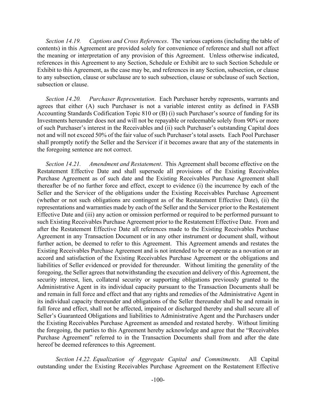 -100- Section 14.19. Captions and Cross References. The various captions (including the table of contents) in this Agreement are provided solely for convenience of reference and shall not affect the meaning or interpretation of any provision of this Agreement. Unless otherwise indicated, references in this Agreement to any Section, Schedule or Exhibit are to such Section Schedule or Exhibit to this Agreement, as the case may be, and references in any Section, subsection, or clause to any subsection, clause or subclause are to such subsection, clause or subclause of such Section, subsection or clause. Section 14.20. Purchaser Representation. Each Purchaser hereby represents, warrants and agrees that either (A) such Purchaser is not a variable interest entity as defined in FASB Accounting Standards Codification Topic 810 or (B) (i) such Purchaser’s source of funding for its Investments hereunder does not and will not be repayable or redeemable solely from 90% or more of such Purchaser’s interest in the Receivables and (ii) such Purchaser’s outstanding Capital does not and will not exceed 50% of the fair value of such Purchaser’s total assets. Each Pool Purchaser shall promptly notify the Seller and the Servicer if it becomes aware that any of the statements in the foregoing sentence are not correct. Section 14.21. Amendment and Restatement. This Agreement shall become effective on the Restatement Effective Date and shall supersede all provisions of the Existing Receivables Purchase Agreement as of such date and the Existing Receivables Purchase Agreement shall thereafter be of no further force and effect, except to evidence (i) the incurrence by each of the Seller and the Servicer of the obligations under the Existing Receivables Purchase Agreement (whether or not such obligations are contingent as of the Restatement Effective Date), (ii) the representations and warranties made by each of the Seller and the Servicer prior to the Restatement Effective Date and (iii) any action or omission performed or required to be performed pursuant to such Existing Receivables Purchase Agreement prior to the Restatement Effective Date. From and after the Restatement Effective Date all references made to the Existing Receivables Purchase Agreement in any Transaction Document or in any other instrument or document shall, without further action, be deemed to refer to this Agreement. This Agreement amends and restates the Existing Receivables Purchase Agreement and is not intended to be or operate as a novation or an accord and satisfaction of the Existing Receivables Purchase Agreement or the obligations and liabilities of Seller evidenced or provided for thereunder. Without limiting the generality of the foregoing, the Seller agrees that notwithstanding the execution and delivery of this Agreement, the security interest, lien, collateral security or supporting obligations previously granted to the Administrative Agent in its individual capacity pursuant to the Transaction Documents shall be and remain in full force and effect and that any rights and remedies of the Administrative Agent in its individual capacity thereunder and obligations of the Seller thereunder shall be and remain in full force and effect, shall not be affected, impaired or discharged thereby and shall secure all of Seller’s Guaranteed Obligations and liabilities to Administrative Agent and the Purchasers under the Existing Receivables Purchase Agreement as amended and restated hereby. Without limiting the foregoing, the parties to this Agreement hereby acknowledge and agree that the “Receivables Purchase Agreement” referred to in the Transaction Documents shall from and after the date hereof be deemed references to this Agreement. Section 14.22. Equalization of Aggregate Capital and Commitments. All Capital outstanding under the Existing Receivables Purchase Agreement on the Restatement Effective