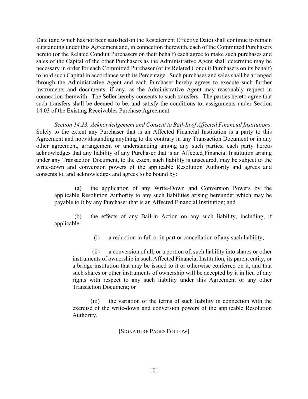 -101- Date (and which has not been satisfied on the Restatement Effective Date) shall continue to remain outstanding under this Agreement and, in connection therewith, each of the Committed Purchasers hereto (or the Related Conduit Purchasers on their behalf) each agree to make such purchases and sales of the Capital of the other Purchasers as the Administrative Agent shall determine may be necessary in order for each Committed Purchaser (or its Related Conduit Purchasers on its behalf) to hold such Capital in accordance with its Percentage. Such purchases and sales shall be arranged through the Administrative Agent and each Purchaser hereby agrees to execute such further instruments and documents, if any, as the Administrative Agent may reasonably request in connection therewith. The Seller hereby consents to such transfers. The parties hereto agree that such transfers shall be deemed to be, and satisfy the conditions to, assignments under Section 14.03 of the Existing Receivables Purchase Agreement. Section 14.23. Acknowledgement and Consent to Bail-In of Affected Financial Institutions. Solely to the extent any Purchaser that is an Affected Financial Institution is a party to this Agreement and notwithstanding anything to the contrary in any Transaction Document or in any other agreement, arrangement or understanding among any such parties, each party hereto acknowledges that any liability of any Purchaser that is an Affected Financial Institution arising under any Transaction Document, to the extent such liability is unsecured, may be subject to the write-down and conversion powers of the applicable Resolution Authority and agrees and consents to, and acknowledges and agrees to be bound by: (a) the application of any Write-Down and Conversion Powers by the applicable Resolution Authority to any such liabilities arising hereunder which may be payable to it by any Purchaser that is an Affected Financial Institution; and (b) the effects of any Bail-in Action on any such liability, including, if applicable: (i) a reduction in full or in part or cancellation of any such liability; (ii) a conversion of all, or a portion of, such liability into shares or other instruments of ownership in such Affected Financial Institution, its parent entity, or a bridge institution that may be issued to it or otherwise conferred on it, and that such shares or other instruments of ownership will be accepted by it in lieu of any rights with respect to any such liability under this Agreement or any other Transaction Document; or (iii) the variation of the terms of such liability in connection with the exercise of the write-down and conversion powers of the applicable Resolution Authority. [SIGNATURE PAGES FOLLOW]