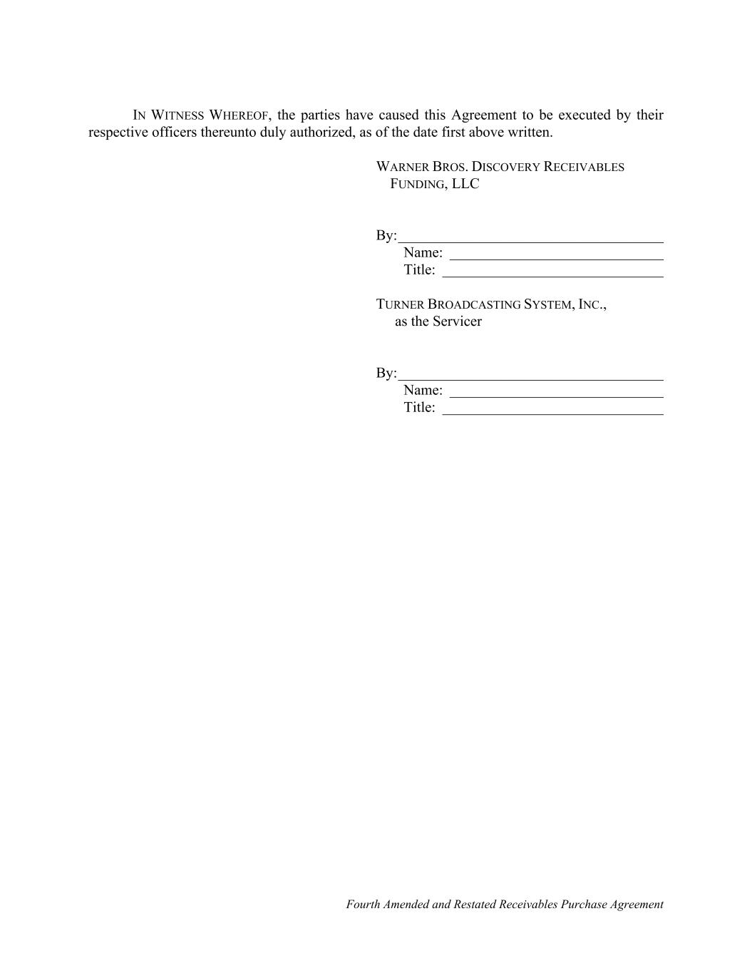 Fourth Amended and Restated Receivables Purchase Agreement IN WITNESS WHEREOF, the parties have caused this Agreement to be executed by their respective officers thereunto duly authorized, as of the date first above written. WARNER BROS. DISCOVERY RECEIVABLES FUNDING, LLC By:____________________________________ Name: _____________________________ Title: ______________________________ TURNER BROADCASTING SYSTEM, INC., as the Servicer By:____________________________________ Name: _____________________________ Title: ______________________________
