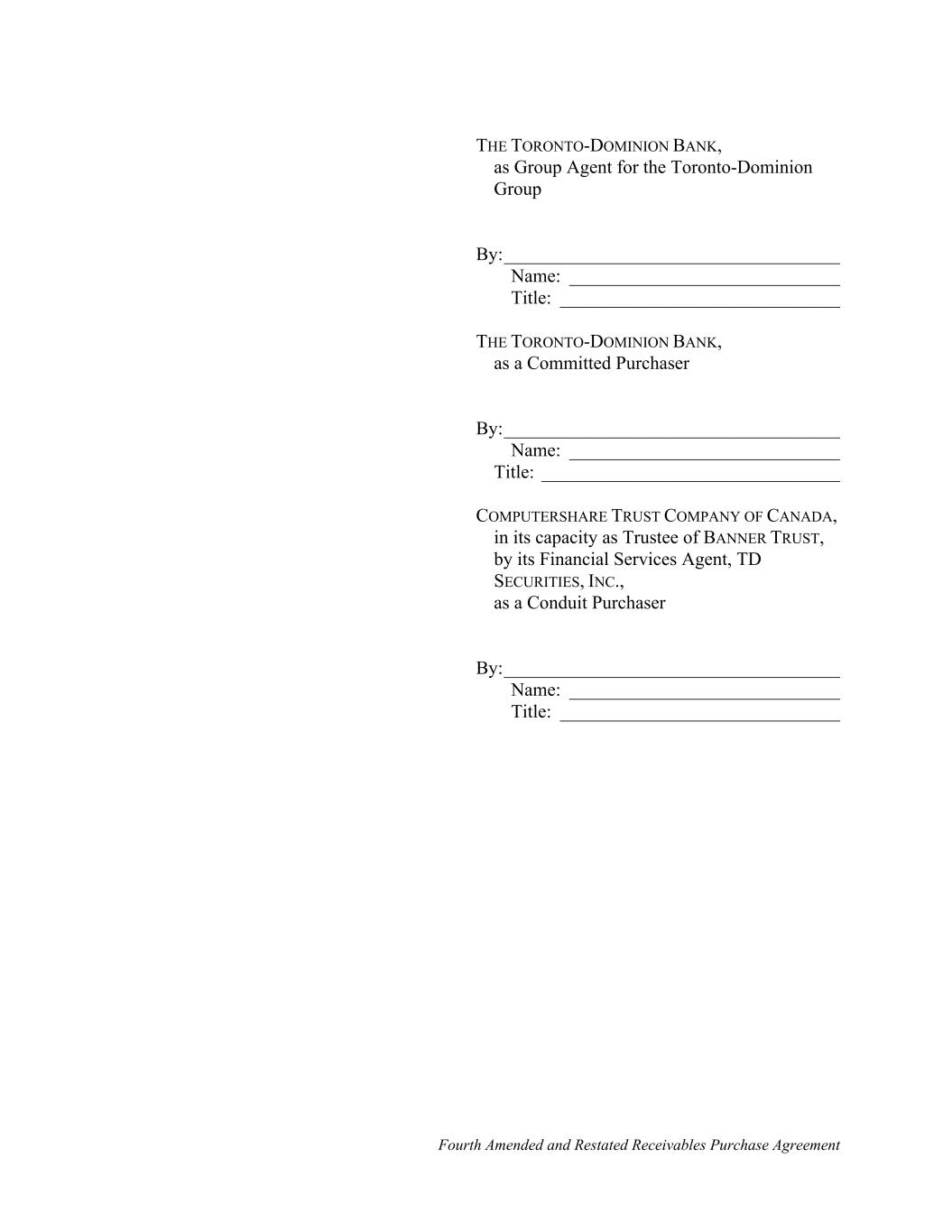 Fourth Amended and Restated Receivables Purchase Agreement THE TORONTO-DOMINION BANK, as Group Agent for the Toronto-Dominion Group By:____________________________________ Name: _____________________________ Title: ______________________________ THE TORONTO-DOMINION BANK, as a Committed Purchaser By:____________________________________ Name: _____________________________ Title: ________________________________ COMPUTERSHARE TRUST COMPANY OF CANADA, in its capacity as Trustee of BANNER TRUST, by its Financial Services Agent, TD SECURITIES, INC., as a Conduit Purchaser By:____________________________________ Name: _____________________________ Title: ______________________________