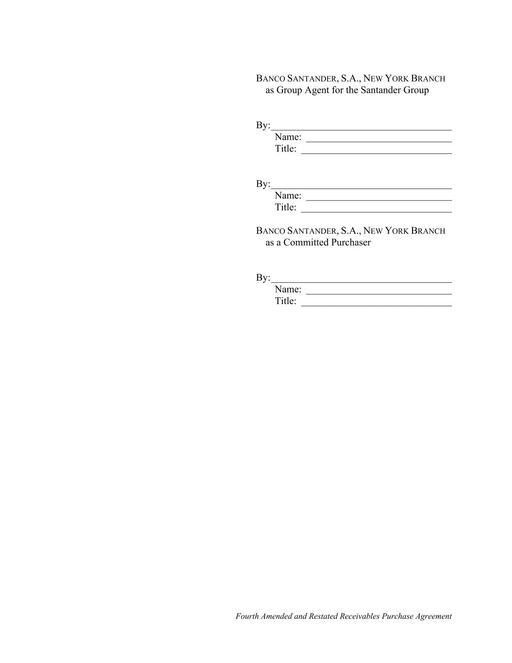 Fourth Amended and Restated Receivables Purchase Agreement BANCO SANTANDER, S.A., NEW YORK BRANCH as Group Agent for the Santander Group By:____________________________________ Name: _____________________________ Title: ______________________________ By:____________________________________ Name: _____________________________ Title: ______________________________ BANCO SANTANDER, S.A., NEW YORK BRANCH as a Committed Purchaser By:____________________________________ Name: _____________________________ Title: ______________________________
