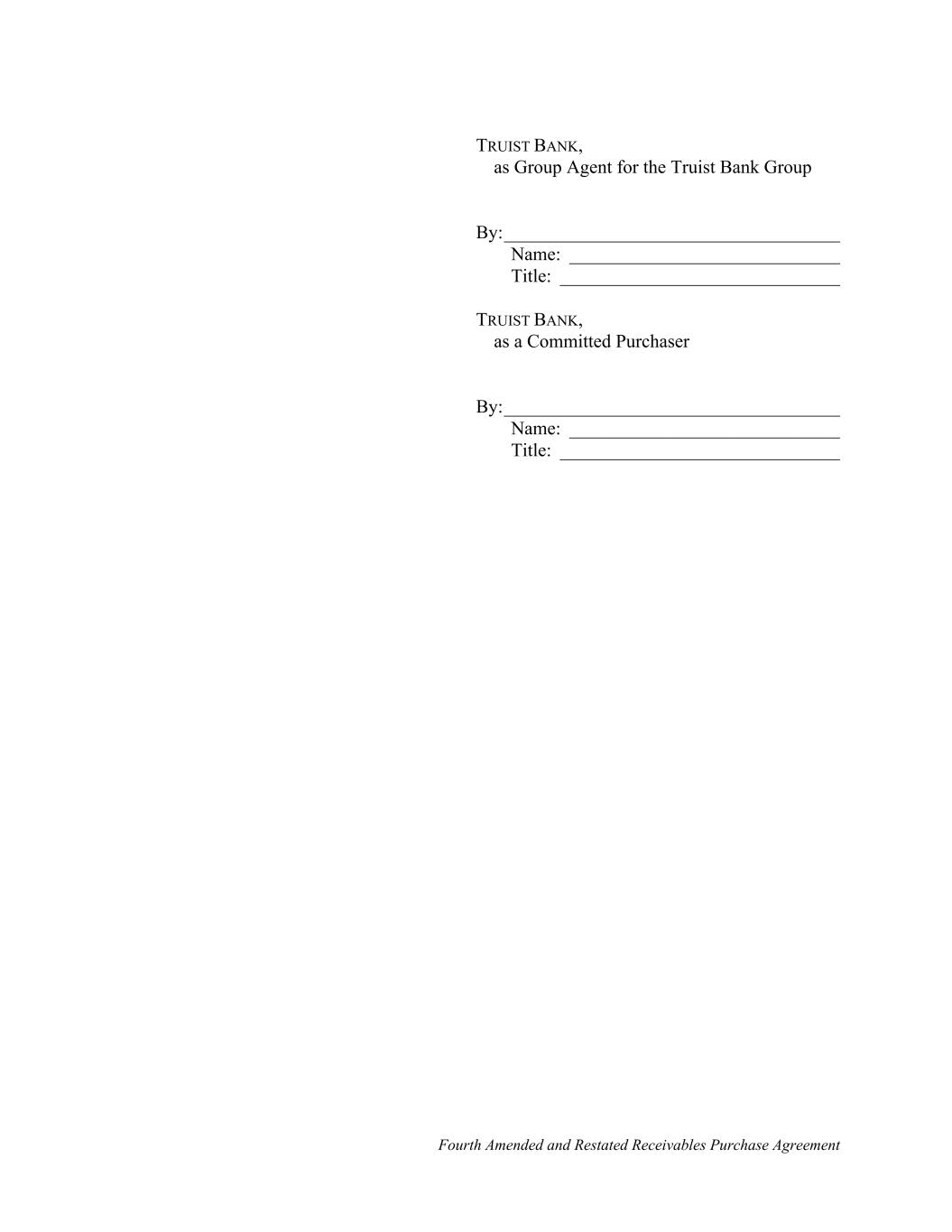Fourth Amended and Restated Receivables Purchase Agreement TRUIST BANK, as Group Agent for the Truist Bank Group By:____________________________________ Name: _____________________________ Title: ______________________________ TRUIST BANK, as a Committed Purchaser By:____________________________________ Name: _____________________________ Title: ______________________________