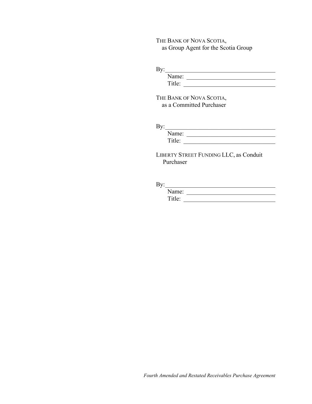 Fourth Amended and Restated Receivables Purchase Agreement THE BANK OF NOVA SCOTIA, as Group Agent for the Scotia Group By:____________________________________ Name: _____________________________ Title: ______________________________ THE BANK OF NOVA SCOTIA, as a Committed Purchaser By:____________________________________ Name: _____________________________ Title: ______________________________ LIBERTY STREET FUNDING LLC, as Conduit Purchaser By:____________________________________ Name: _____________________________ Title: ______________________________