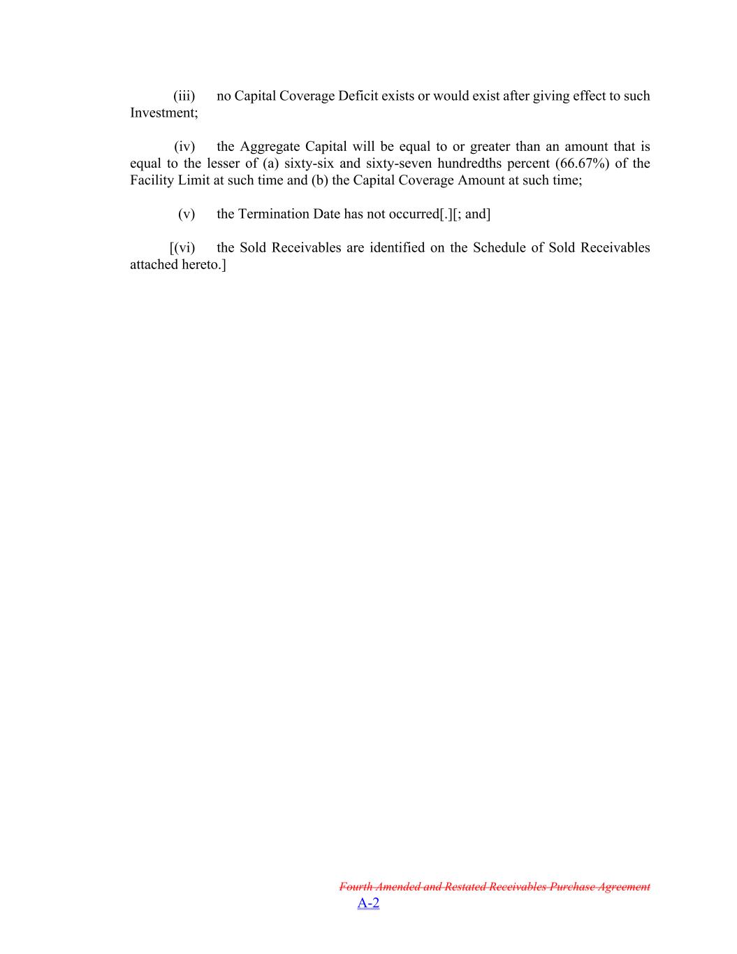 Fourth Amended and Restated Receivables Purchase Agreement A-2 (iii) no Capital Coverage Deficit exists or would exist after giving effect to such Investment; (iv) the Aggregate Capital will be equal to or greater than an amount that is equal to the lesser of (a) sixty-six and sixty-seven hundredths percent (66.67%) of the Facility Limit at such time and (b) the Capital Coverage Amount at such time; (v) the Termination Date has not occurred[.][; and] [(vi) the Sold Receivables are identified on the Schedule of Sold Receivables attached hereto.]